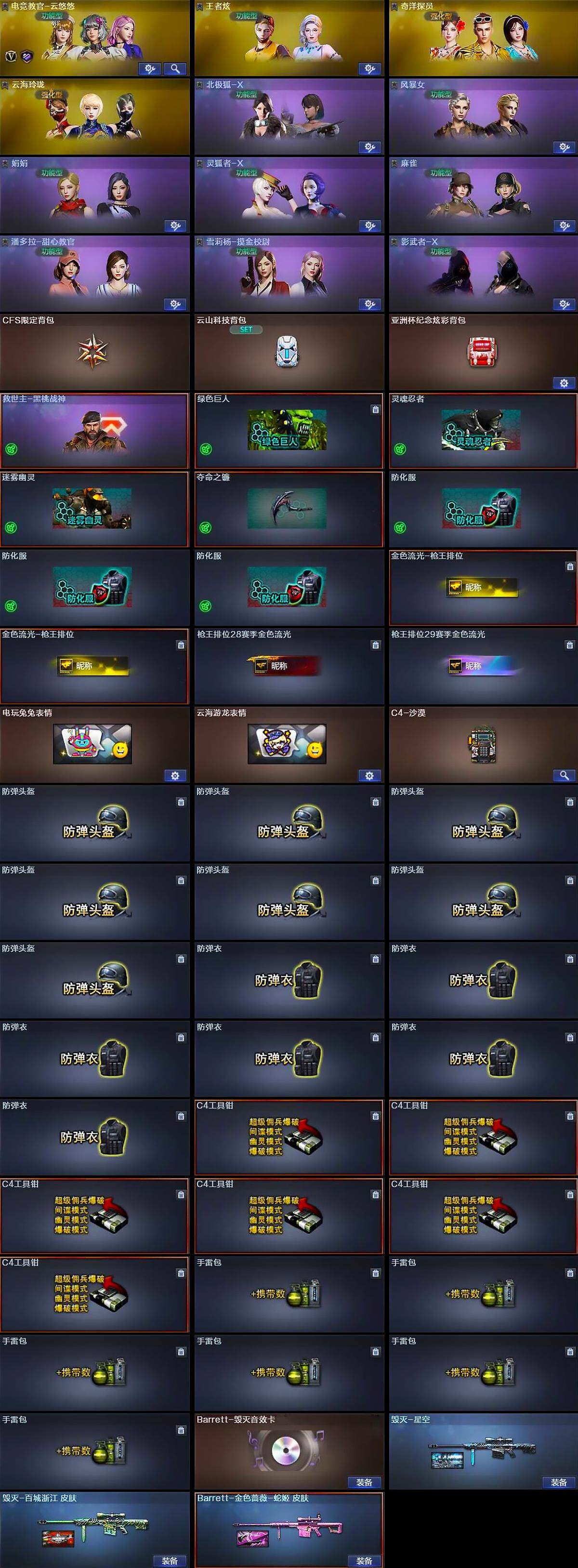 【道具】:CFS限定背包,云山科技背包,亚洲杯纪念炫彩背包,救世主-黑桃战神,绿色巨人,灵魂忍者,迷雾幽灵,夺命之镰,防化服*3,金色流光-枪王排位*2,枪王排位28赛季金色流光,枪王排位29赛季金色流光,电玩兔兔表情,云海游龙表情,C4-沙漠,防弹头盔*7,防弹衣*6,C4工具钳*6,手雷包*6