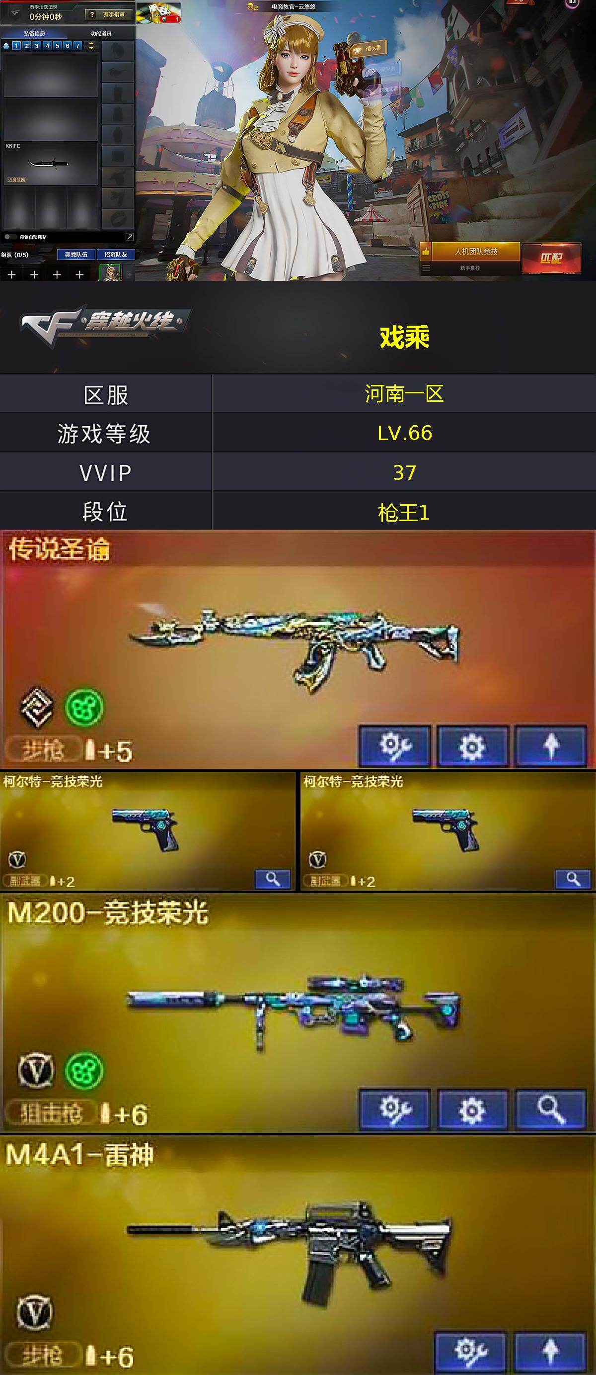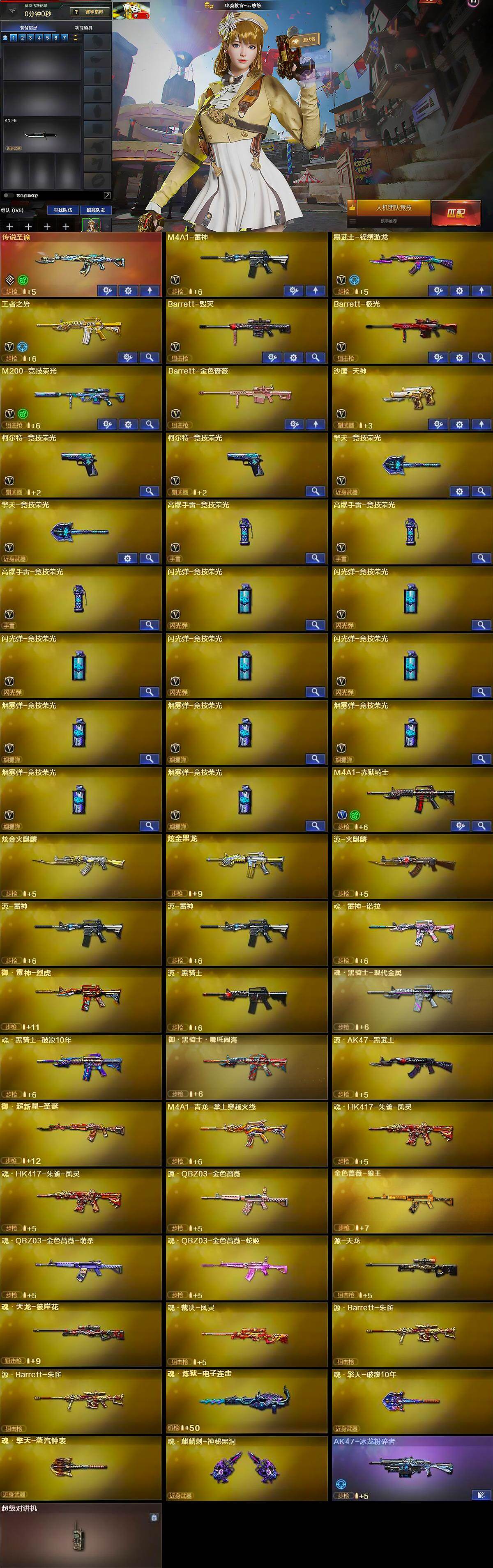 - [12943365]安徽一区-161V-38王者-2炫金 【传说武器】:传说梦魇,传说幽瞳,传说幽冥 【传说角色】:传说艾莉莎 【热门武器】:传说梦魇,传说幽瞳,传说幽冥,QBZ03-金色蔷薇*4,Scar Light-白虎,HK417-朱雀*2,M200-幻神,修罗-古蛇迷踪,M200-竞技荣光*2,荣耀世冠-火麒麟,荣耀世冠-雷神*2,荣耀世冠-柯尔特*6,Kar98K-星神,金色小号,C.A.T,Cat-刀锋,炼狱-迷你小钢,牛牛-AK47*2,M4A1-黑骑士*3,汤姆逊-烈龙*6,RPK-盘龙*4,加特林-炼狱*4,斯泰尔-蝴蝶,王者M4A1-萌萌金发刀锋,毁灭-孙三炮,裁决-雪莉杨,COP-白鲨,USP-雷暴,COP-堕天神,沙鹰-修罗*2,Knife-冠军之刃*2,炽芒蝶刃*3,荣耀世冠-龙啸,金刚伞*9 【王者炫金武器】:炫金天龙*2,王者雷怒,王者凤吟 【音效卡】:M200-幻神音效卡,AK47-火麒麟音效卡,M4A1-雷神音效卡,M4A1-黑龙音效卡,M4A1-黑骑士音效卡,Barrett-毁灭音效卡,Barrett-极光音效卡,QBZ03-金色蔷薇音效卡,AWM-裁决音效卡,Scar Light-白虎音效卡,QBZ03-天罚音效卡,M14EBR-玄武音效卡,70KG语音包 【稀有皮肤】:M200-幻神-黄忠皮肤,幻神-周瑜皮肤,幻神-丹凤,幻神-青鹤,幻神-宠儿-2021MVP,幻神-CFS2022,幻神-Heartshot 皮肤,幻神-曹操 皮肤,星神-巅峰荣耀 皮肤,Scar Light-白虎-暗星,白虎-大汉风骨,QBZ03-传奇宠儿,QBZ03-AG-CFPLS19冠军,金色蔷薇-破浪逐光 皮肤,雷神-荣耀之魄,雷神-耀金皮肤*2,雷神-传奇N9,M4A1-战神赵云,雷神-宠儿-2019MVP,雷神-R.LGD-CFPLS18冠军,雷神-荣耀世冠AG,火麒麟-AG战队皮肤,AK47-火麒麟-传奇EVEN,火麒麟-轻羽皮肤*3,火麒麟-战神关羽,火麒麟-平天大圣,火麒麟-盘古,火麒麟-荣耀世冠AG,火麒麟-百城,黑骑士-冠军之势,黑骑士-伏羲,黑龙-墨子皮肤,黑龙-冠军之武,毁灭耀金皮肤,毁灭-冠军之怒,毁灭-SV-CFPLS16冠军,毁灭-战神张飞,毁灭-BEAN-2020MVP,AWM-天龙-传奇70KG,AWM-天龙-传奇白鲨,天罚-孙权 皮肤,无影