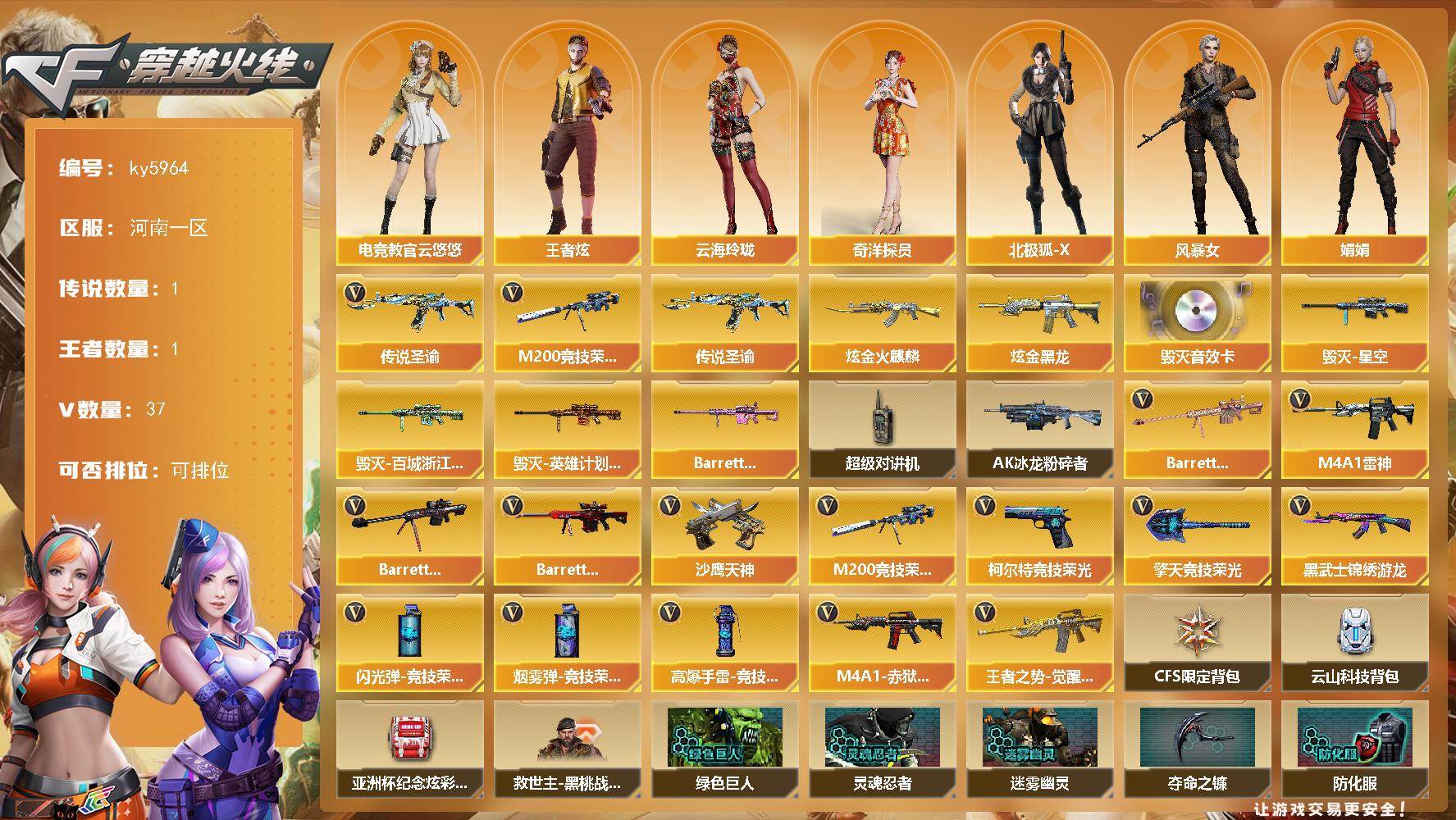 [17105908]河南一区-43V-1王者武器数-2炫金武器数 【传说武器】:传说圣谕 【热门武器】:传说圣谕,M200-竞技荣光 【王者炫金武器】:炫金火麒麟,炫金黑龙 【音效卡】:Barrett-毁灭音效卡 【皮肤】:毁灭-星空,毁灭-百城浙江 皮肤,毁灭-英雄计划 皮肤,Barrett-金色蔷薇-蛇姬 皮肤 【角色】:电竞教官-云悠悠,王者炫,奇洋探员,云海玲珑,北极狐-X,风暴女,娟娟,灵狐者-X,麻雀,潘多拉-甜心教官,兔囡囡,雪莉杨-摸金校尉,影武者-X,智影 【暴走生化】:超级对讲机 【挑战大师】:AK47-冰龙粉碎者 【英雄级武器】:M4A1-雷神,黑武士-锦绣游龙,王者之势-觉醒版,Barrett-毁灭,Barrett-极光,M200-竞技荣光,Barrett-金色蔷薇,沙鹰-天神,柯尔特-竞技荣光*2,擎天-竞技荣光*2,高爆手雷-竞技荣光*3,闪光弹-竞技荣光*5,烟雾弹-竞技荣光*5,M4A1-赤狱骑士 【道具】:CFS限定背包,云山科技背包,亚洲杯纪念炫彩背包,救世主-黑桃战神,绿色巨人,灵魂忍者,迷雾幽灵,夺命之镰,防化服*3,金色流光-枪王排位*2,枪王排位28赛季金色流光,枪王排位29赛季金色流光,电玩兔兔表情,云海游龙表情,C4-沙漠,防弹头盔*7,防弹衣*6,C4工具钳*6,手雷包*6 【特殊枪械】: