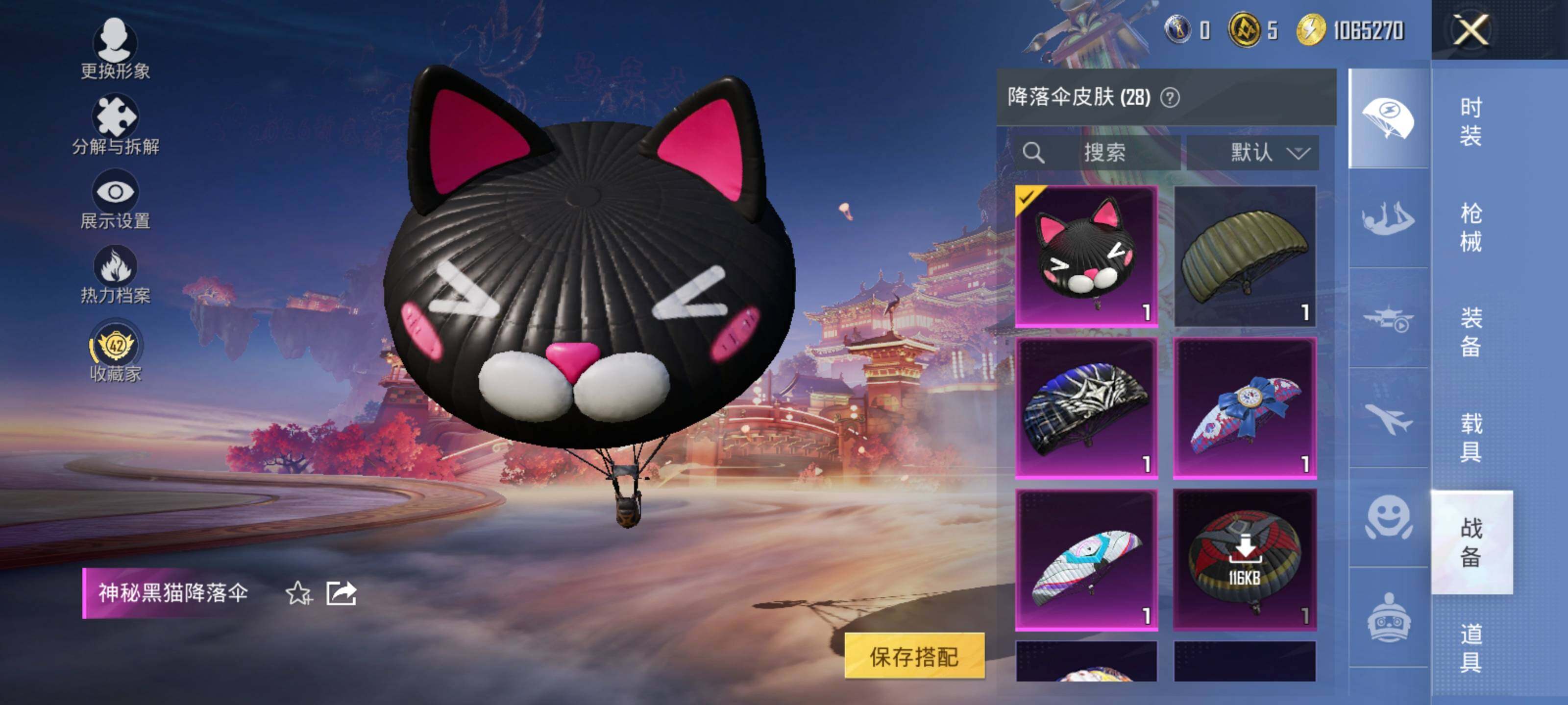 【粉色降落伞】:神秘黑猫降落伞,古堡领主降落伞,四圣焕新降落伞,童趣迷兔降落伞,古战神甲降落伞