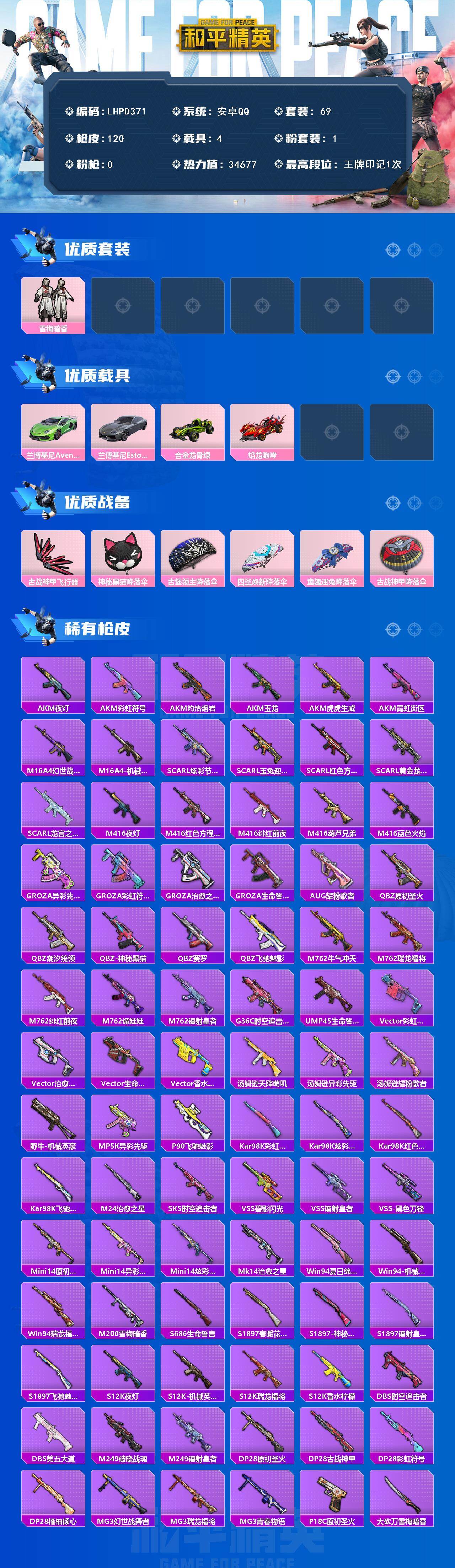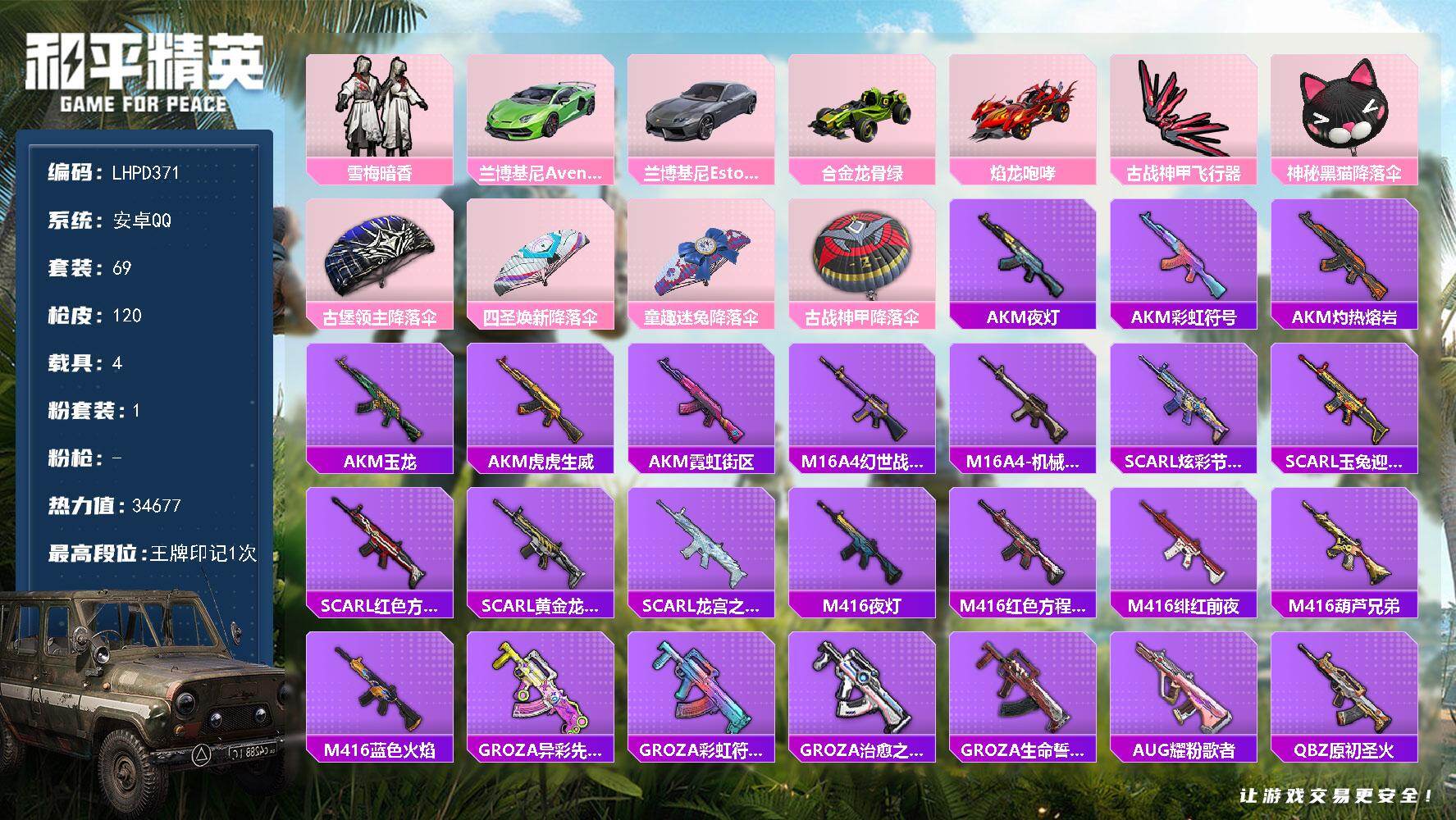 [17152408]【特价出售/店主推荐】安卓 手Q-1粉装-4载具-1粉色飞行器-3·4w热力值-1王牌印记-69套装-120枪皮 【粉色套装】:粉装-雪梅暗香 【粉色载具】:兰博基尼Aventador SVJ(翡翠绿),兰博基尼Estoque(银翼灰),合金龙骨(绿),焰龙咆哮 【粉色飞行器】:古战神甲飞行器 【粉色降落伞】:神秘黑猫降落伞,古堡领主降落伞,四圣焕新降落伞,童趣迷兔降落伞,古战神甲降落伞 【稀有枪皮】:AKM-夜灯,AKM-彩虹符号,AKM-灼热熔岩,AKM-玉龙,AKM-虎虎生威,AKM-霓虹街区,M16A4-幻世战舞者,M16A4-机械英豪,SCAR-L-炫彩节奏,SCAR-L-玉兔迎春,SCAR-L-红色方程式,SCAR-L-黄金龙骨,SCAR-L-龙宫之主,M416-夜灯,M416-红色方程式,M416-绯红前夜,M416-葫芦兄弟,M416-蓝色火焰,GROZA-异彩先驱,GROZA-彩虹符号,GROZA-治愈之星,GROZA-生命誓言,AUG-耀粉歌者,QBZ-原初圣火,QBZ-潮汐统领,QBZ-神秘黑猫,QBZ-赛罗,QBZ-飞驰魅影,M762-牛气冲天,M762-瑞龙福将,M762-绯红前夜,M762-诡娃娃,M762-镭射皇者,G36C-时空追击者,UMP45-生命誓言,Vector-彩虹符号,Vector-治愈之星,Vector-生命誓言,Vector-香水柠檬,汤姆逊-天降萌叽,汤姆逊-异彩先驱,汤姆逊-耀粉歌者,野牛-机械英豪,MP5K-异彩先驱,P90-飞驰魅影,Kar98K-彩虹符号,Kar98K-炫彩节奏,Kar98K-红色方程式,Kar98K-飞驰魅影,M24-治愈之星,SKS-时空追击者,VSS-碧影闪光,VSS-镭射皇者,VSS-黑色刀锋,Mini14-原初圣火,Mini14-异彩先驱,Mini14-炫彩节奏,Mk14-治愈之星,Win94-夏日绵绵冰,Win94-机械英豪,Win94-瑞龙福将,M200-雪梅暗香,S686-生命誓言,S1897-春暖花开,S1897-神秘黑猫,S1897-镭射皇者,S1897-飞驰魅影,S12K-瑞龙福将,S12K-香水柠檬,S12K-夜灯,S12K-机械英豪,DBS-时空追击者,DBS-第五大道,M249-破晓战魂,M249-镭射皇者,DP-28-原初圣火,DP-28-古战神甲,DP-28-