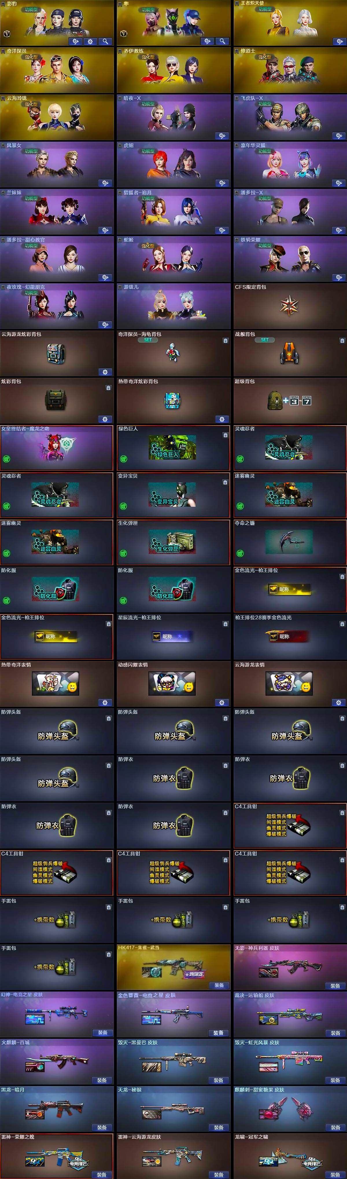 【道具】:CFS限定背包,云海游龙炫彩背包,奇洋探员-海龟背包,战舰背包,炫彩背包,热带奇洋炫彩背包,超级背包,女皇终结者-魔龙之吻,绿色巨人,灵魂忍者*2,变异宝贝,迷雾幽灵*2,生化弹匣,夺命之镰,防化服*2,金色流光-枪王排位*2,星辰流光-枪王排位,枪王排位28赛季金色流光,热带奇洋表情,动感闪耀表情,云海游龙表情,防弹头盔*4,防弹衣*4,C4工具钳*4,手雷包*4