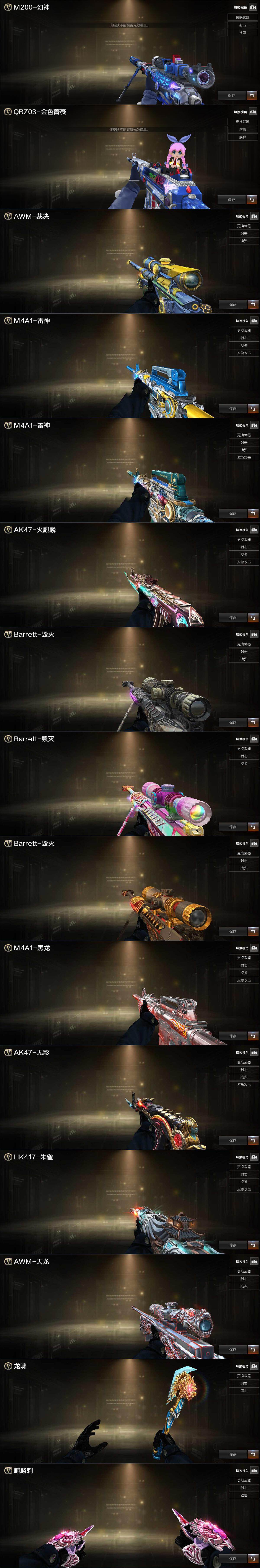 【皮肤】:幻神-电竞之星 皮肤,金色蔷薇-电竞之星 皮肤,裁决-运输船 皮肤,雷神-荣耀之魄,雷神-云海游龙皮肤,火麒麟-百城,毁灭-黑曼巴 皮肤,毁灭-虹光风暴 皮肤,毁灭-英雄计划 皮肤,黑龙-暗月,无影-神兵利器 皮肤,HK417-朱雀-武当,天龙-秘银,龙啸-冠军之啸,麒麟刺-甜蜜糖果 皮肤