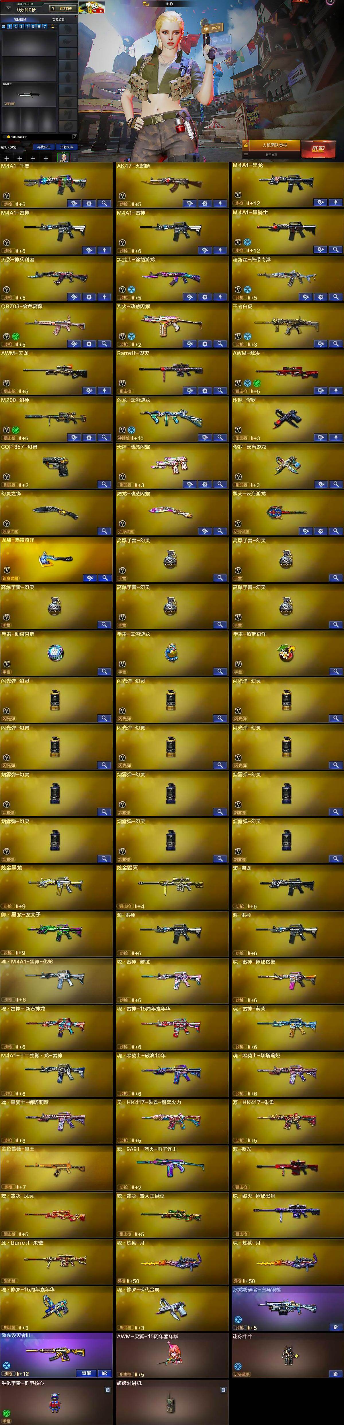 【英雄级武器】:M4A1-千变,AK47-火麒麟,M4A1-黑龙,M4A1-雷神*2,M4A1-黑骑士,无影-神兵利器,黑武士-锦绣游龙,超新星-热带奇洋,QBZ03-金色蔷薇,烈火-动感闪耀,王者白虎-觉醒版,AWM-天龙,Barrett-毁灭,AWM-裁决,M200-幻神,烈龙-云海游龙,沙鹰-修罗,COP 357-幻灵,天神-动感闪耀,修罗-云海游龙,幻灵之锋,屠龙-动感闪耀,擎天-云海游龙,龙啸-热带奇洋,高爆手雷-幻灵*5,手雷-动感闪耀,手雷-云海游龙,手雷-热带奇洋,闪光弹-幻灵*6,烟雾弹-幻灵*6