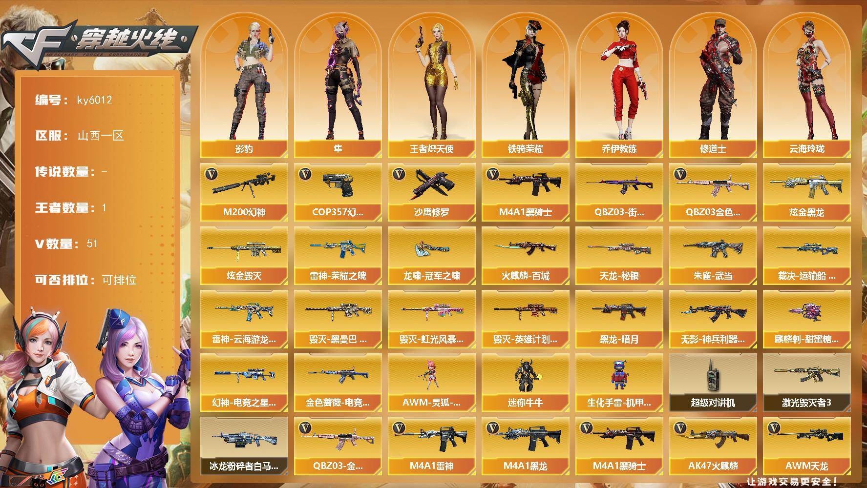 [17154738]山西一区-56V-1王者武器数-2炫金武器数 【热门武器】:QBZ03-金色蔷薇,M200-幻神,QBZ03-街机,M4A1-黑骑士,COP 357-幻灵,沙鹰-修罗 【王者炫金武器】:炫金黑龙,炫金毁灭 【皮肤】:幻神-电竞之星 皮肤,金色蔷薇-电竞之星 皮肤,裁决-运输船 皮肤,雷神-荣耀之魄,雷神-云海游龙皮肤,火麒麟-百城,毁灭-黑曼巴 皮肤,毁灭-虹光风暴 皮肤,毁灭-英雄计划 皮肤,黑龙-暗月,无影-神兵利器 皮肤,HK417-朱雀-武当,天龙-秘银,龙啸-冠军之啸,麒麟刺-甜蜜糖果 皮肤 【角色】:影豹,隼,王者炽天使,奇洋探员,乔伊教练,修道士,云海玲珑,暗夜-X,飞虎队-X,风暴女,虎妞,嘉年华灵狐,兰妹妹,猎狐者-追月,女战神,潘多拉-X,潘多拉-甜心教官,蛇姬,铁骑荣耀,兔囡囡,夜玫瑰-幻能朋克,游珑儿 【人偶武器】:AWM-灵狐-15周年嘉年华,迷你牛牛,生化手雷-机甲核心 【暴走生化】:超级对讲机 【挑战大师】:冰龙粉碎者-白马银枪,激光毁灭者III 【英雄级武器】:M4A1-千变,AK47-火麒麟,M4A1-黑龙,M4A1-雷神*2,M4A1-黑骑士,无影-神兵利器,黑武士-锦绣游龙,超新星-热带奇洋,QBZ03-金色蔷薇,烈火-动感闪耀,王者白虎-觉醒版,AWM-天龙,Barrett-毁灭,AWM-裁决,M200-幻神,烈龙-云海游龙,沙鹰-修罗,COP 357-幻灵,天神-动感闪耀,修罗-云海游龙,幻灵之锋,屠龙-动感闪耀,擎天-云海游龙,龙啸-热带奇洋,高爆手雷-幻灵*5,手雷-动感闪耀,手雷-云海游龙,手雷-热带奇洋,闪光弹-幻灵*6,烟雾弹-幻灵*6 【道具】:CFS限定背包,云海游龙炫彩背包,奇洋探员-海龟背包,战舰背包,炫彩背包,热带奇洋炫彩背包,超级背包,女皇终结者-魔龙之吻,绿色巨人,灵魂忍者*2,变异宝贝,迷雾幽灵*2,生化弹匣,夺命之镰,防化服*2,金色流光-枪王排位*2,星辰流光-枪王排位,枪王排位28赛季金色流光,热带奇洋表情,动感闪耀表情,云海游龙表情,防弹头盔*4,防弹衣*4,C4工具钳*4,手雷包*4 【特殊枪械】:1黑骑士