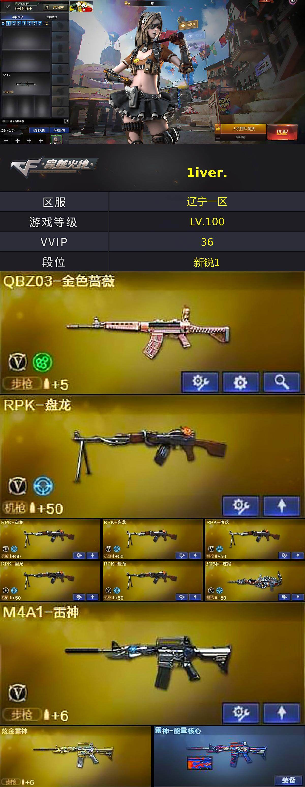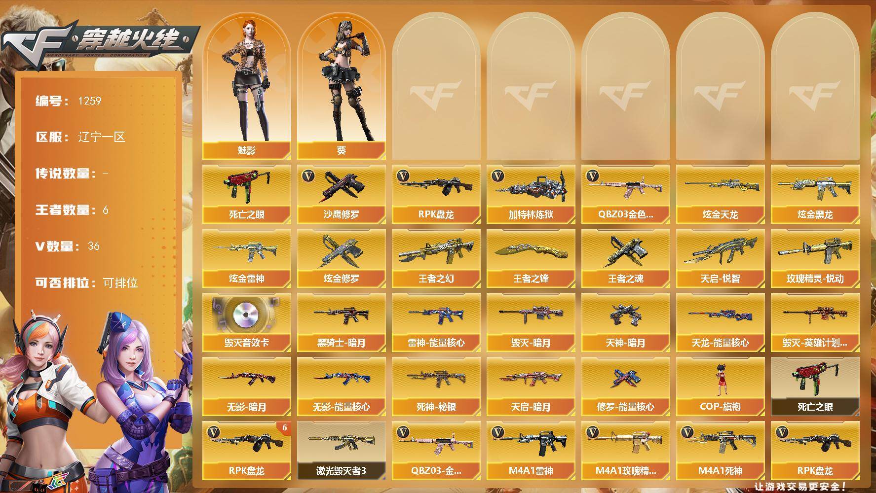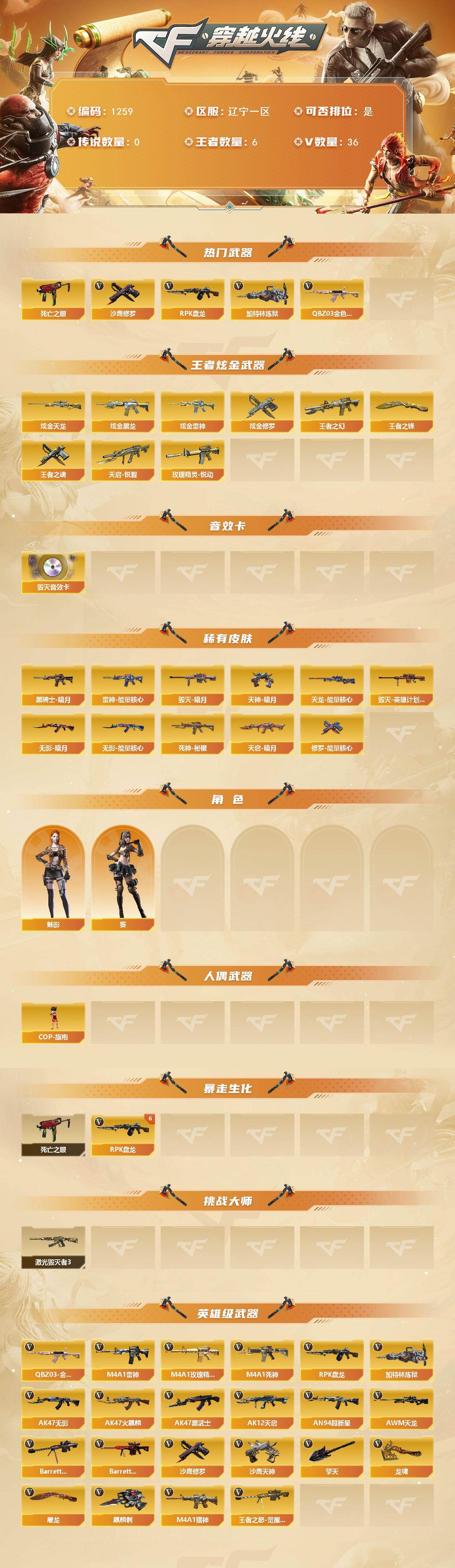 [17155068]辽宁一区-38V-6王者武器数-4炫金武器数 【热门武器】:QBZ03-金色蔷薇,死亡之眼*2,RPK-盘龙*6,加特林-炼狱,沙鹰-修罗*5 【王者炫金武器】:天启-悦智,王者之幻,玫瑰精灵-悦动,王者之魂,王者之锋,炫金黑龙,炫金雷神,炫金天龙,炫金修罗 【音效卡】:Barrett-毁灭音效卡 【皮肤】:雷神-能量核心,毁灭-暗月,毁灭-英雄计划 皮肤,黑骑士-暗月,无影-暗月,无影-能量核心,死神-秘银*2,天启-暗月*2,天龙-能量核心*2,修罗-能量核心*3,天神-暗月*2 【角色】:葵,魅影 【人偶武器】:COP-旗袍 【暴走生化】:死亡之眼*2 【挑战大师】:激光毁灭者III 【英雄级武器】:AK47-火麒麟,M4A1-雷神,AK47-无影,M4A1-死神,AK47-黑武士,AK12-天启,AN94-超新星,M4A1-玫瑰精灵,QBZ03-金色蔷薇,M4A1-猎神,AWM-天龙*2,Barrett-毁灭,Barrett-极光,王者之怒-觉醒版,RPK-盘龙*6,加特林-炼狱,沙鹰-修罗*5,沙鹰-天神*2,屠龙*2,龙啸,擎天*2,麒麟刺 【道具】:战舰背包,炫彩背包,超级背包*2,绿色巨人,灵魂忍者,迷雾幽灵,夺命之镰,防化服*2,防弹头盔*2,防弹衣*2,C4工具钳*2,手雷包*2 【特殊枪械】:6盘龙,1炼狱