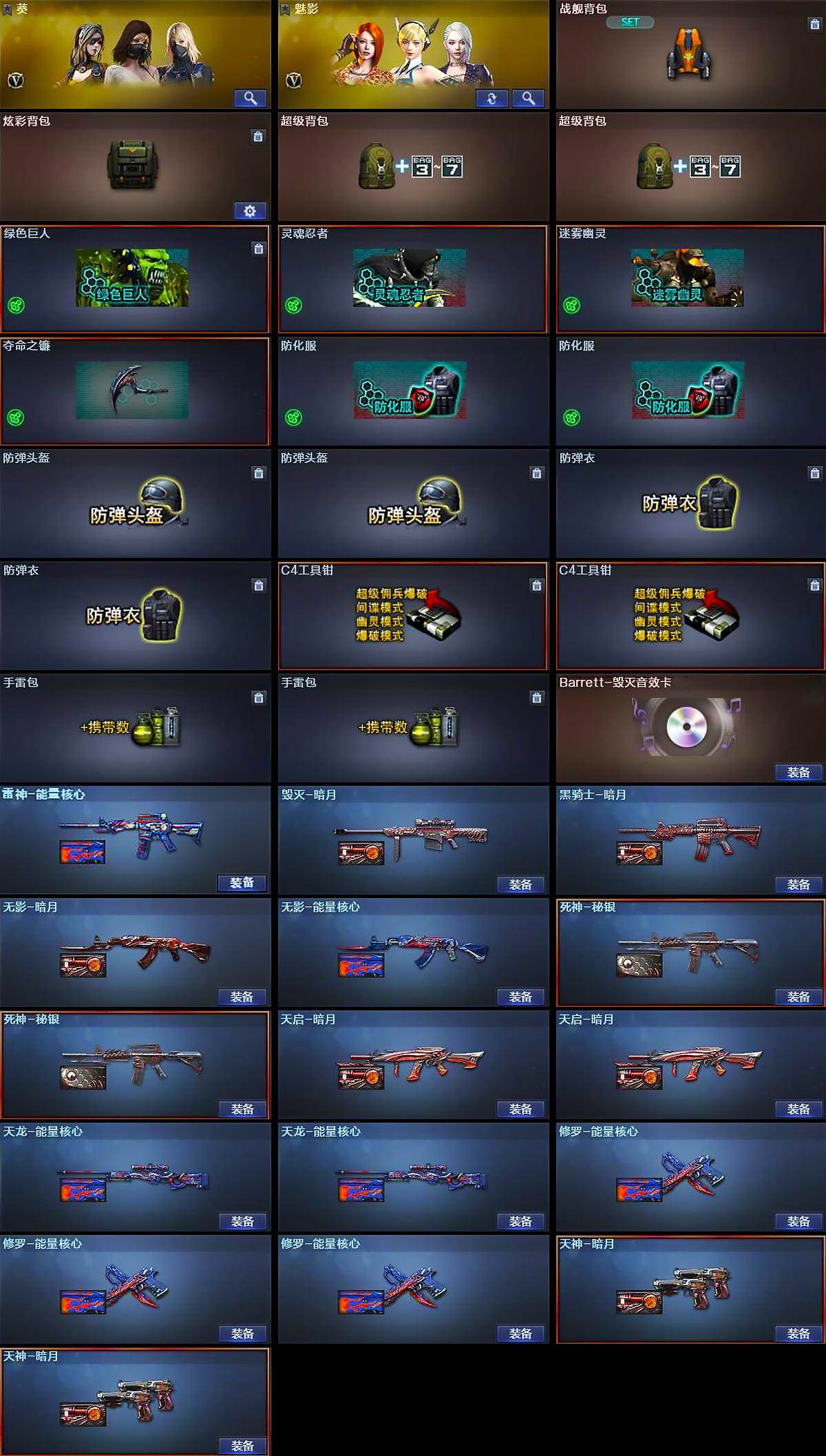 【道具】:战舰背包,炫彩背包,超级背包*2,绿色巨人,灵魂忍者,迷雾幽灵,夺命之镰,防化服*2,防弹头盔*2,防弹衣*2,C4工具钳*2,手雷包*2