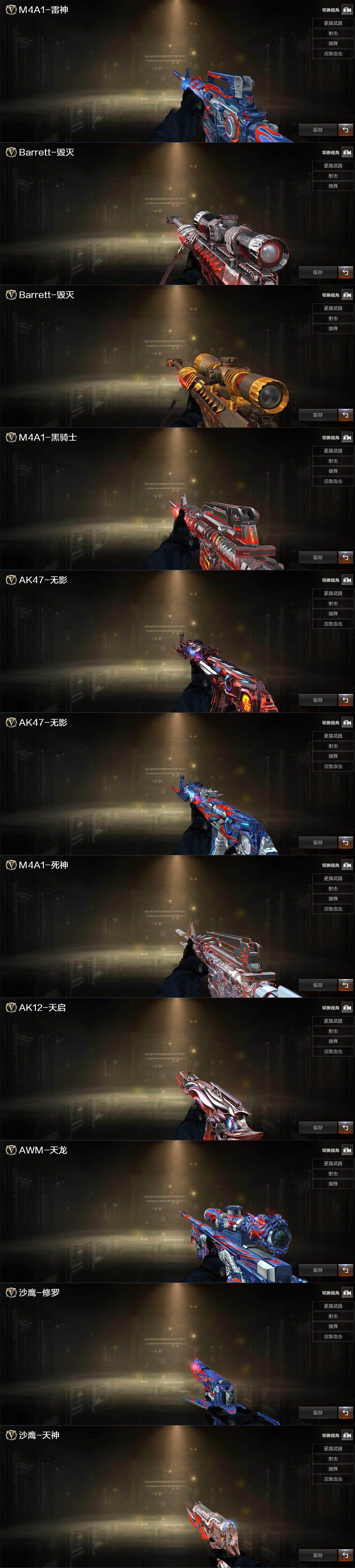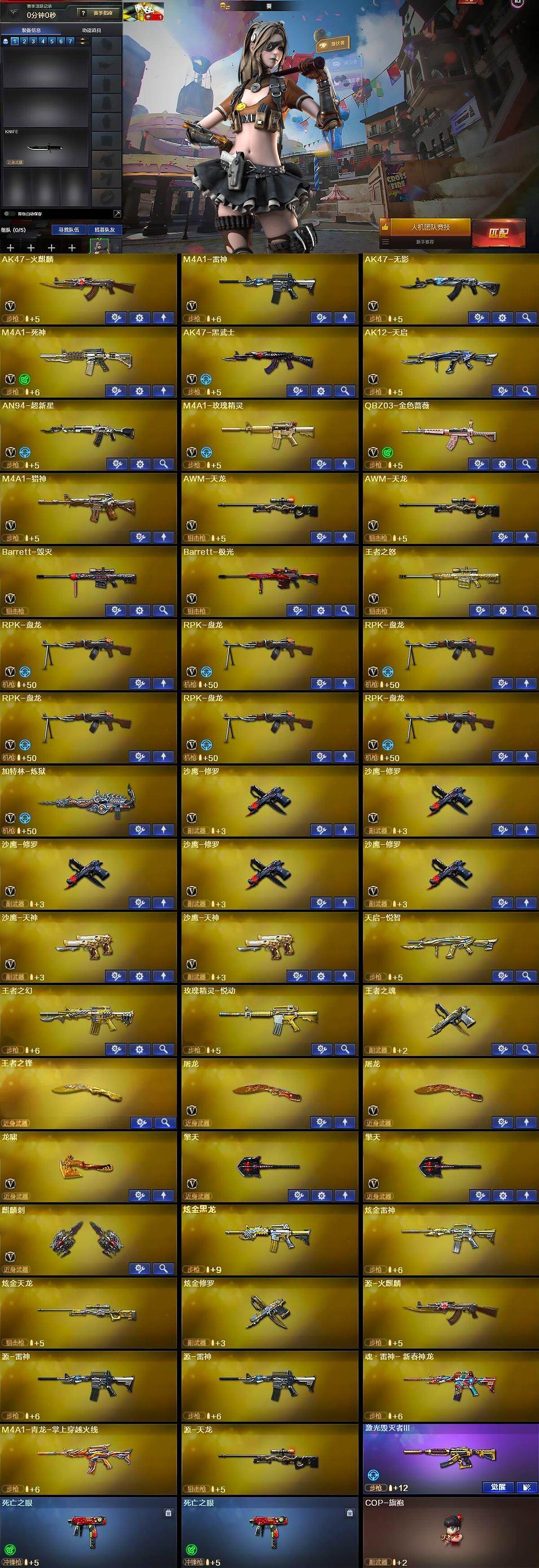 【英雄级武器】:AK47-火麒麟,M4A1-雷神,AK47-无影,M4A1-死神,AK47-黑武士,AK12-天启,AN94-超新星,M4A1-玫瑰精灵,QBZ03-金色蔷薇,M4A1-猎神,AWM-天龙*2,Barrett-毁灭,Barrett-极光,王者之怒-觉醒版,RPK-盘龙*6,加特林-炼狱,沙鹰-修罗*5,沙鹰-天神*2,屠龙*2,龙啸,擎天*2,麒麟刺