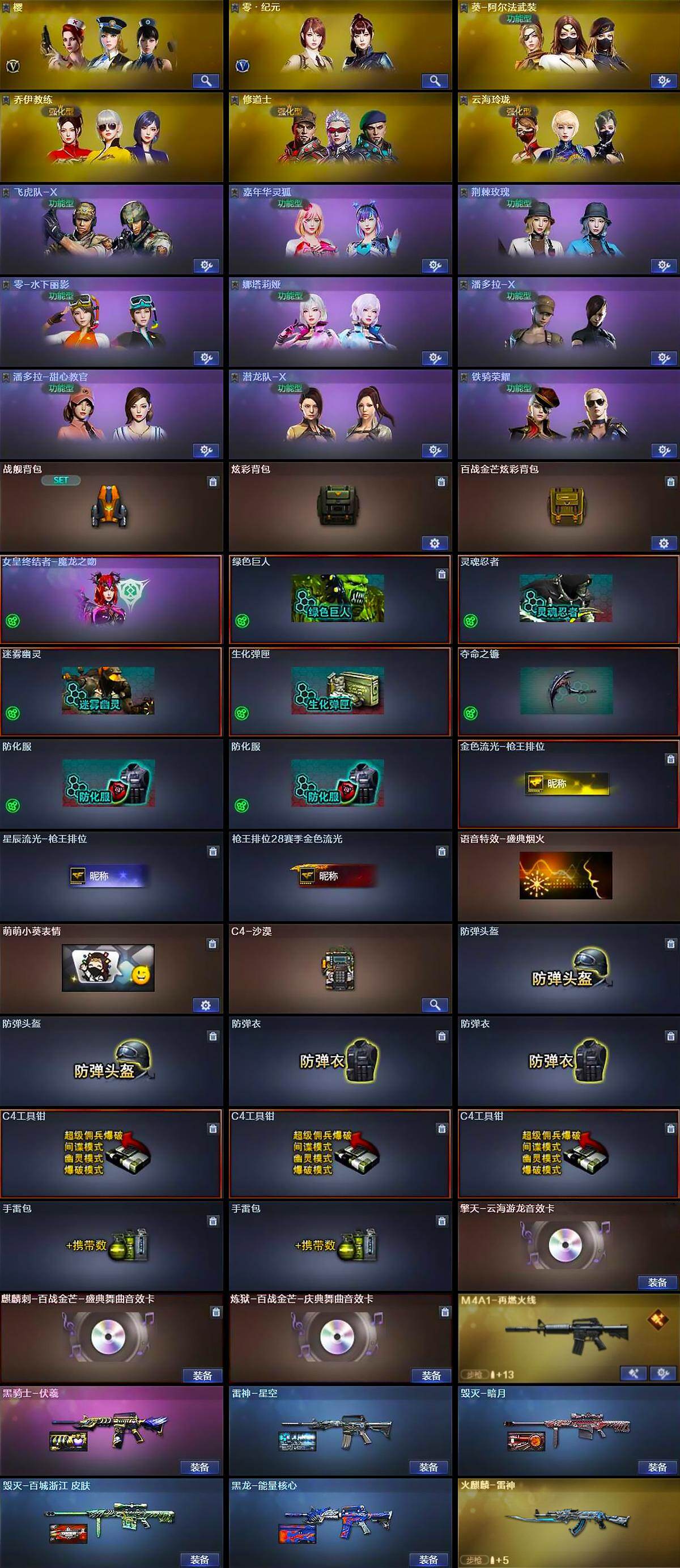 【英雄级武器】:AK47-火麒麟,M4A1-黑龙,M4A1-雷神,M4A1-黑骑士,AK47-黑鲨,黑武士-锦绣游龙,M4A1-玫瑰精灵,QBZ03-金色蔷薇,AK-47-猩红传说,AWM-天龙,Barrett-毁灭,M200-幻神,加特林-炼狱*2,炼狱-百战金芒,汤姆逊-烈龙,沙鹰-修罗*2,沙鹰-天神,屠龙*3,龙啸*2,擎天*2,麒麟刺,麒麟刺-百战金芒,高爆手雷-雷霆,闪光弹-雷霆,烟雾弹-雷霆,烟雾弹-云龙