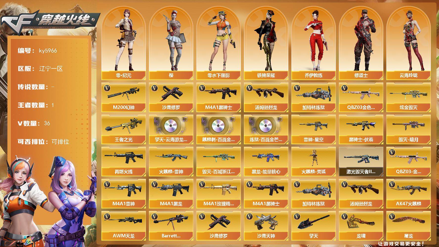 - [13035659]【43】28V/99级/将帅/1王者/QBZ03-金色蔷薇/死亡之眼/M4A1-黑骑士/汤姆逊-烈龙/沙鹰-修罗/王者之魄/M4A1-雷神音效卡/Barrett-毁灭音效卡/M37-葵/COP-旗袍/6烈龙/M4A1-雷神/M4A1-黑龙/AK47-火麒麟/AWM-天龙/Barrett-毁灭/AK47-机械迷城/擎天/屠龙