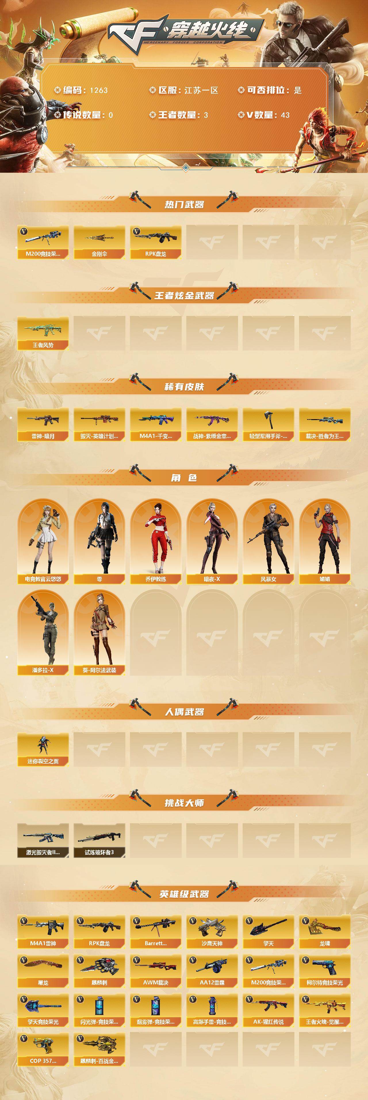 - [16060847]重庆一区-53V-3王者-0炫金 【热门武器】:M200-竞技荣光,死亡之眼,M4A1-黑骑士,裁决-雪莉杨,沙鹰-修罗*3 【王者炫金武器】:王者之影 【音效卡】:M4A1-雷神音效卡,M4A1-黑骑士音效卡,Barrett-毁灭音效卡 【皮肤】:雷神-虎将,雷神-诺拉 皮肤,雷神-神秘按键 皮肤,火麒麟-轻羽皮肤,毁灭耀金皮肤,毁灭-战神张飞,毁灭-英雄计划 皮肤,黑骑士-暗月,AK47-B-常胜将军-曹操,AK47-B-常胜将军-孙权*2,修罗-能量核心,屠龙-春桃 皮肤 【角色】:零,雨棠,电竞教官-云悠悠,王者-魅影,乔伊教练,修道士,初恋灵狐,风暴女,疾风,娟娟,龙儿-小淘气,麻雀,潘多拉-X,潘多拉-甜心教官,雪莉杨-摸金校尉,影武者-X 【人偶武器】:裁决-雪莉杨,AWM-灵狐-15周年嘉年华,闪光弹-小乔,闪光弹-貂蝉,高爆手雷-大乔 【暴走生化】:死亡之眼 【英雄级武器】:AK47-火麒麟*2,M4A1-雷神*2,M4A1-黑骑士,AK-47-猩红传说,黑骑士-海王,AK47-B-常胜将军,Barrett-毁灭,AWM-裁决,M200-竞技荣光,AA-12-雷霆,沙鹰-修罗*3,沙鹰-天神,柯尔特-竞技荣光,屠龙*2,擎天*2,麒麟刺*2,擎天-竞技荣光,王者之击-觉醒版,高爆手雷-竞技荣光*7,闪光弹-竞技荣光*7,烟雾弹-竞技荣光*7 【道具】:CFS限定背包,云山科技背包,亚洲杯纪念炫彩背包,女皇终结者-背包,炫彩背包,超级背包,女皇终结者-魔龙之吻,绿色巨人,灵魂忍者,迷雾幽灵,夺命之镰,防化服*2,流光-鎏金之域,枪王排位28赛季金色流光,枪王排位29赛季金色流光,电玩兔兔表情,炽雪表情,斯沃特表情,动感闪耀表情,EP战队名片,EP战队喷图,防弹头盔*4,防弹衣*3,C4工具钳*4,手雷包*3 【特殊枪械】:1黑骑士