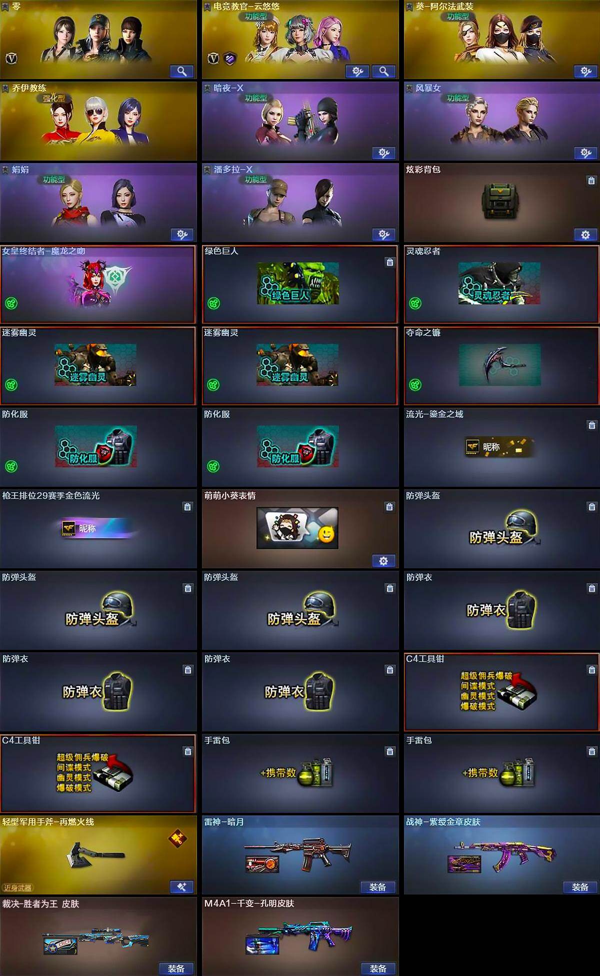 【道具】:炫彩背包,女皇终结者-魔龙之吻,绿色巨人,灵魂忍者,迷雾幽灵*2,夺命之镰,防化服*2,流光-鎏金之域,枪王排位29赛季金色流光,萌萌小葵表情,防弹头盔*3,防弹衣*3,C4工具钳*2,手雷包*2
