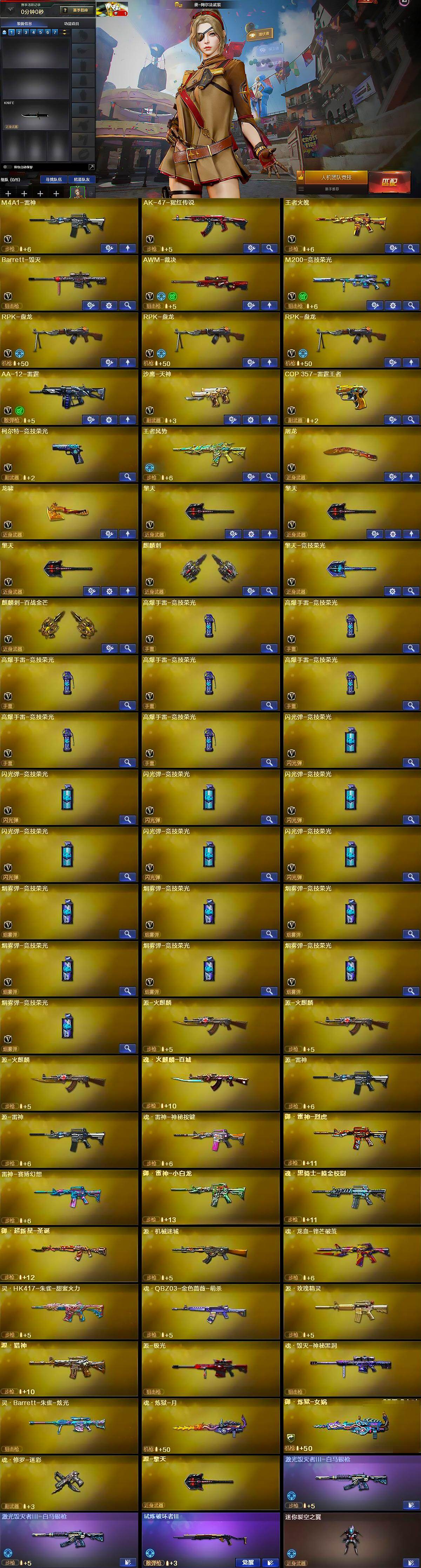 【英雄级武器】:M4A1-雷神,AK-47-猩红传说,王者火魄-觉醒版,Barrett-毁灭,AWM-裁决,M200-竞技荣光,RPK-盘龙*3,AA-12-雷霆,沙鹰-天神,COP 357-雷霆王者-觉醒版,柯尔特-竞技荣光,屠龙,龙啸,擎天*3,麒麟刺,擎天-竞技荣光,麒麟刺-百战金芒,高爆手雷-竞技荣光*7,闪光弹-竞技荣光*7,烟雾弹-竞技荣光*7