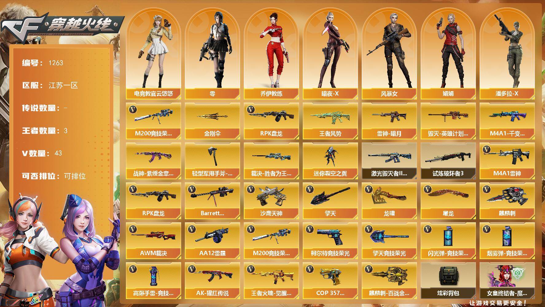 [17155808]江苏一区-47V-3王者武器数-0炫金武器数 【热门武器】:M200-竞技荣光,RPK-盘龙*3,金刚伞 【王者炫金武器】:王者风势 【皮肤】:裁决-胜者为王 皮肤,雷神-暗月,毁灭-英雄计划 皮肤,M4A1-千变-孔明皮肤,战神-紫绶金章皮肤,轻型军用手斧-再燃火线 【角色】:零,电竞教官-云悠悠,乔伊教练,葵-阿尔法武装,暗夜-X,风暴女,娟娟,潘多拉-X 【人偶武器】:迷你裂空之翼 【挑战大师】:激光毁灭者III-白马银枪*2,试炼破坏者III 【英雄级武器】:M4A1-雷神,AK-47-猩红传说,王者火魄-觉醒版,Barrett-毁灭,AWM-裁决,M200-竞技荣光,RPK-盘龙*3,AA-12-雷霆,沙鹰-天神,COP 357-雷霆王者-觉醒版,柯尔特-竞技荣光,屠龙,龙啸,擎天*3,麒麟刺,擎天-竞技荣光,麒麟刺-百战金芒,高爆手雷-竞技荣光*7,闪光弹-竞技荣光*7,烟雾弹-竞技荣光*7 【道具】:炫彩背包,女皇终结者-魔龙之吻,绿色巨人,灵魂忍者,迷雾幽灵*2,夺命之镰,防化服*2,流光-鎏金之域,枪王排位29赛季金色流光,萌萌小葵表情,防弹头盔*3,防弹衣*3,C4工具钳*2,手雷包*2 【特殊枪械】:3盘龙