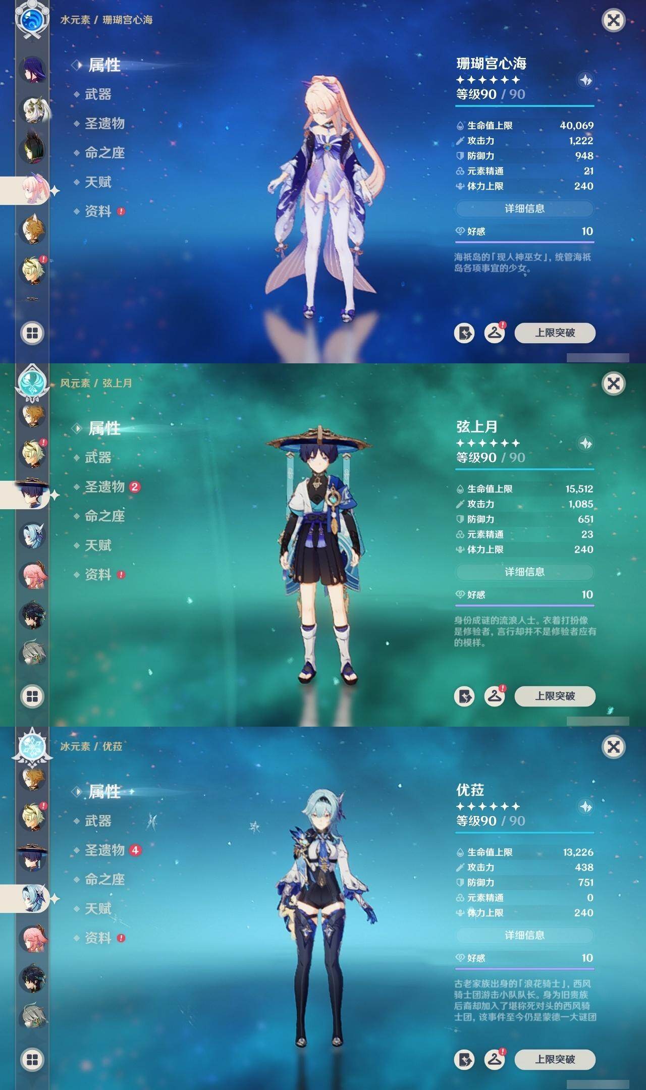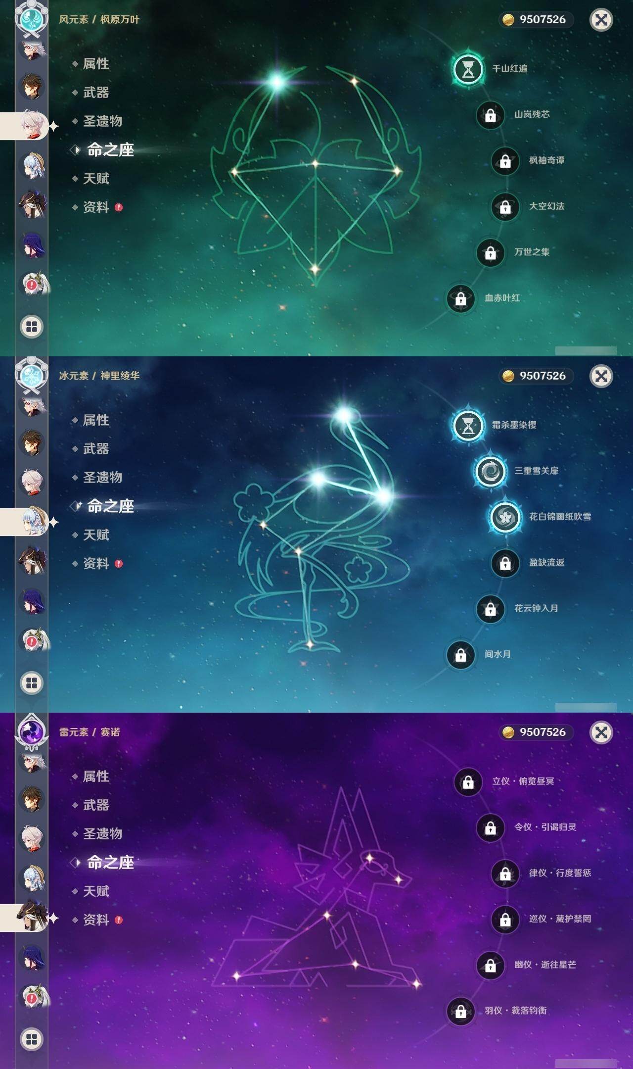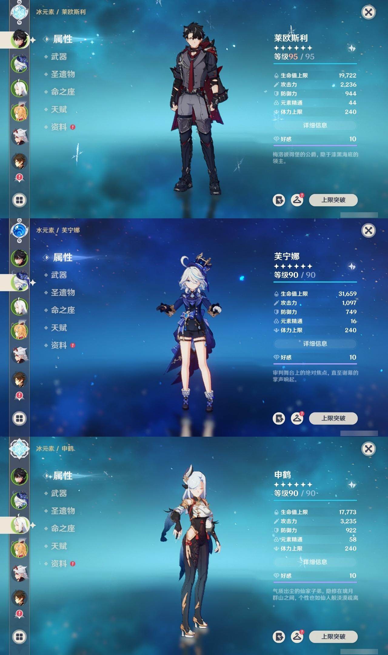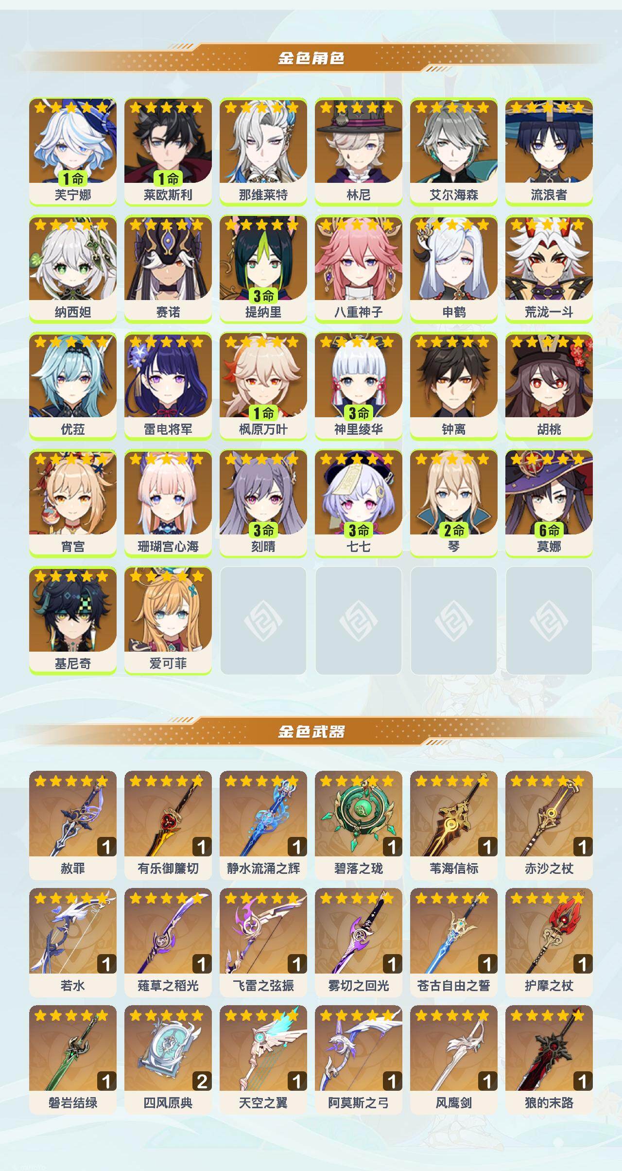 1命芙宁娜,1命莱欧斯利,0命那维莱特,0命林尼,0命艾尔海森,0命流浪者,0命纳西妲,0命赛诺,3命提纳里,0命八重神子,0命申鹤,0命荒泷一斗,0命优菈,0命雷电将军,1命枫原万叶,3命神里绫华,0命钟离,0命胡桃,0命宵宫,0命珊瑚宫心海,3命刻晴,3命七七,2命琴,满命莫娜,0命基尼奇,0命爱可菲,精1赦罪,精1有乐御簾切,精1静水流涌之辉,精1碧落之珑,精1苇海信标,精1赤沙之杖,精1若水,精1薙草之稻光,精1飞雷之弦振,精1雾切之回光,精1苍古自由之誓,精1护摩之杖,精1磐岩结绿,精2四风原典,精1天空之翼,精1阿莫斯之弓,精1风鹰剑,精1狼的末路