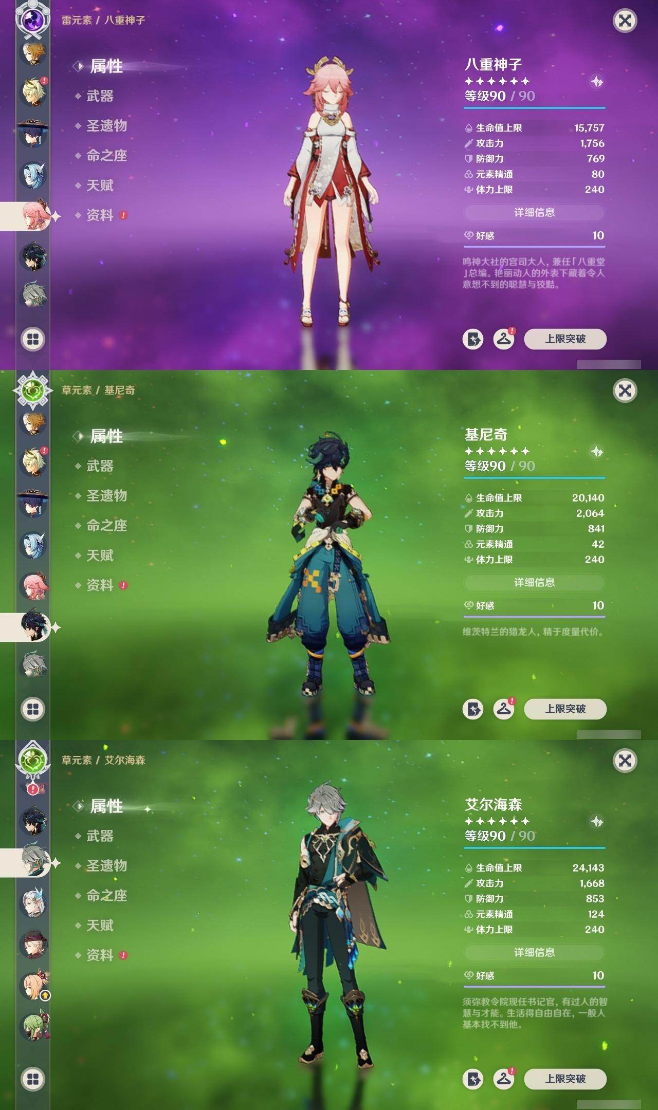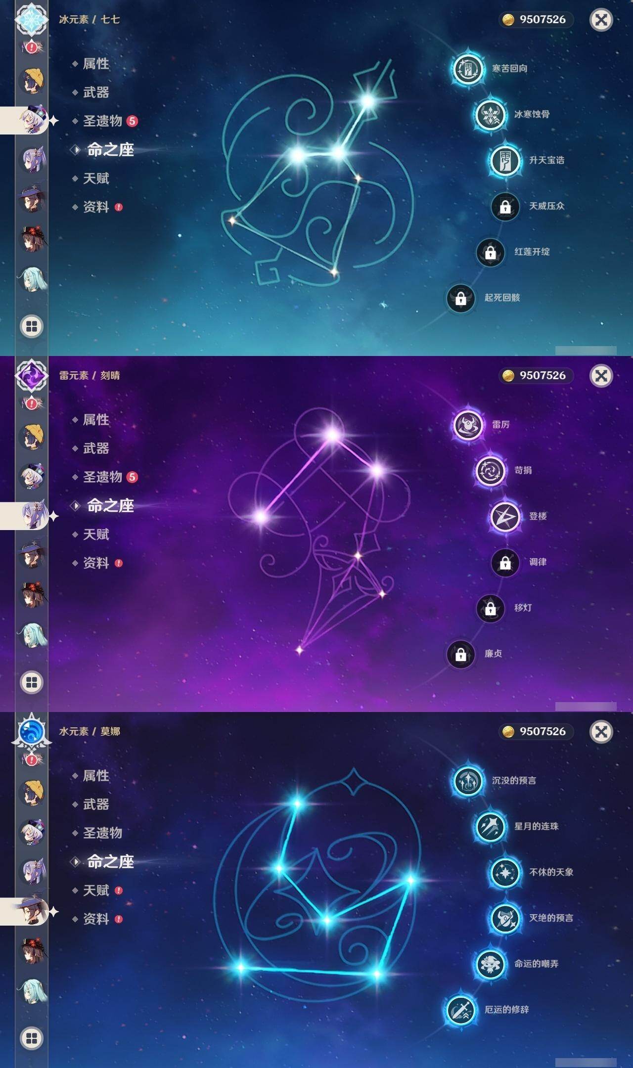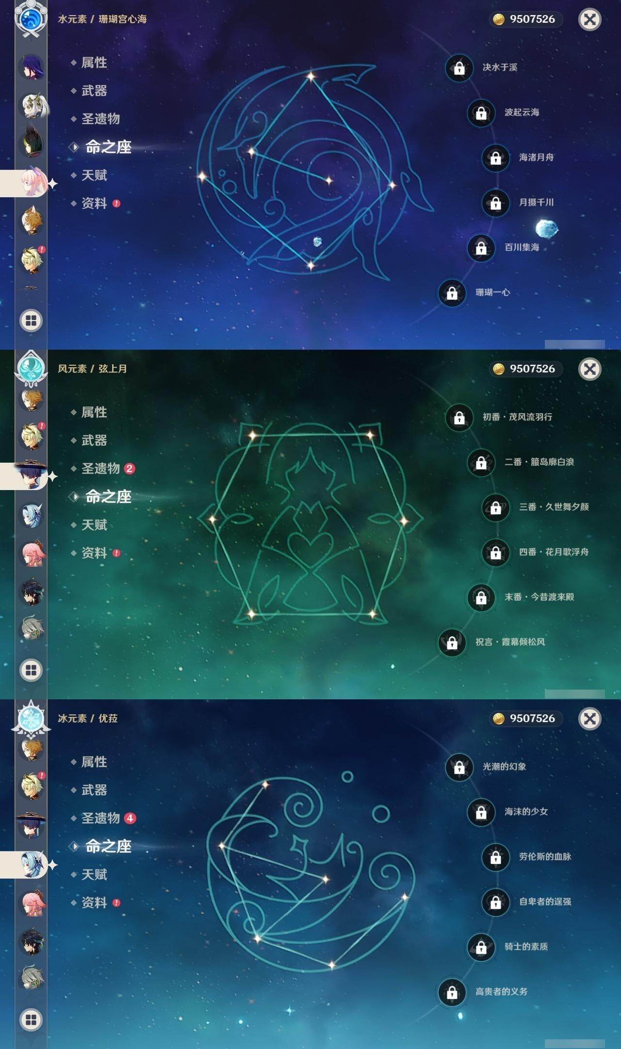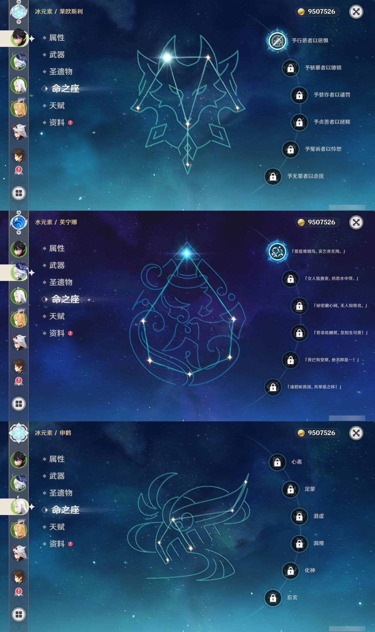 1命芙宁娜,1命莱欧斯利,0命那维莱特,0命林尼,0命艾尔海森,0命流浪者,0命纳西妲,0命赛诺,3命提纳里,0命八重神子,0命申鹤,0命荒泷一斗,0命优菈,0命雷电将军,1命枫原万叶,3命神里绫华,0命钟离,0命胡桃,0命宵宫,0命珊瑚宫心海,3命刻晴,3命七七,2命琴,满命莫娜,0命基尼奇,0命爱可菲,精1赦罪,精1有乐御簾切,精1静水流涌之辉,精1碧落之珑,精1苇海信标,精1赤沙之杖,精1若水,精1薙草之稻光,精1飞雷之弦振,精1雾切之回光,精1苍古自由之誓,精1护摩之杖,精1磐岩结绿,精2四风原典,精1天空之翼,精1阿莫斯之弓,精1风鹰剑,精1狼的末路