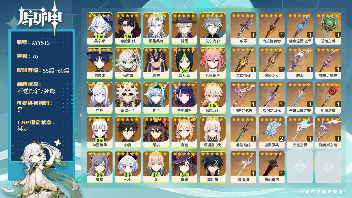 [17166378]60级/70黄/女主/26个五星角色/20个五星武器 1命芙宁娜,1命莱欧斯利,0命那维莱特,0命林尼,0命艾尔海森,0命流浪者,0命纳西妲,0命赛诺,3命提纳里,0命八重神子,0命申鹤,0命荒泷一斗,0命优菈,0命雷电将军,1命枫原万叶,3命神里绫华,0命钟离,0命胡桃,0命宵宫,0命珊瑚宫心海,3命刻晴,3命七七,2命琴,满命莫娜,0命基尼奇,0命爱可菲,精1赦罪,精1有乐御簾切,精1静水流涌之辉,精1碧落之珑,精1苇海信标,精1赤沙之杖,精1若水,精1薙草之稻光,精1飞雷之弦振,精1雾切之回光,精1苍古自由之誓,精1护摩之杖,精1磐岩结绿,精2四风原典,精1天空之翼,精1阿莫斯之弓,精1风鹰剑,精1狼的末路