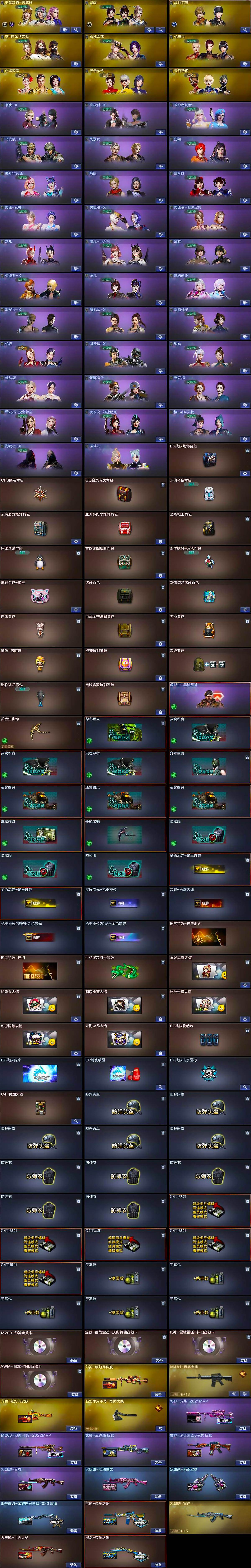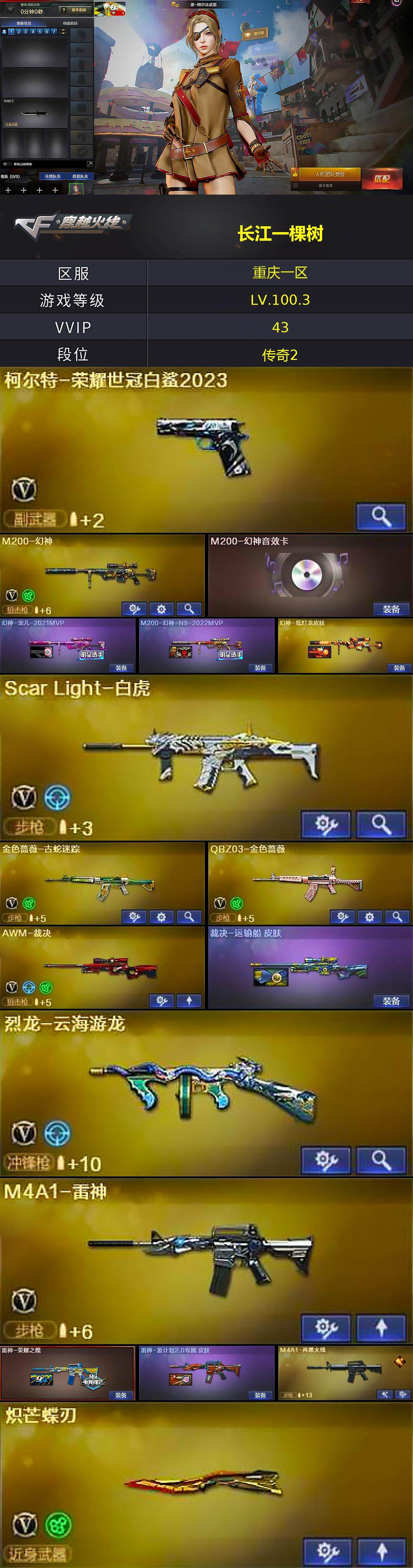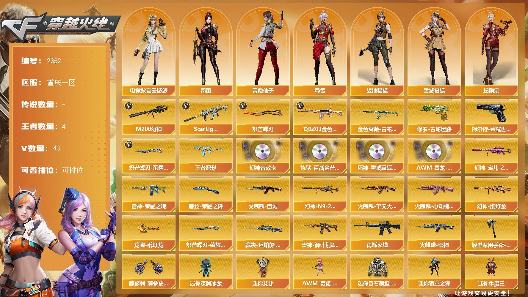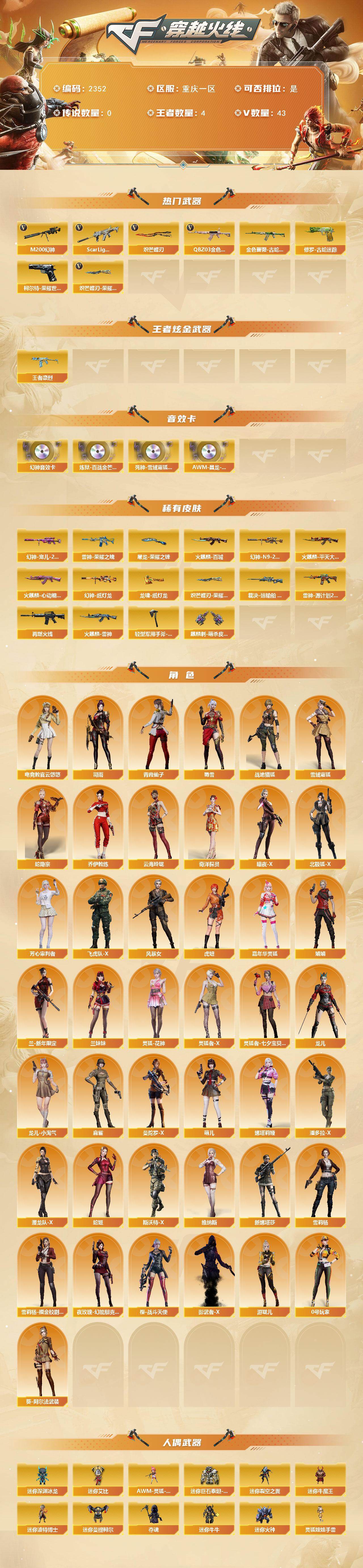 [17176498]重庆一区-36V-4王者武器数-0炫金武器数 【热门武器】:QBZ03-金色蔷薇,Scar Light-白虎,M200-幻神,柯尔特-荣耀世冠白鲨2023,金色蔷薇-古蛇迷踪,修罗-古蛇迷踪,炽芒蝶刃,炽芒蝶刃-荣耀世冠白鲨2023 皮肤 【王者炫金武器】:王者凛烈 【音效卡】:M200-幻神音效卡,炼狱-百战金芒-庆典舞曲音效卡,死神-雪域霜狐-怀旧音效卡,AWM-昌龙-怀旧音效卡 【皮肤】:幻神-宠儿-2021MVP,M200-幻神-N9-2022MVP,幻神-纸灯龙皮肤,裁决-运输船 皮肤,雷神-荣耀之魄,雷神-源计划2.0专属 皮肤,M4A1-再燃火线,火麒麟-雷神,火麒麟-平天大圣,火麒麟-百城,火麒麟-心动糖果,屠龙-荣耀之锋,龙啸-纸灯龙皮肤,轻型军用手斧-再燃火线,麒麟刺-萌杀皮肤,炽芒蝶刃-荣耀世冠白鲨2023 皮肤 【角色】:电竞教官-云悠悠,司雨,战地猎狐,雪域霜狐,蛇隐宗,奇洋探员,乔伊教练,云海玲珑,葵-阿尔法武装,暗夜-X,北极狐-X,芳心审判者,飞虎队-X,风暴女,虎妞,嘉年华灵狐,娟娟,兰-新年限定,兰妹妹,0号玩家,灵狐-花神,灵狐者-X,灵狐者-七夕宝贝,龙儿,龙儿-小淘气,麻雀,曼陀罗-X,萌儿,娜塔莉娅,潘多拉-X,潜龙队-X,青霞仙子,蛇姬,斯沃特-X,蜀雪,维纳斯,新娜塔莎,雪莉杨,雪莉杨-摸金校尉,夜玫瑰-幻能朋克,樱-战斗天使,影武者-X,游珑儿 【人偶武器】:AWM-灵狐-15周年嘉年华,迷你深渊冰龙,迷你裂空之翼,迷你牛魔王,迷你波特博士,迷你曼提柯尔,夺魂,迷你牛牛,迷你火种,生化手雷-机甲核心,深渊终结者手雷,迷你艾比,迷你巨石泰坦-魔花研究所,灵狐娃娃手雷 【暴走生化】:超级对讲机 【挑战大师】:冰龙粉碎者-白马银枪*2,激光毁灭者III-白马银枪,激光毁灭者III,机甲撕裂者III,试炼破坏者III,KAC-圣炎切割者III,神圣爆裂者-末日III 【英雄级武器】:AK47-火麒麟,M4A1-雷神,Scar Light-白虎,无影-神兵利器,黑武士-锦绣游龙,超新星-热带奇洋,金色蔷薇-古蛇迷踪,死神-雪域霜狐,QBZ03-金色蔷薇,烈火-动感闪耀,黑骑士-海王*3,AWM-裁决,M200-幻神,炼狱-百战金芒,烈龙-云海游龙,柯尔特-荣耀世冠白鲨2023,天神-动感闪耀,修罗-古蛇迷踪,屠龙,龙啸,炽芒
