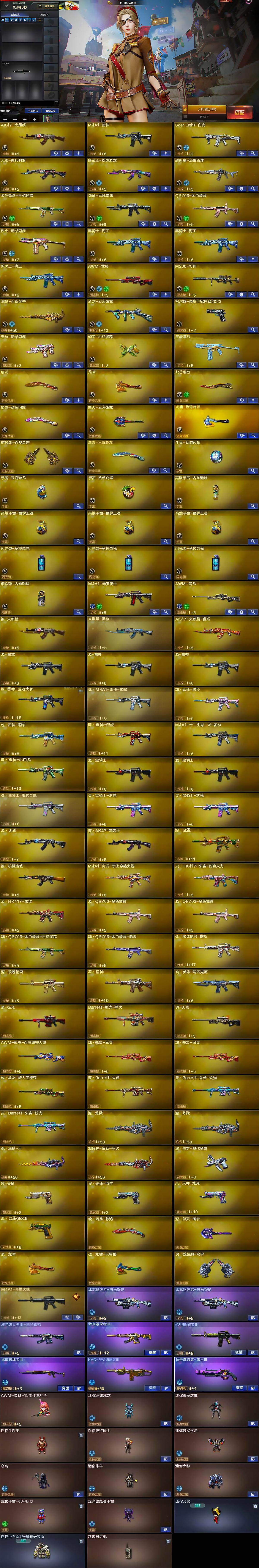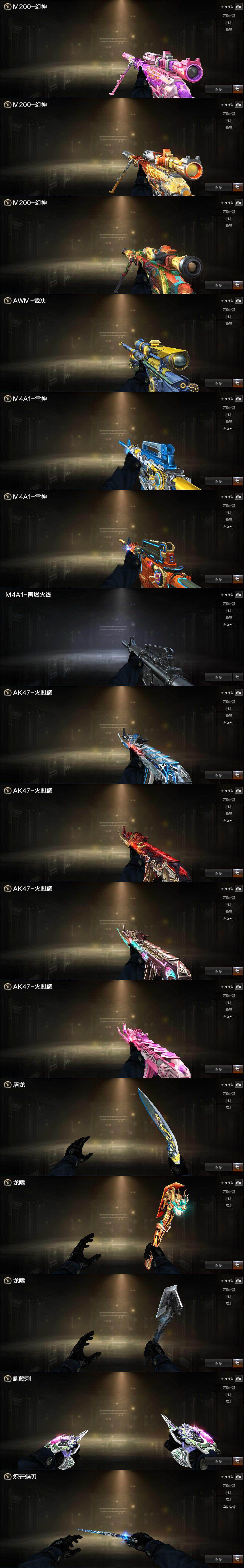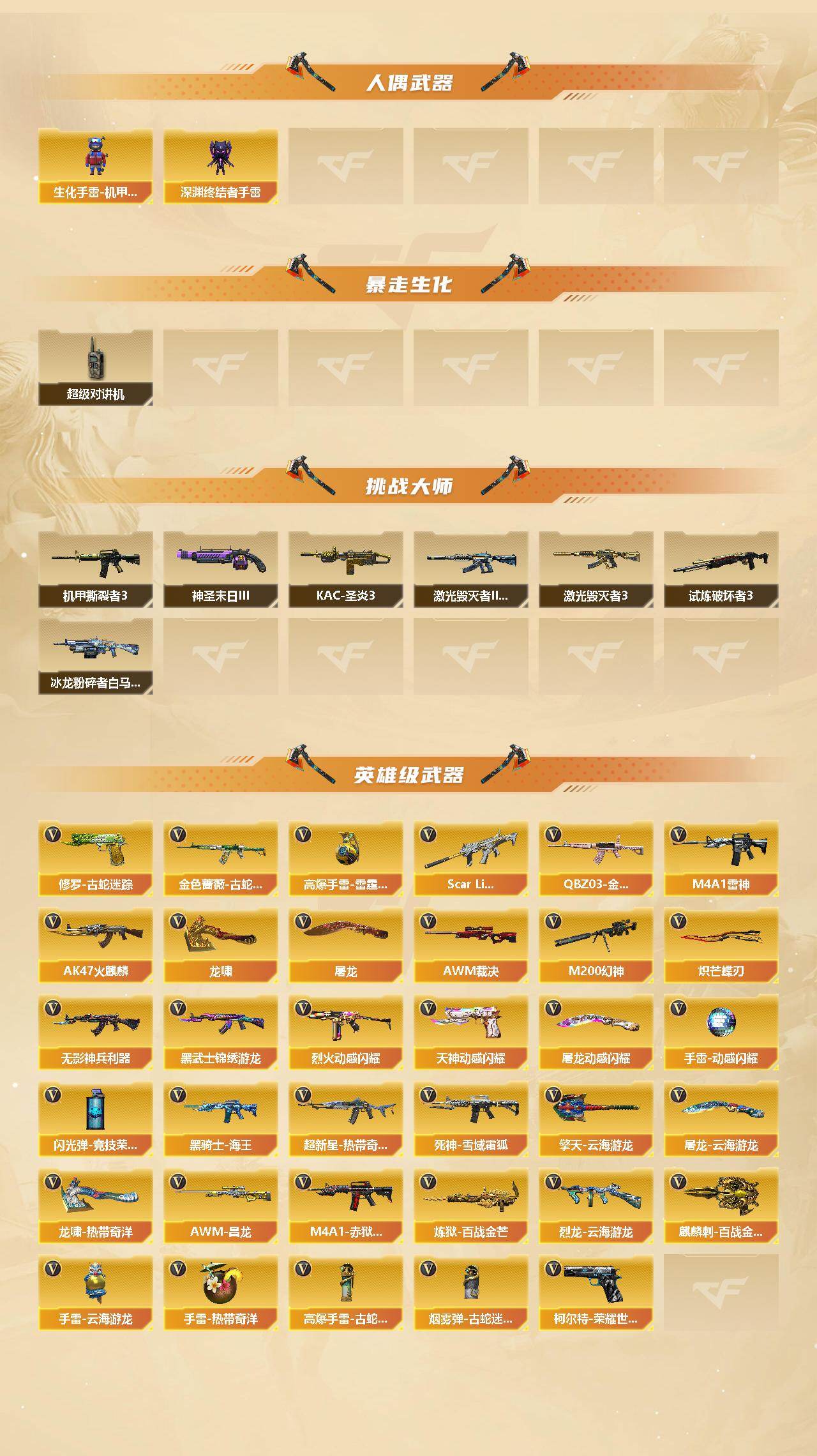 【英雄级武器】:AK47-火麒麟,M4A1-雷神,Scar Light-白虎,无影-神兵利器,黑武士-锦绣游龙,超新星-热带奇洋,金色蔷薇-古蛇迷踪,死神-雪域霜狐,QBZ03-金色蔷薇,烈火-动感闪耀,黑骑士-海王*3,AWM-裁决,M200-幻神,炼狱-百战金芒,烈龙-云海游龙,柯尔特-荣耀世冠白鲨2023,天神-动感闪耀,修罗-古蛇迷踪,屠龙,龙啸,炽芒
