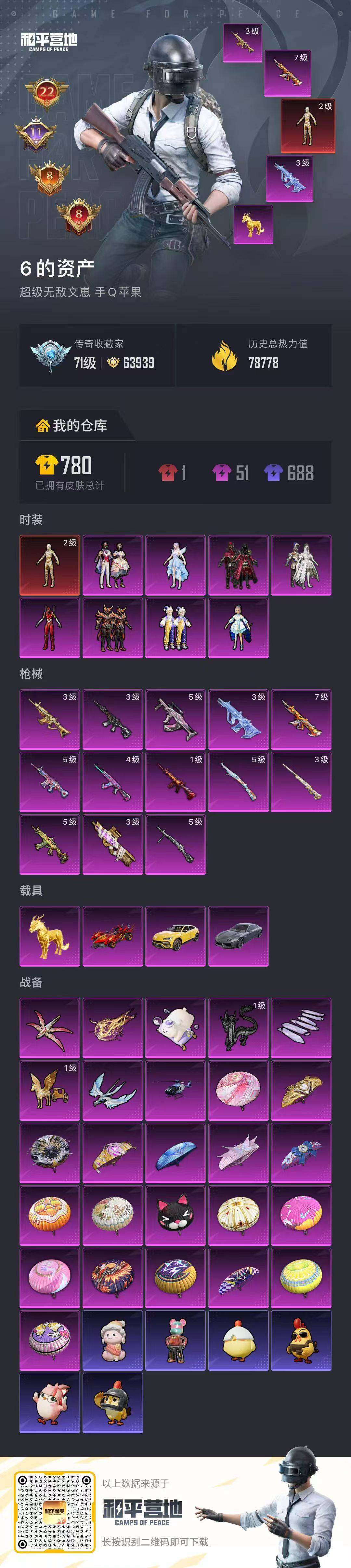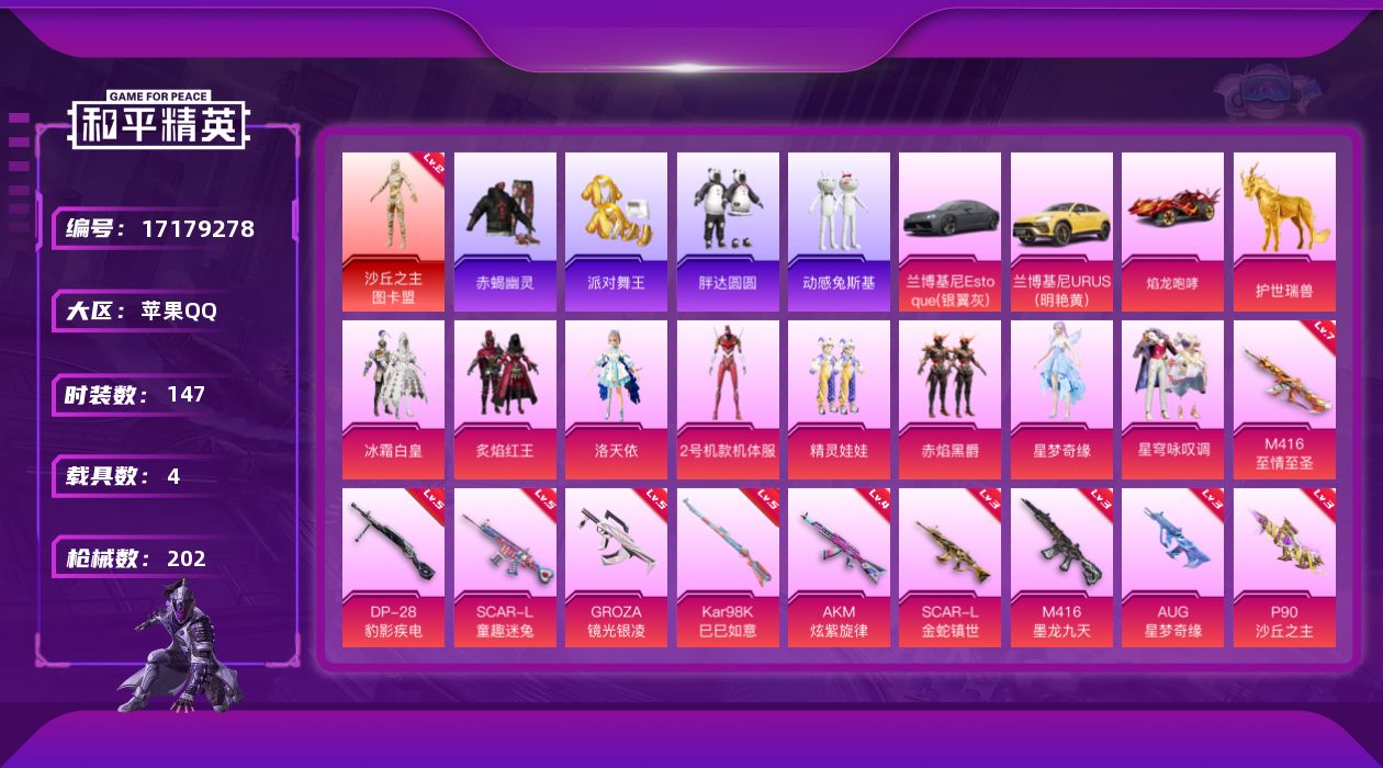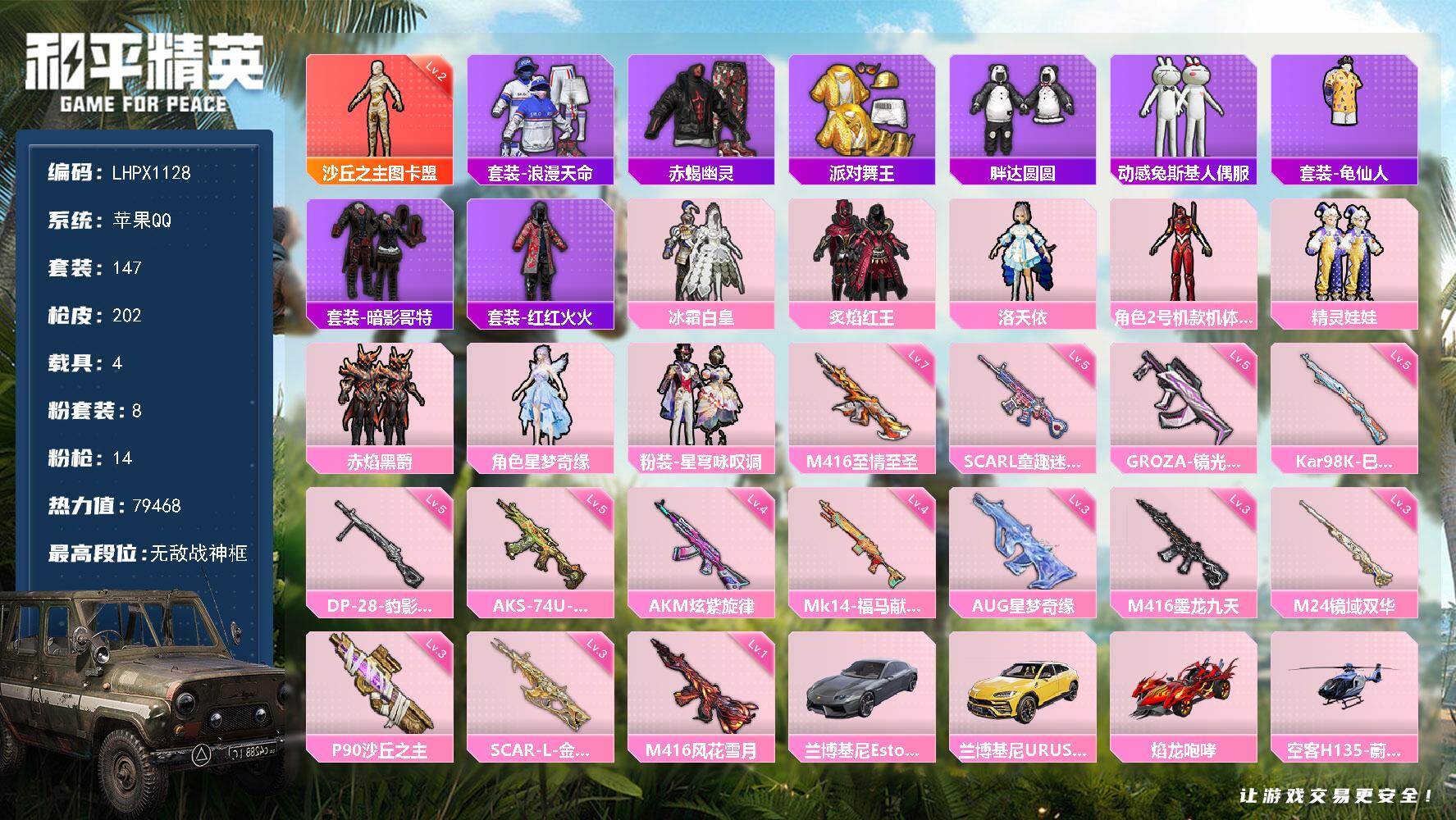 [17179278]可二次【特价出售/店主推荐】苹果 手Q-无敌战神框-1神装-8粉装-14特效枪-4载具-7粉色飞行器-79468热力值-22王牌印记-147套装-202枪皮