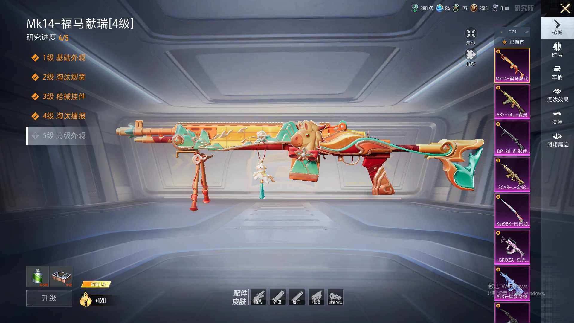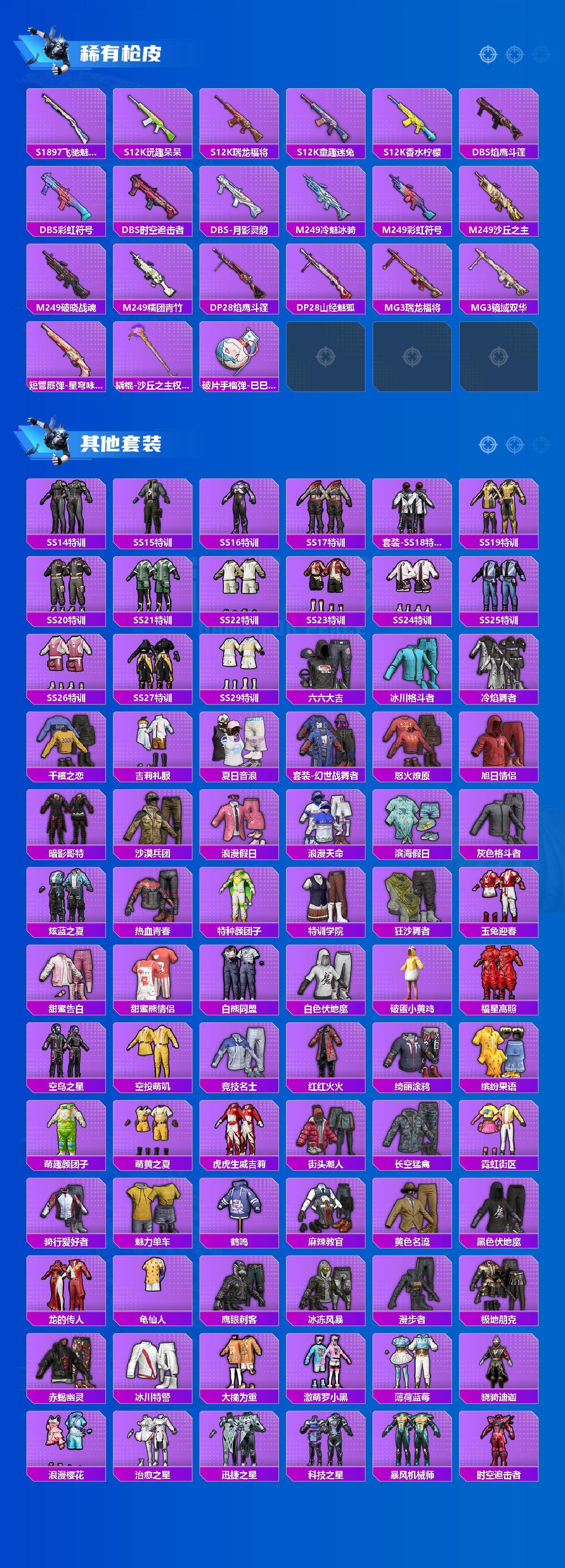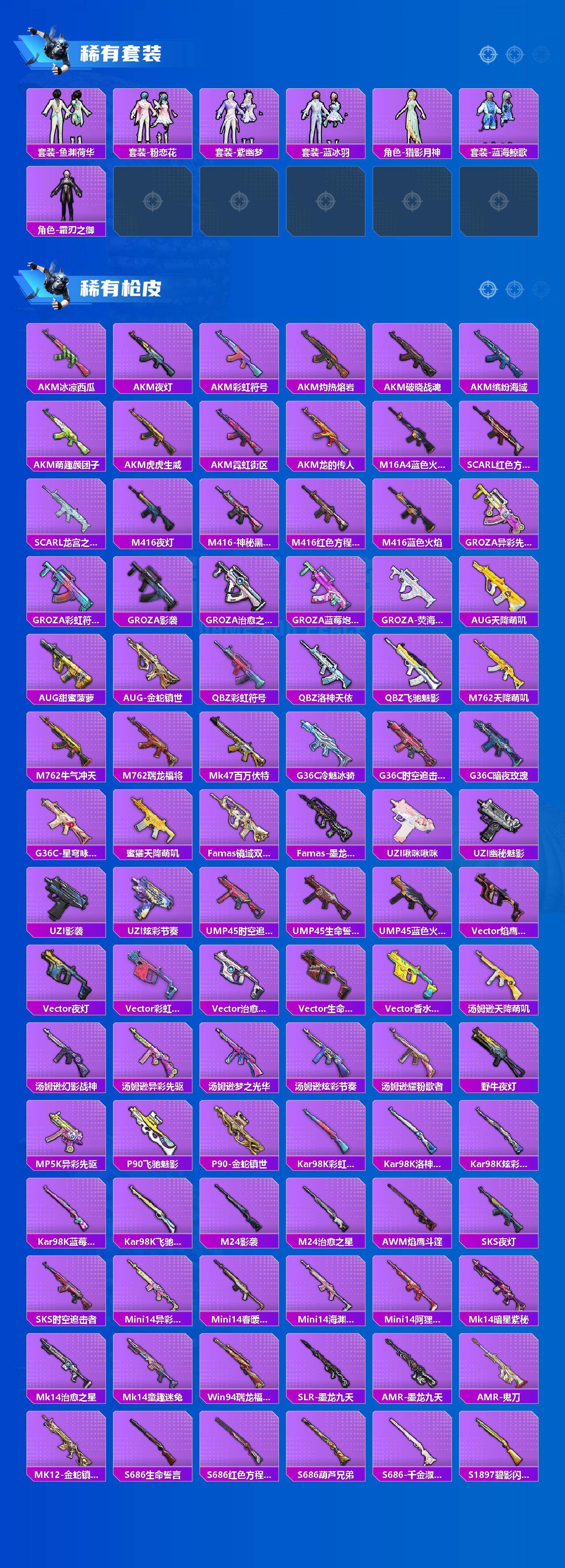 AKM-炫紫旋律,SCAR-L-童趣迷兔,SCAR-L-金蛇镇世,M416-风花雪月,M416-至情至圣,M416-墨龙九天,GROZA-镜光银凌,AUG-星梦奇缘,P90-沙丘之主,Kar98K-巳巳如意,M24-镜域双华