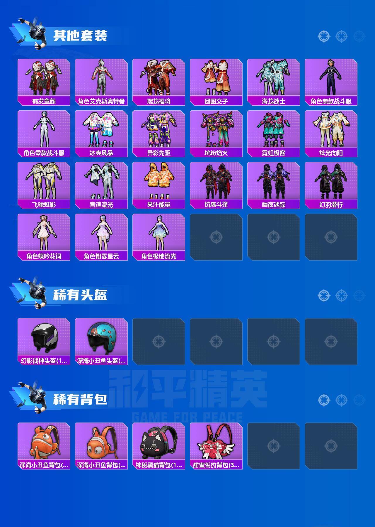 【稀有套装】:套装-龟仙人,套装-巳巳如意,套装-雪国风尚,套装-糖糖葫芦,套装-青团波波,角色-许七安,套装-燕燕于飞,套装-鱼渊荷华,套装-粉恋花,套装-紫幽梦,套装-蓝冰