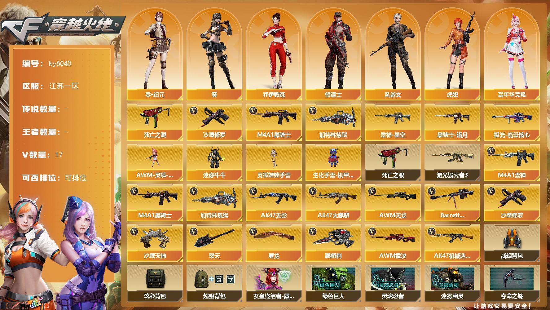 [17179298]江苏一区-17V-0王者武器数-0炫金武器数 【热门武器】:死亡之眼,M4A1-黑骑士,加特林-炼狱,沙鹰-修罗 【皮肤】:雷神-星空,黑骑士-暗月,极光-能量核心*2 【角色】:葵,零·纪元,乔伊教练,修道士,风暴女,虎妞,嘉年华灵狐,娟娟,龙儿,潘多拉-甜心教官,斯沃特-X,兔囡囡,樱-战斗天使 【人偶武器】:AWM-灵狐-15周年嘉年华,迷你牛牛,生化手雷-机甲核心,灵狐娃娃手雷 【暴走生化】:死亡之眼 【挑战大师】:激光毁灭者III 【英雄级武器】:AK47-火麒麟,M4A1-雷神*2,M4A1-黑骑士,AK47-无影,AK47-机械迷城,AWM-天龙*2,Barrett-毁灭,AWM-裁决,加特林-炼狱,沙鹰-修罗,沙鹰-天神,屠龙,擎天,麒麟刺 【道具】:战舰背包,炫彩背包,超级背包,女皇终结者-魔龙之吻,绿色巨人,灵魂忍者,迷雾幽灵,夺命之镰,防化服*2,金色流光-枪王排位,流光-鎏金之域,防弹头盔*2,防弹衣*2,C4工具钳*2,手雷包*2 【特殊枪械】:1黑骑士,1炼狱