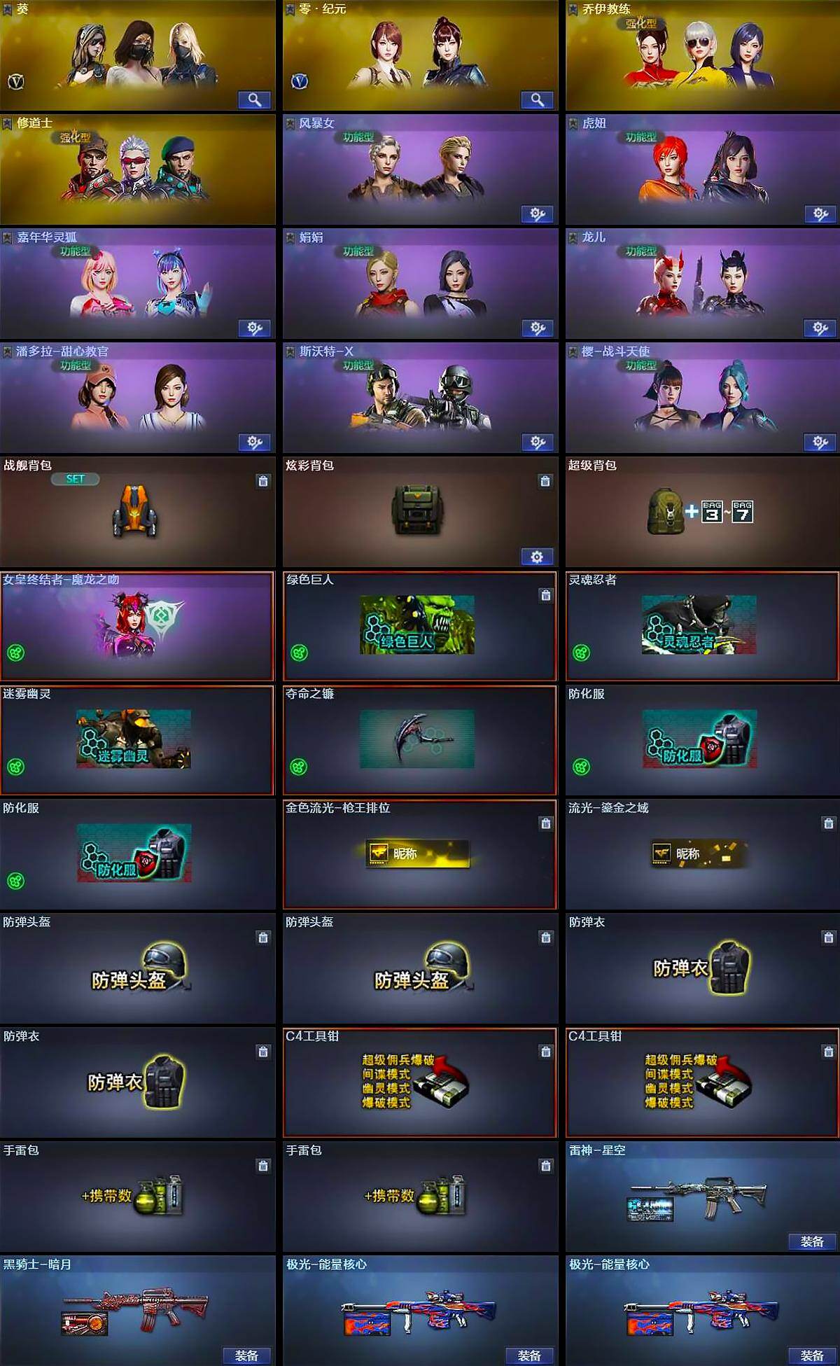 【道具】:战舰背包,炫彩背包,超级背包,女皇终结者-魔龙之吻,绿色巨人,灵魂忍者,迷雾幽灵,夺命之镰,防化服*2,金色流光-枪王排位,流光-鎏金之域,防弹头盔*2,防弹衣*2,C4工具钳*2,手雷包*2