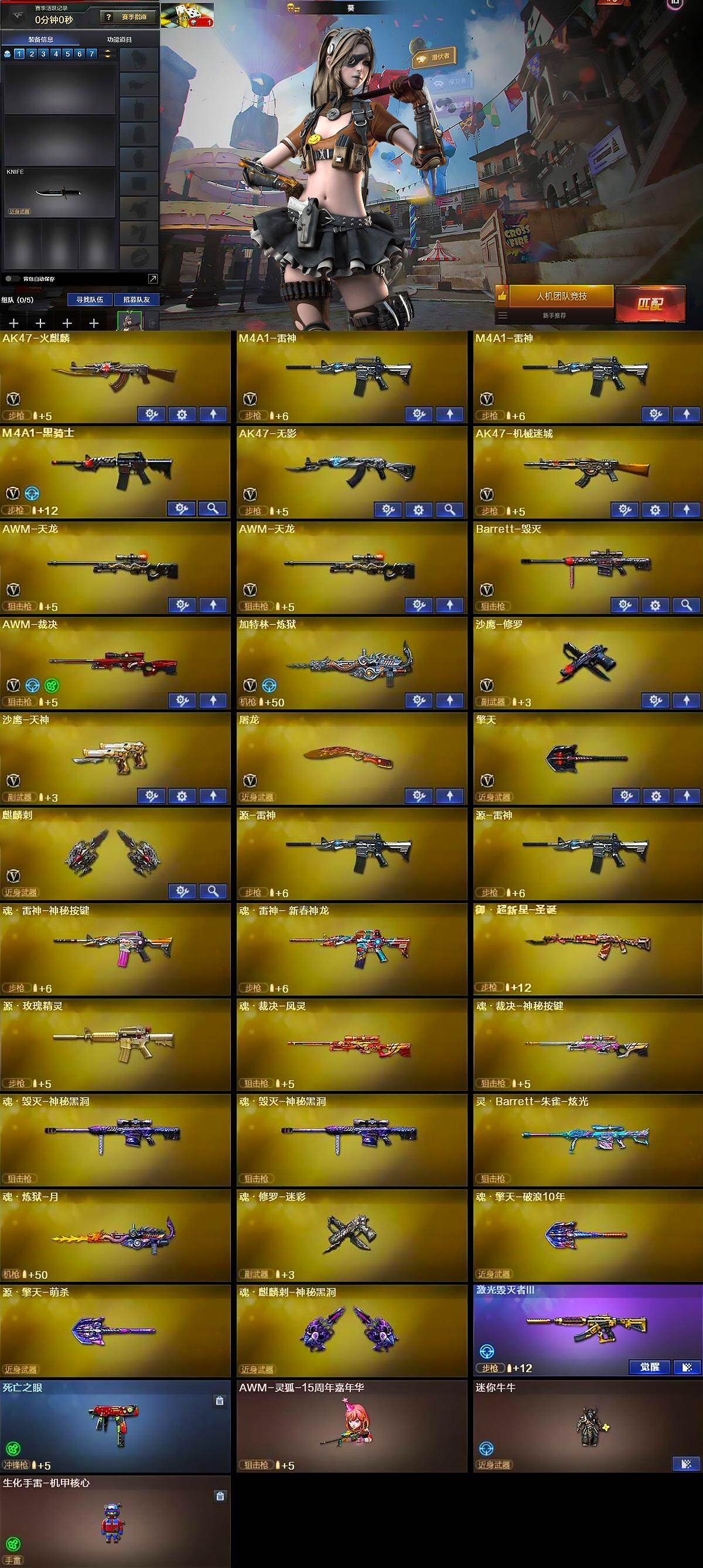 【英雄级武器】:AK47-火麒麟,M4A1-雷神*2,M4A1-黑骑士,AK47-无影,AK47-机械迷城,AWM-天龙*2,Barrett-毁灭,AWM-裁决,加特林-炼狱,沙鹰-修罗,沙鹰-天神,屠龙,擎天,麒麟刺