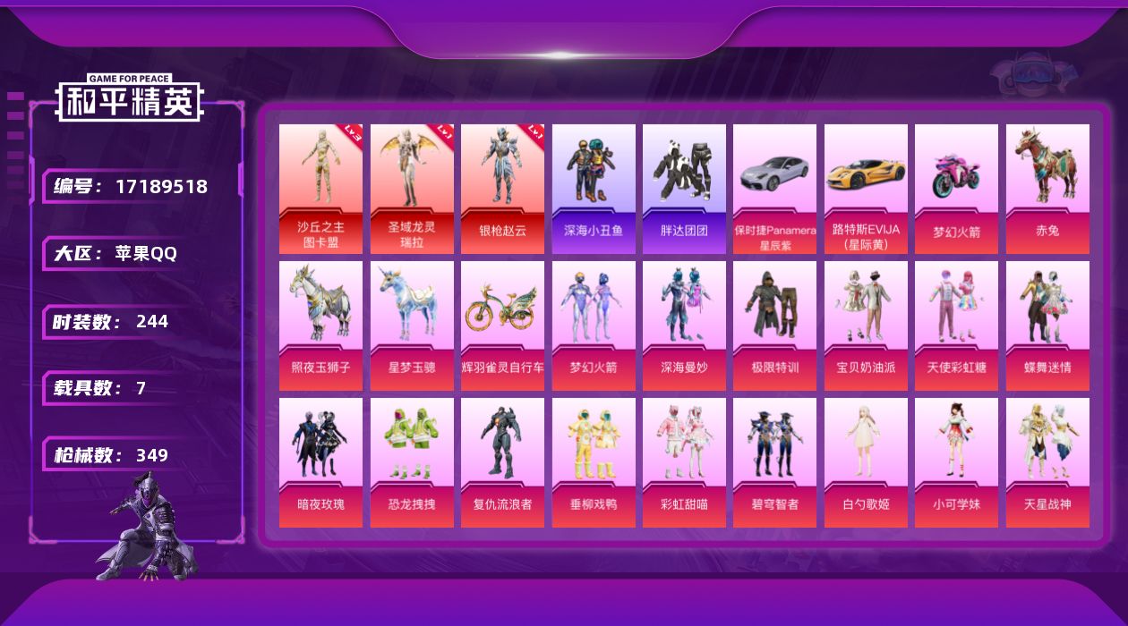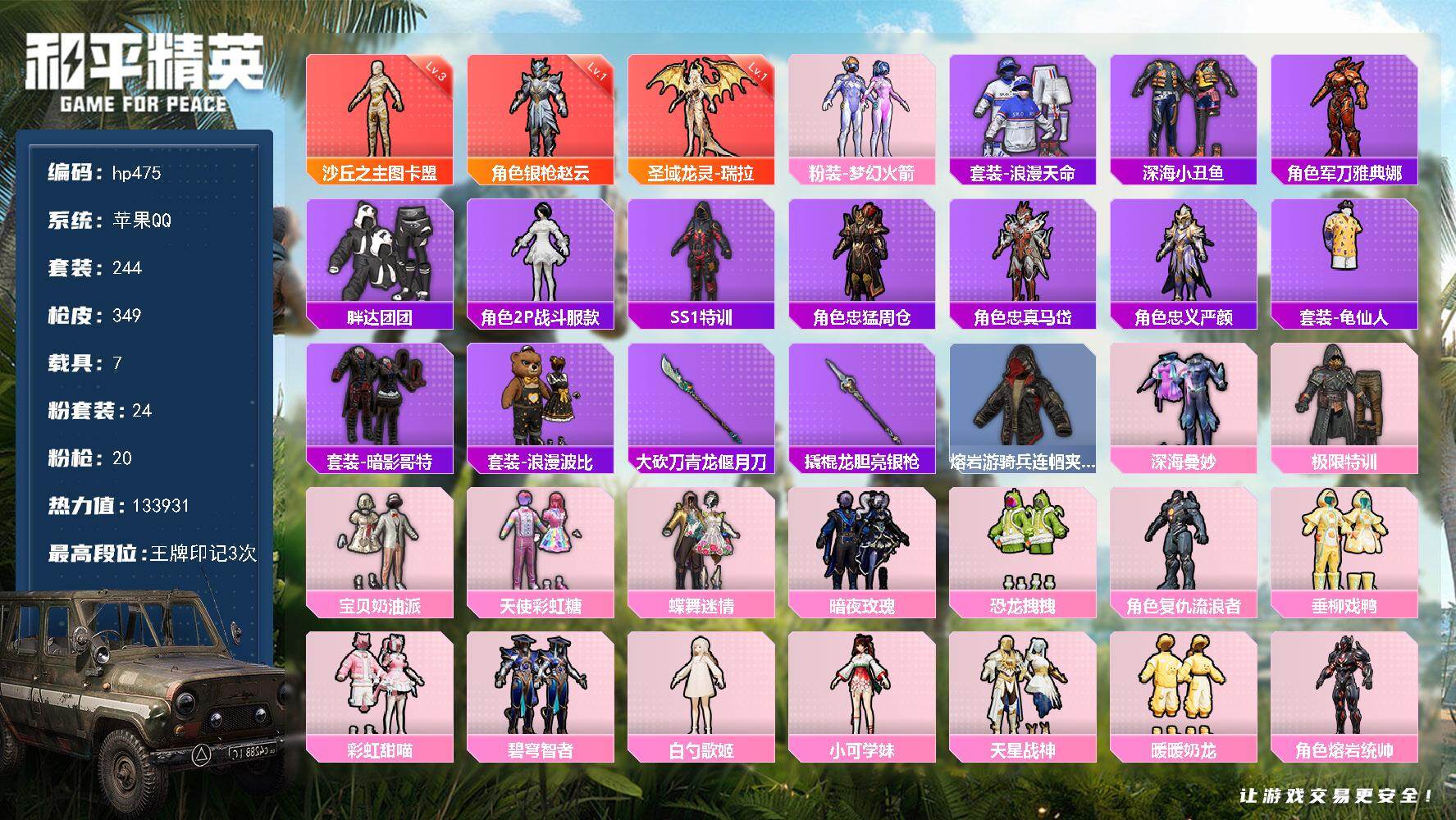 [17189518]苹果 手Q-3神装-24粉装-20特效枪-7载具-9粉色飞行器-133931热力值-3王牌印记-244套装-349枪皮