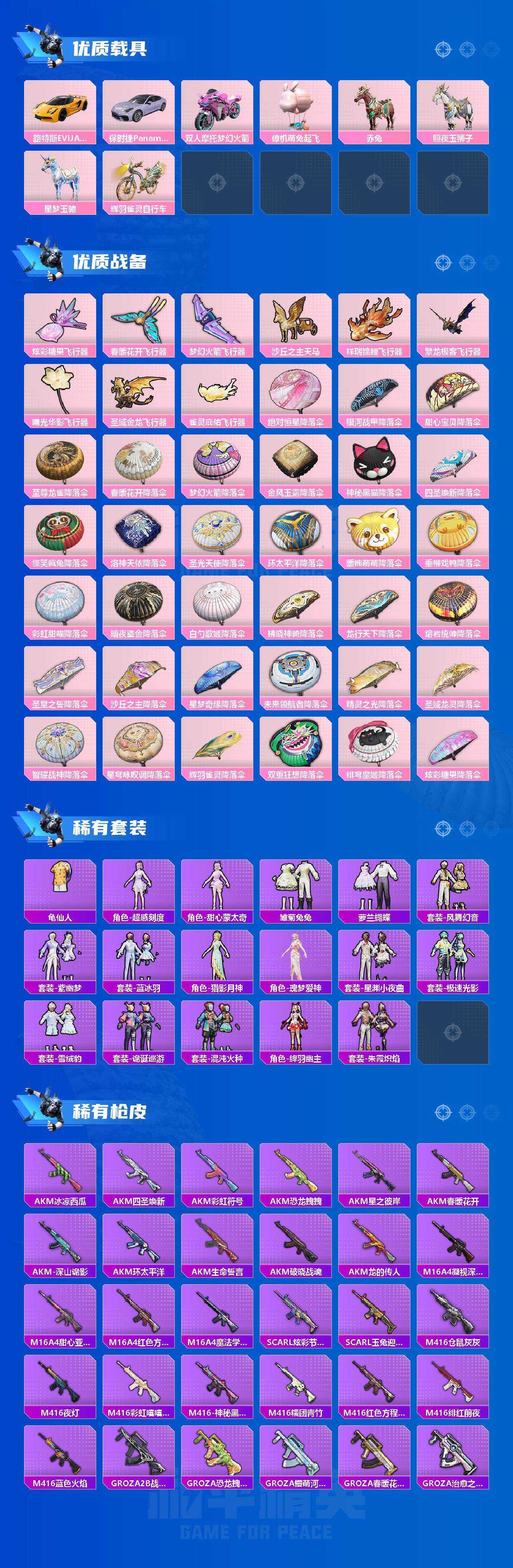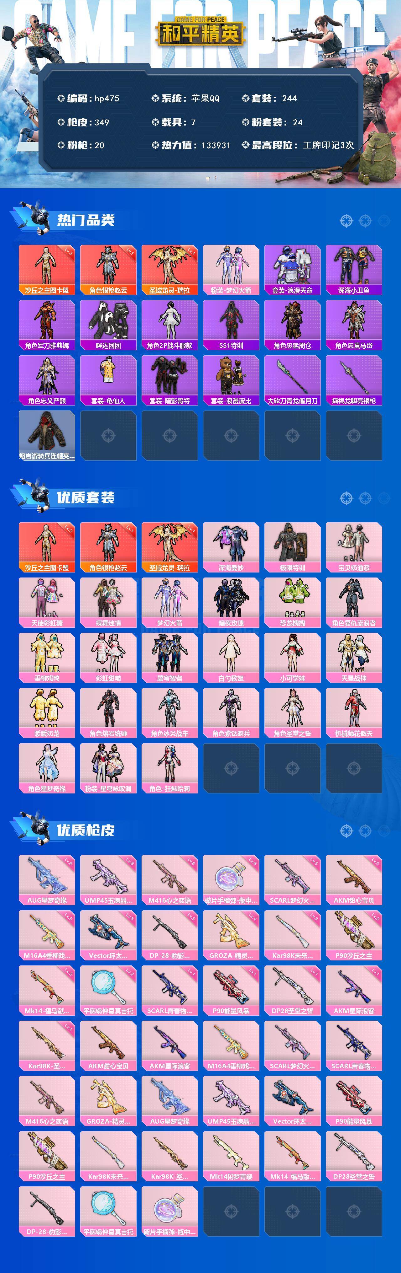 [17189518]苹果 手Q-3神装-24粉装-20特效枪-7载具-9粉色飞行器-133931热力值-3王牌印记-244套装-349枪皮 【红色神装等级】:圣域龙灵-瑞拉(一级),沙丘之主-图卡盟(三级),角色-银枪赵云(一级) 【红色角色神装】:圣域龙灵-瑞拉,沙丘之主-图卡盟,角色-银枪赵云 【热门品类】:粉装-梦幻火箭,套装-浪漫天命,套装-深海小丑鱼,角色-军刀雅典娜,套装-胖达团团,角色-2P战斗服款,套装-SS1特训,角色-忠猛周仓,角色-忠真马岱,角色-忠义严颜,套装-龟仙人,套装-暗影哥特,套装-浪漫波比,大砍刀-青龙偃月刀,撬棍-龙胆亮银枪,熔岩游骑兵连帽夹克 【粉色套装】:粉装-深海曼妙,粉装-极限特训,粉装-宝贝奶油派,粉装-天使彩虹糖,粉装-蝶舞迷情,粉装-梦幻火箭,粉装-暗夜玫瑰,粉装-恐龙拽拽,角色-复仇流浪者,粉装-垂柳戏鸭,粉装-彩虹甜喵,粉装-碧穹智者,角色-白勺歌姬,角色-小可学妹,粉装-天星战神,粉装-暖暖奶龙,角色-熔岩统帅,角色-冰炎战车,角色-紫钛骑兵,角色-圣堂之誓,粉装-机械师花傲天,角色-星梦奇缘,粉装-星穹咏叹调,角色-狂魅哈莉 【粉色枪皮等级】:AKM-甜心宝贝(五级),AKM-星际浪客(一级),M16A4-垂柳戏鸭(五级),SCAR-L-梦幻火箭(五级),SCAR-L-青春物语(一级),M416-心之恋语(六级),GROZA-精灵之光(四级),AUG-星梦奇缘(八级),UMP45-玉魂晶魄(八级),Vector-环太平洋(五级),P90-能量风暴(一级),P90-沙丘之主(三级),Kar98K-未来歌姬(三级),Kar98K-圣域龙灵(一级),Mk14-福马献瑞(三级),DP-28-圣堂之誓(一级),DP-28-豹影疾电(五级),平底锅-仲夏莫吉托(二级),破片手榴弹-瓶中星球(六级) 【粉色载具】:路特斯EVIJA(星际黄),保时捷Panamera(星辰紫),双人摩托-梦幻火箭,僚机-萌兔起飞,赤兔,照夜玉狮子,星梦玉骢,辉羽雀灵自行车 【粉色枪皮】:AKM-甜心宝贝,AKM-星际浪客,M16A4-垂柳戏鸭,SCAR-L-梦幻火箭,SCAR-L-青春物语,M416-心之恋语,GROZA-精灵之光,AUG-星梦奇缘,UMP45-玉魂晶魄,Vector-环太平洋,P90-能量风暴,P90-沙丘之主,Kar98K-未来歌姬,Kar