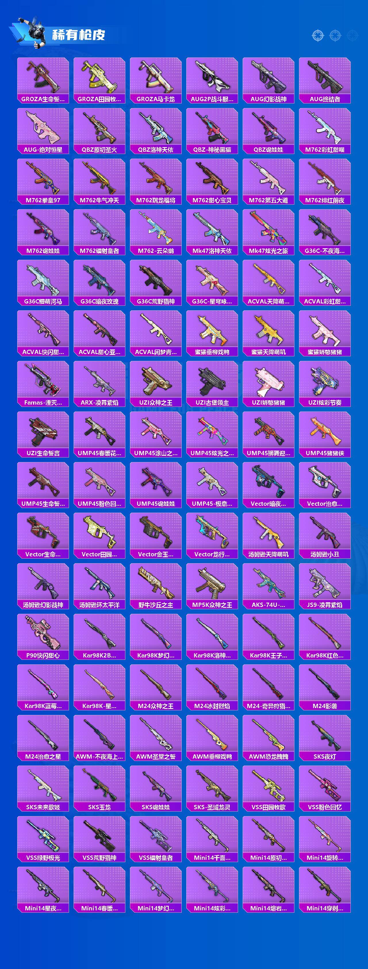 【粉色枪皮】:AKM-甜心宝贝,AKM-星际浪客,M16A4-垂柳戏鸭,SCAR-L-梦幻火箭,SCAR-L-青春物语,M416-心之恋语,GROZA-精灵之光,AUG-星梦奇缘,UMP45-玉魂晶魄,Vector-环太平洋,P90-能量风暴,P90-沙丘之主,Kar98K-未来歌姬,Kar