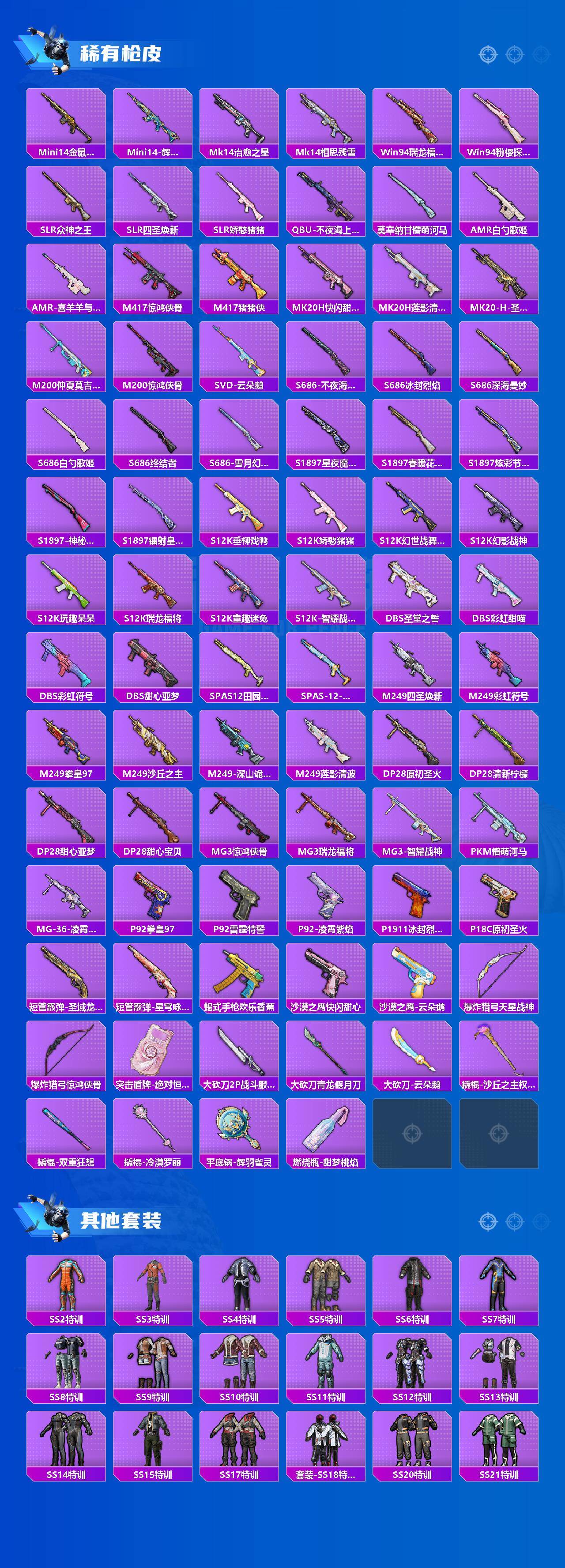 AKM-甜心宝贝,AKM-星际浪客,M16A4-垂柳戏鸭,SCAR-L-梦幻火箭,SCAR-L-青春物语,M416-心之恋语,GROZA-精灵之光,AUG-星梦奇缘,UMP45-玉魂晶魄,Vector-环太平洋,P90-能量风暴,P90-沙丘之主,Kar98K-未来歌姬,Kar98K-圣域龙灵,Mk14-闲梦青缨,DP-28-圣堂之誓,平底锅-仲夏莫吉托