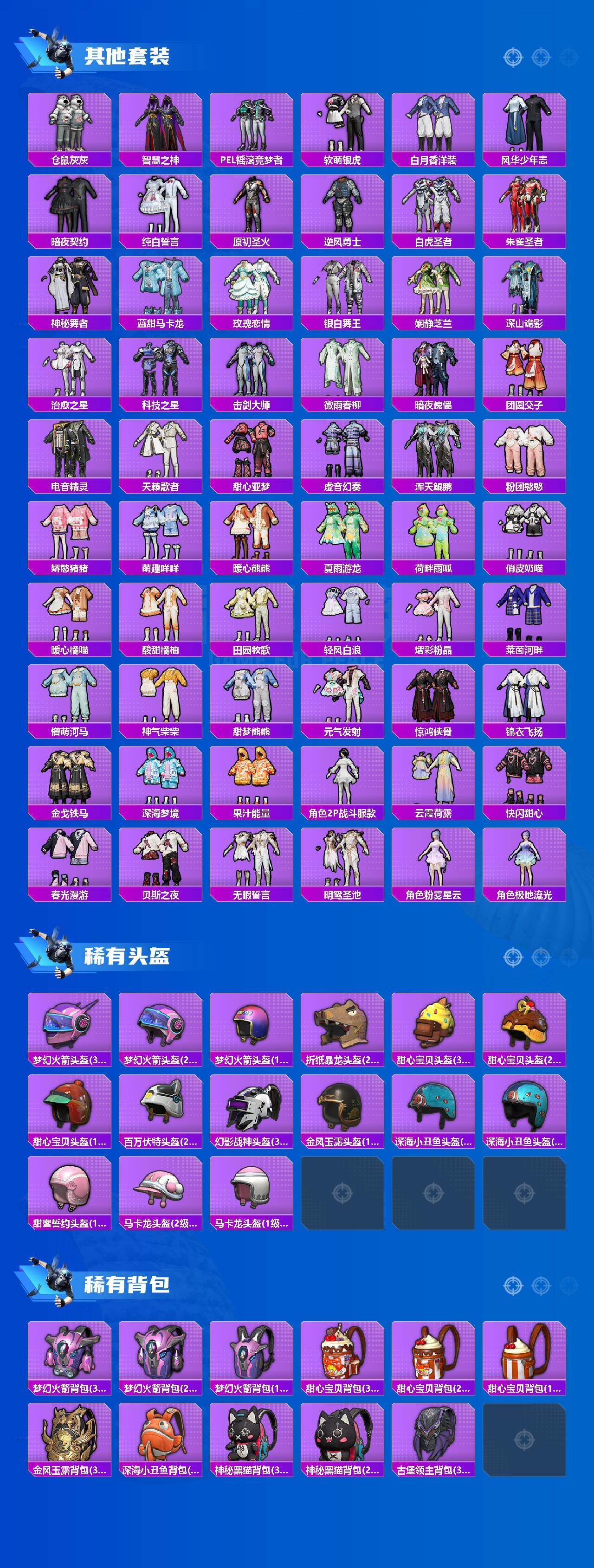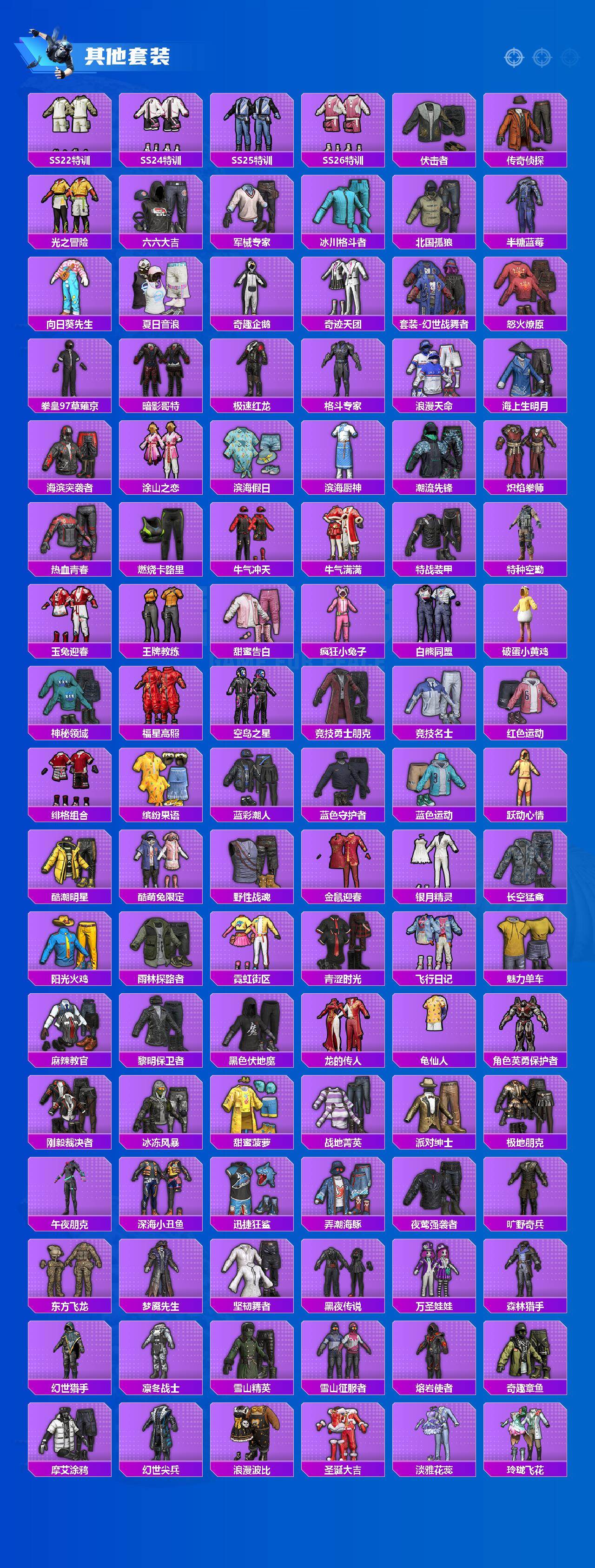 【粉色套装】:粉装-深海曼妙,粉装-极限特训,粉装-宝贝奶油派,粉装-天使彩虹糖,粉装-蝶舞迷情,粉装-梦幻火箭,粉装-暗夜玫瑰,粉装-恐龙拽拽,角色-复仇流浪者,粉装-垂柳戏鸭,粉装-彩虹甜喵,粉装-碧穹智者,角色-白勺歌姬,角色-小可学妹,粉装-天星战神,粉装-暖暖奶龙,角色-熔岩统帅,角色-冰炎战车,角色-紫钛骑兵,角色-圣堂之誓,粉装-机械师花傲天,角色-星梦奇缘,粉装-星穹咏叹调,角色-狂魅哈莉