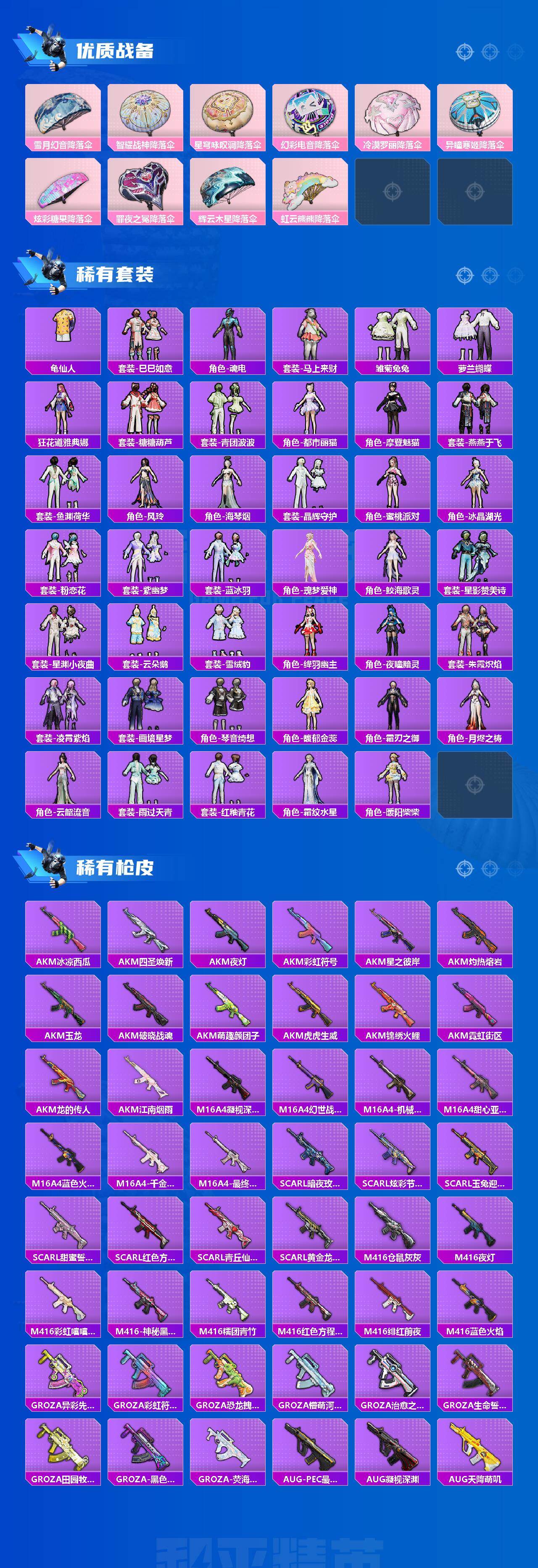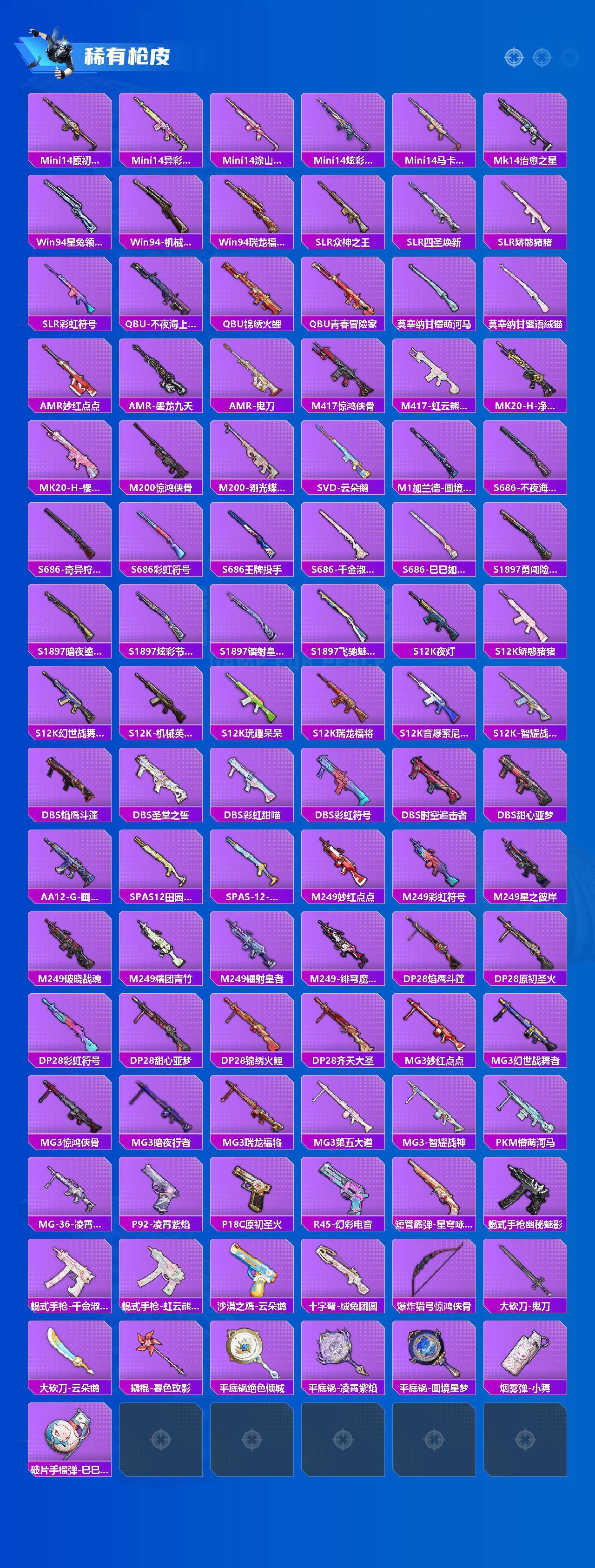 【粉色枪皮】:AKM-绿萝繁花,SCAR-L-锦绣绵绵,M416-心之恋语,M416-电玩时刻,GROZA-镜光银凌,AUG-罪夜之冕,蜜獾-异瞳寒姬,ACE32-萌骑漫游,AKS-74U-森灵之息,Kar98K-巳巳如意,Mk14-甜梦熊击,Mk14-辉云木星,Mk14-福马献瑞,DP-28-千金淑猫,DP-28-豹影疾电,PKM-江南烟雨,MG-36-沧焰双生