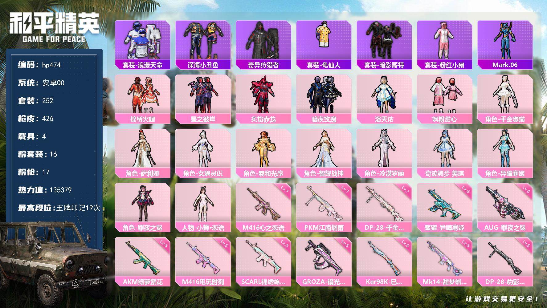 [17189567]安卓 手Q-16粉装-17特效枪-4载具-13粉色飞行器-135379热力值-19王牌印记-252套装-426枪皮