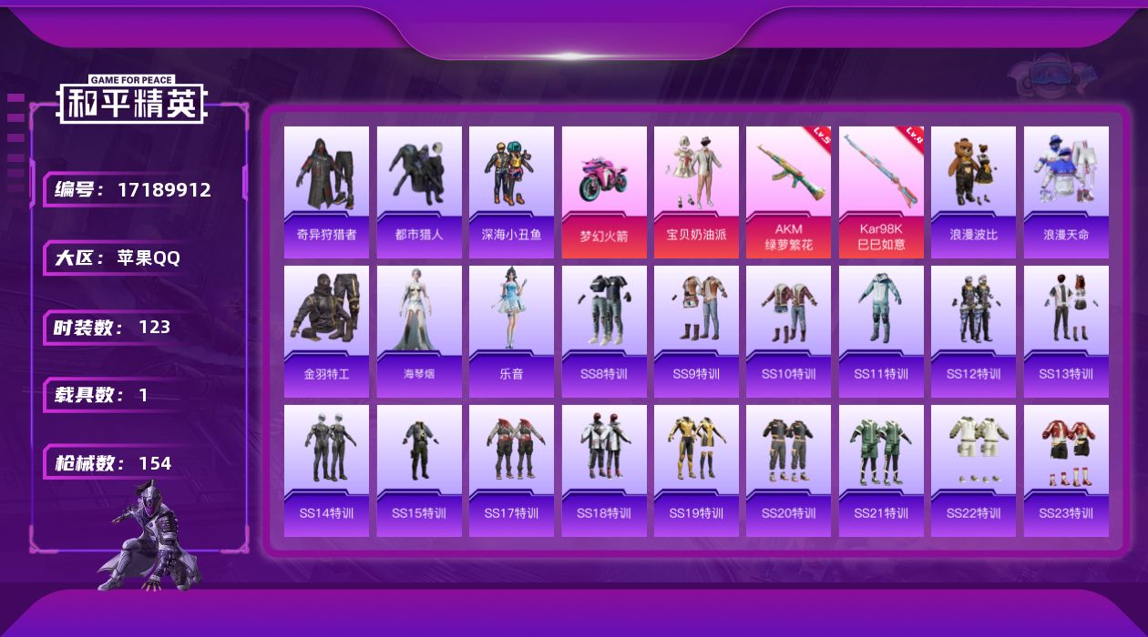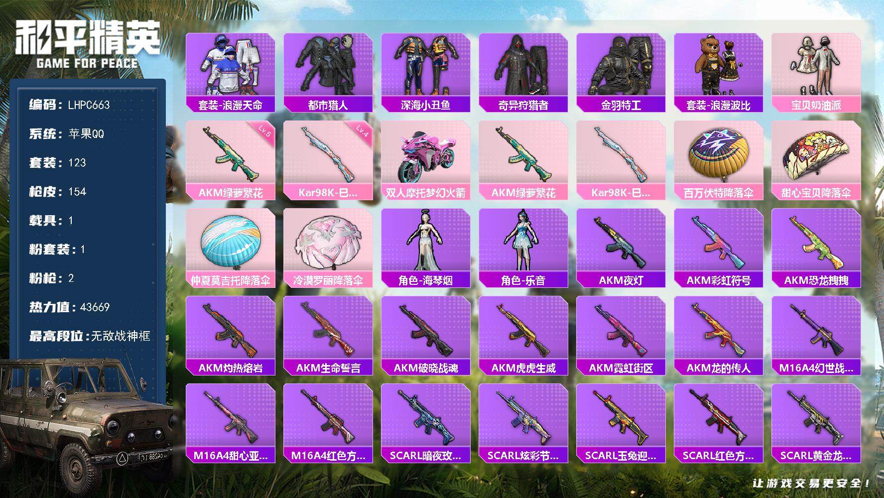 [17189912]可二次【特价出售/店主推荐 战神框】苹果 手Q-无敌战神框-1粉装-2特效枪-1载具-0粉色飞行器-43669热力值-16王牌印记-123套装-154枪皮 【热门品类】:套装-浪漫天命,套装-都市猎人,套装-深海小丑鱼,套装-奇异狩猎者,套装-金羽特工,套装-浪漫波比 【粉色套装】:粉装-宝贝奶油派 【粉色枪皮等级】:AKM-绿萝繁花(五级),Kar98K-巳巳如意(四级) 【粉色载具】:双人摩托-梦幻火箭 【粉色枪皮】:AKM-绿萝繁花,Kar98K-巳巳如意 【粉色降落伞】:百万伏特降落伞,甜心宝贝降落伞,仲夏莫吉托降落伞,冷漠罗丽降落伞 【稀有套装】:角色-海琴烟,角色-乐音 【稀有枪皮】:AKM-夜灯,AKM-彩虹符号,AKM-恐龙拽拽,AKM-灼热熔岩,AKM-生命誓言,AKM-破晓战魂,AKM-虎虎生威,AKM-霓虹街区,AKM-龙的传人,M16A4-幻世战舞者,M16A4-甜心亚梦,M16A4-红色方程式,SCAR-L-暗夜玫瑰,SCAR-L-炫彩节奏,SCAR-L-玉兔迎春,SCAR-L-红色方程式,SCAR-L-黄金龙骨,M416-夜灯,M416-糯团青竹,M416-紫翼圣骑,M416-红色方程式,M416-蓝色火焰,GROZA-异彩先驱,GROZA-生命誓言,GROZA-紫翼圣骑,AUG-耀粉歌者,QBZ-彩虹符号,QBZ-飞驰魅影,M762-天降萌叽,M762-牛气冲天,M762-瑞龙福将,M762-镭射皇者,G36C-暗夜玫瑰,AC-VAL-天降萌叽,AC-VAL-甜心亚梦,蜜獾-天降萌叽,蜜獾-娇憨猪猪,UZI-众神之王,UZI-天降萌叽,UZI-娇憨猪猪,UZI-幻影战神,UZI-炫彩节奏,UZI-红色方程式,UMP45-夜灯,UMP45-快乐主宰,UMP45-生命誓言,Vector-彩虹符号,Vector-生命誓言,汤姆逊-天降萌叽,汤姆逊-异彩先驱,汤姆逊-环太平洋,汤姆逊-耀粉歌者,MP5K-众神之王,MP5K-异彩先驱,P90-飞驰魅影,Kar98K-炫彩节奏,Kar98K-王子的夏天,Kar98K-红色方程式,Kar98K-飞驰魅影,M24-炫彩节奏,M24-众神之王,SKS-糯团青竹,VSS-镭射皇者,Mini14-异彩先驱,Mini14-炫彩节奏,Mini14-金鼠迎春,Win94-瑞龙福将,SLR-众神之王,SLR-娇憨