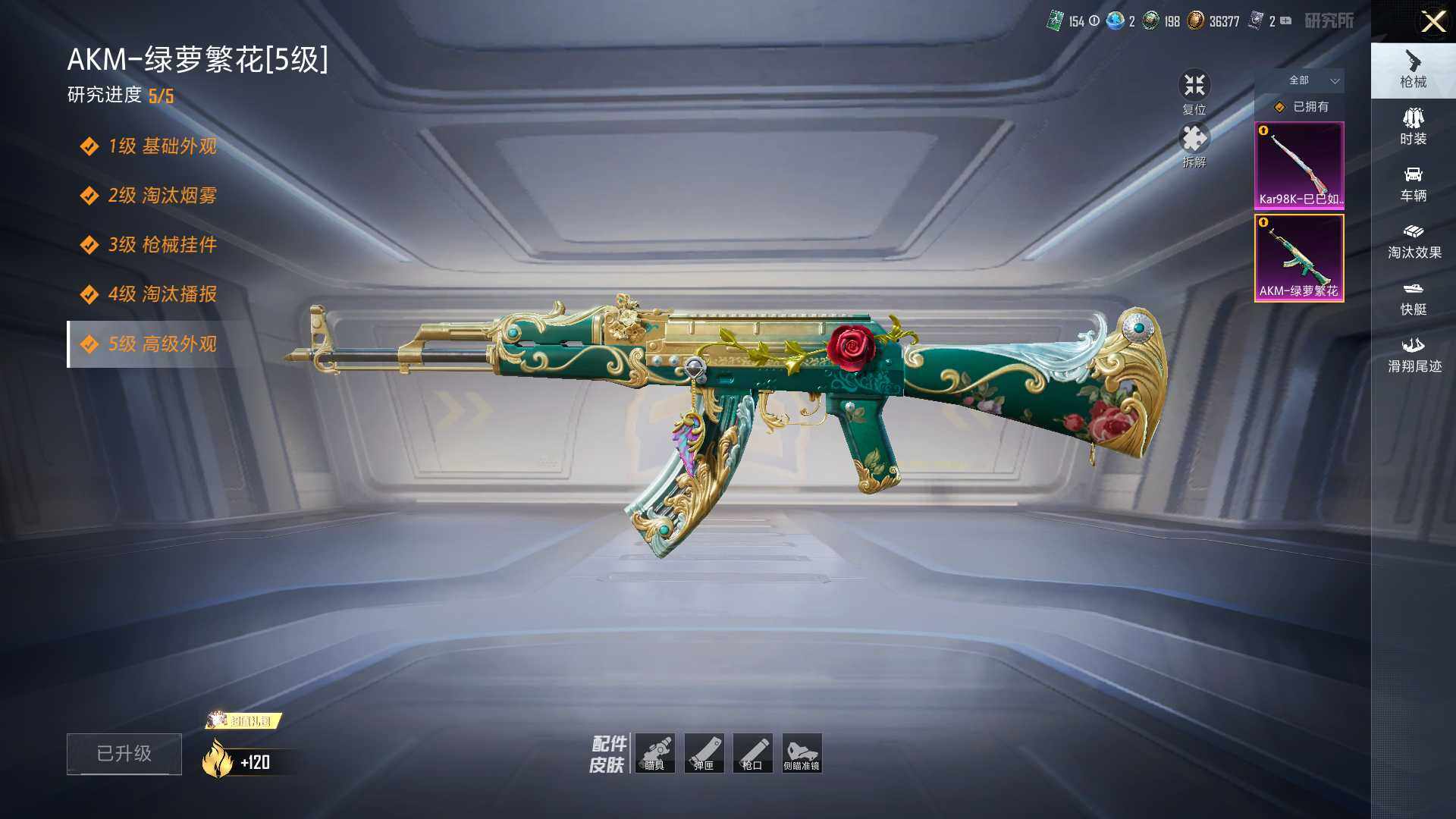 【粉色枪皮等级】:AKM-绿萝繁花(五级),Kar98K-巳巳如意(四级)