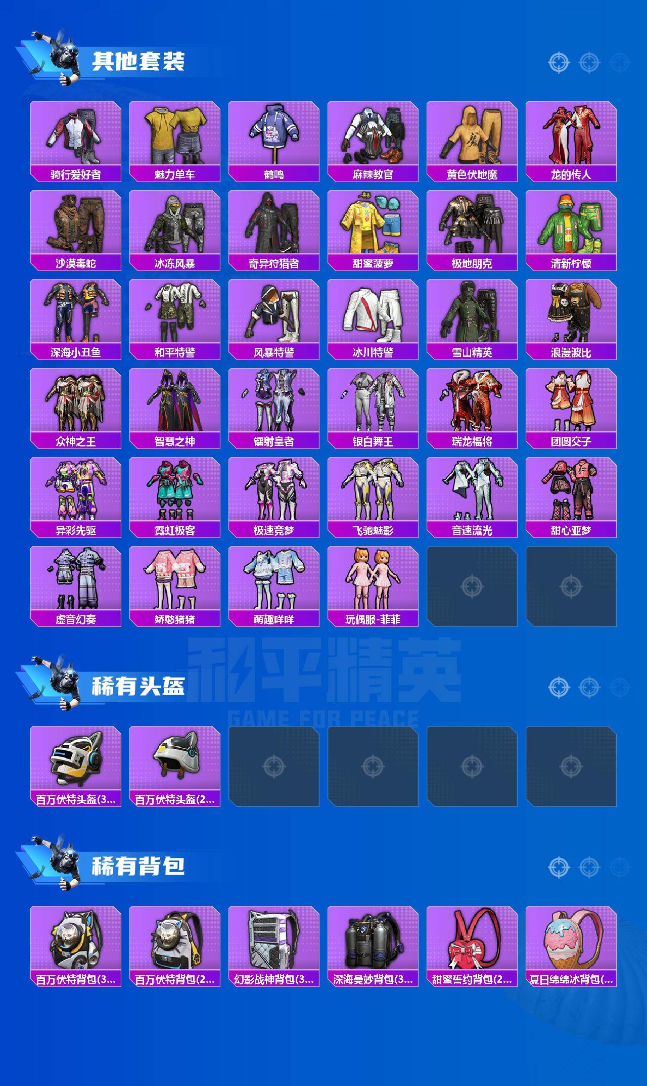 【稀有枪皮】:AKM-夜灯,AKM-彩虹符号,AKM-恐龙拽拽,AKM-灼热熔岩,AKM-生命誓言,AKM-破晓战魂,AKM-虎虎生威,AKM-霓虹街区,AKM-龙的传人,M16A4-幻世战舞者,M16A4-甜心亚梦,M16A4-红色方程式,SCAR-L-暗夜玫瑰,SCAR-L-炫彩节奏,SCAR-L-玉兔迎春,SCAR-L-红色方程式,SCAR-L-黄金龙骨,M416-夜灯,M416-糯团青竹,M416-紫翼圣骑,M416-红色方程式,M416-蓝色火焰,GROZA-异彩先驱,GROZA-生命誓言,GROZA-紫翼圣骑,AUG-耀粉歌者,QBZ-彩虹符号,QBZ-飞驰魅影,M762-天降萌叽,M762-牛气冲天,M762-瑞龙福将,M762-镭射皇者,G36C-暗夜玫瑰,AC-VAL-天降萌叽,AC-VAL-甜心亚梦,蜜獾-天降萌叽,蜜獾-娇憨猪猪,UZI-众神之王,UZI-天降萌叽,UZI-娇憨猪猪,UZI-幻影战神,UZI-炫彩节奏,UZI-红色方程式,UMP45-夜灯,UMP45-快乐主宰,UMP45-生命誓言,Vector-彩虹符号,Vector-生命誓言,汤姆逊-天降萌叽,汤姆逊-异彩先驱,汤姆逊-环太平洋,汤姆逊-耀粉歌者,MP5K-众神之王,MP5K-异彩先驱,P90-飞驰魅影,Kar98K-炫彩节奏,Kar98K-王子的夏天,Kar98K-红色方程式,Kar98K-飞驰魅影,M24-炫彩节奏,M24-众神之王,SKS-糯团青竹,VSS-镭射皇者,Mini14-异彩先驱,Mini14-炫彩节奏,Mini14-金鼠迎春,Win94-瑞龙福将,SLR-众神之王,SLR-娇憨
