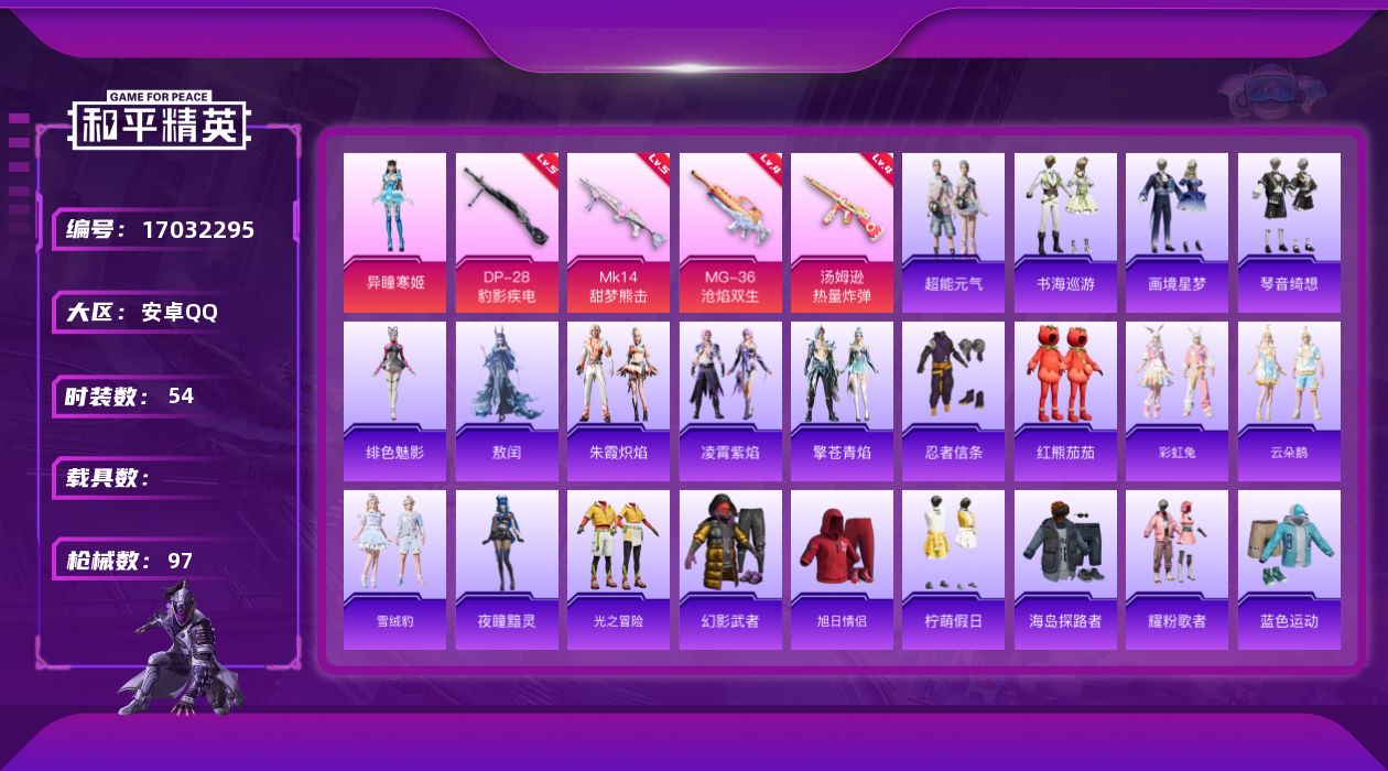 [17032295]安卓 手Q-1粉装-7特效枪-0载具-1粉色飞行器-24161热力值-5王牌印记-54套装-97枪皮