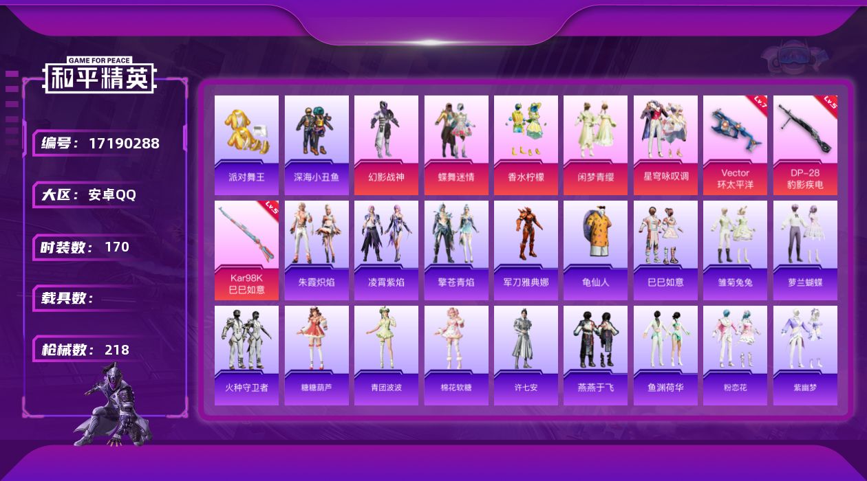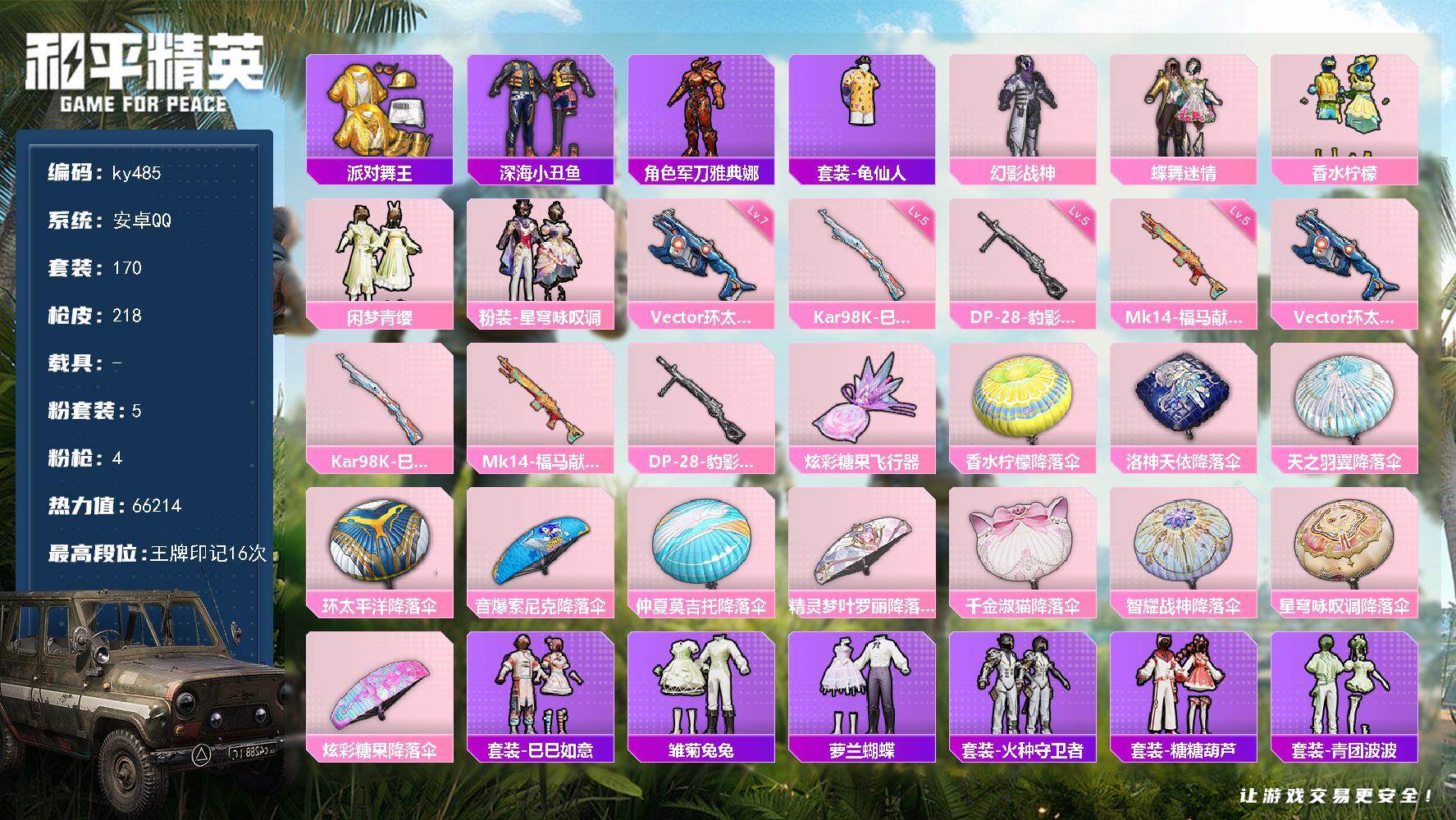 [17190288]安卓 手Q-5粉装-4特效枪-0载具-1粉色飞行器-66214热力值-16王牌印记-170套装-218枪皮 【热门品类】:套装-派对舞王,套装-深海小丑鱼,角色-军刀雅典娜,套装-龟仙人 【粉色套装】:粉装-幻影战神,粉装-蝶舞迷情,粉装-香水柠檬,粉装-闲梦青缨,粉装-星穹咏叹调 【粉色枪皮等级】:Vector-环太平洋(七级),Kar98K-巳巳如意(五级),Mk14-福马献瑞(五级),DP-28-豹影疾电(五级) 【粉色枪皮】:Vector-环太平洋,Kar98K-巳巳如意,Mk14-福马献瑞,DP-28-豹影疾电 【粉色飞行器】:炫彩糖果飞行器 【粉色降落伞】:香水柠檬降落伞,洛神天依降落伞,天之羽翼降落伞,环太平洋降落伞,音爆索尼克降落伞,仲夏莫吉托降落伞,精灵梦叶罗丽降落伞,千金淑猫降落伞,智耀战神降落伞,星穹咏叹调降落伞,炫彩糖果降落伞 【稀有套装】:套装-龟仙人,套装-巳巳如意,套装-雪国风尚,套装-炫彩糖果,套装-雏菊兔兔,套装-萝兰蝴蝶,套装-火种守卫者,套装-糖糖葫芦,套装-青团波波,套装-棉花软糖,角色-许七安,套装-燕燕于飞,套装-鱼渊荷华,套装-粉恋花,套装-紫幽梦,套装-蓝冰羽,角色-瑰梦爱神,套装-星渊小夜曲,套装-朱霞炽焰,套装-凌霄紫焰,套装-擎苍青焰 【稀有枪皮】:AUG-冰晶雪宝,AKM-夜灯,AKM-彩虹符号,AKM-环太平洋,AKM-破晓战魂,AKM-龙的传人,M16A4-夜灯,M16A4-幻世战舞者,M16A4-红色方程式,M16A4-蓝色火焰,SCAR-L-夜灯,SCAR-L-炫彩节奏,SCAR-L-玉兔迎春,SCAR-L-红色方程式,M416-糯团青竹,M416-红色方程式,M416-蓝色火焰,GROZA-彩虹符号,GROZA-恐龙拽拽,GROZA-懵萌河马,GROZA-治愈之星,GROZA-田园牧歌,AUG-天降萌叽,AUG-耀粉歌者,QBZ-彩虹符号,M762-天降萌叽,M762-彩虹符号,M762-暗夜鎏金,M762-登顶巅峰,Mk47-洛神天依,G36C-懵萌河马,AC-VAL-天降萌叽,AC-VAL-彩虹甜喵,AC-VAL-快闪甜心,蜜獾-千面幻镜,蜜獾-天降萌叽,ARX-凌霄紫焰,UZI-天降萌叽,UZI-影袭,UZI-红色方程式,UZI-月影灵韵,UMP45-夜灯,UMP45-涂山之恋,UMP45-生
