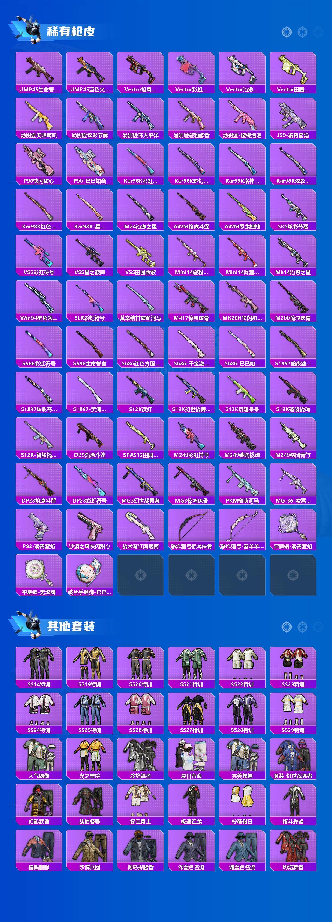 【稀有枪皮】:AUG-冰晶雪宝,AKM-夜灯,AKM-彩虹符号,AKM-环太平洋,AKM-破晓战魂,AKM-龙的传人,M16A4-夜灯,M16A4-幻世战舞者,M16A4-红色方程式,M16A4-蓝色火焰,SCAR-L-夜灯,SCAR-L-炫彩节奏,SCAR-L-玉兔迎春,SCAR-L-红色方程式,M416-糯团青竹,M416-红色方程式,M416-蓝色火焰,GROZA-彩虹符号,GROZA-恐龙拽拽,GROZA-懵萌河马,GROZA-治愈之星,GROZA-田园牧歌,AUG-天降萌叽,AUG-耀粉歌者,QBZ-彩虹符号,M762-天降萌叽,M762-彩虹符号,M762-暗夜鎏金,M762-登顶巅峰,Mk47-洛神天依,G36C-懵萌河马,AC-VAL-天降萌叽,AC-VAL-彩虹甜喵,AC-VAL-快闪甜心,蜜獾-千面幻镜,蜜獾-天降萌叽,ARX-凌霄紫焰,UZI-天降萌叽,UZI-影袭,UZI-红色方程式,UZI-月影灵韵,UMP45-夜灯,UMP45-涂山之恋,UMP45-生