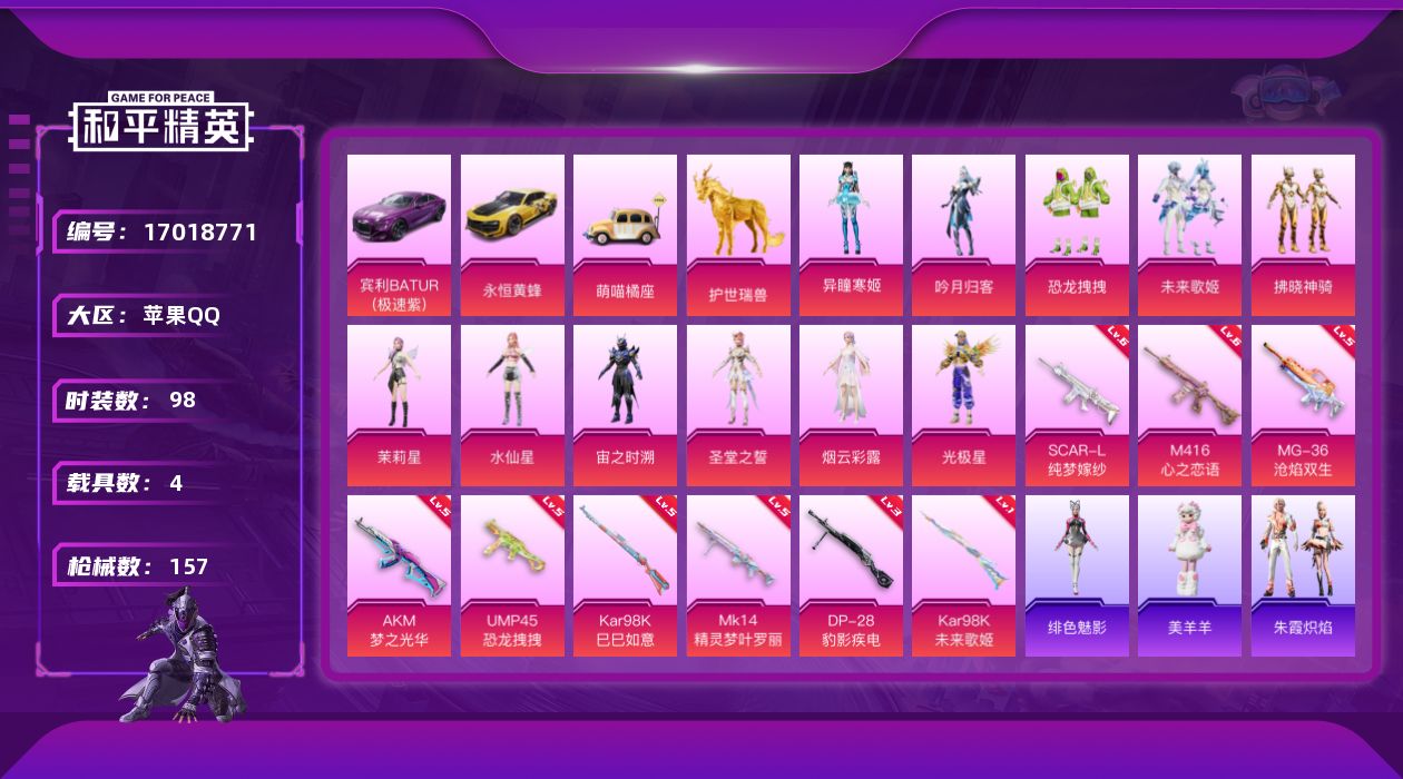 [17018771]苹果 手Q-11粉装-9特效枪-4载具-6粉色飞行器-55697热力值-6王牌印记-98套装-157枪皮 【热门品类】:套装-龟仙人 【粉色套装】:粉装-吟月归客,粉装-恐龙拽拽,粉装-未来歌姬,粉装-拂晓神骑,角色-茉莉星,角色-水仙星,角色-宙之时溯,角色-圣堂之誓,角色-烟云彩露,角色-光极星,角色-异瞳寒姬 【粉色枪皮等级】:AKM-梦之光华(五级),SCAR-L-纯梦嫁纱(六级),M416-心之恋语(六级),UMP45-恐龙拽拽(五级),Kar98K-未来歌姬(一级),Kar98K-巳巳如意(五级),Mk14-精灵梦叶罗丽(五级),DP-28-豹影疾电(三级),MG-36-沧焰双生(五级) 【粉色载具】:宾利BATUR(极速紫),永恒黄蜂,萌喵橘座,护世瑞兽 【粉色枪皮】:AKM-梦之光华,SCAR-L-纯梦嫁纱,M416-心之恋语,UMP45-恐龙拽拽,Kar98K-未来歌姬,Kar98K-巳巳如意,Mk14-精灵梦叶罗丽,DP-28-豹影疾电,MG-36-沧焰双生 【粉色飞行器】:炫彩糖果飞行器,拂晓神骑飞行器,镜域双华-灵镜之阶,深渊漩涡飞行器,万象金身飞行器 【粉色降落伞】:恐龙拽拽降落伞,千面幻镜降落伞,第五大道降落伞,未来歌姬降落伞,变形金刚降落伞,拂晓神骑降落伞,萌物绒绒降落伞,炫光之旅降落伞,圣堂之誓降落伞,江南烟雨降落伞,精灵梦叶罗丽降落伞,墨龙九天降落伞,临安公主降落伞,金蛇镇世降落伞,异瞳寒姬降落伞,炫彩糖果降落伞 【稀有套装】:套装-龟仙人,套装-巳巳如意,套装-炫彩糖果,角色-光矢逐梦,套装-燕燕于飞,套装-鱼渊荷华,套装-朱霞炽焰,套装-凌霄紫焰,玩偶服-美羊羊,角色-绯色魅影,角色-霜刃之御 【稀有枪皮】:AUG-冰晶雪宝,AKM-恐龙拽拽,AKM-星之彼岸,AKM-龙的传人,SCAR-L-是爱神辣,M416-夜灯,M416-糯团青竹,GROZA-恐龙拽拽,GROZA-酷泡奶龙,AUG-金蛇镇世,AUG-月影灵韵,QBZ-未来歌姬,M762-天降萌叽,M762-第五大道,M762-绒雪飘舞,AC-VAL-天降萌叽,AC-VAL-快闪甜心,AC-VAL-闲梦青缨,蜜獾-天降萌叽,Famas-墨龙九天,ARX-凌霄紫焰,UZI-啾咪啾咪,UZI-天降萌叽,UZI-月影灵韵,UMP45-炫光之旅,UMP45-猪猪侠,Vector-
