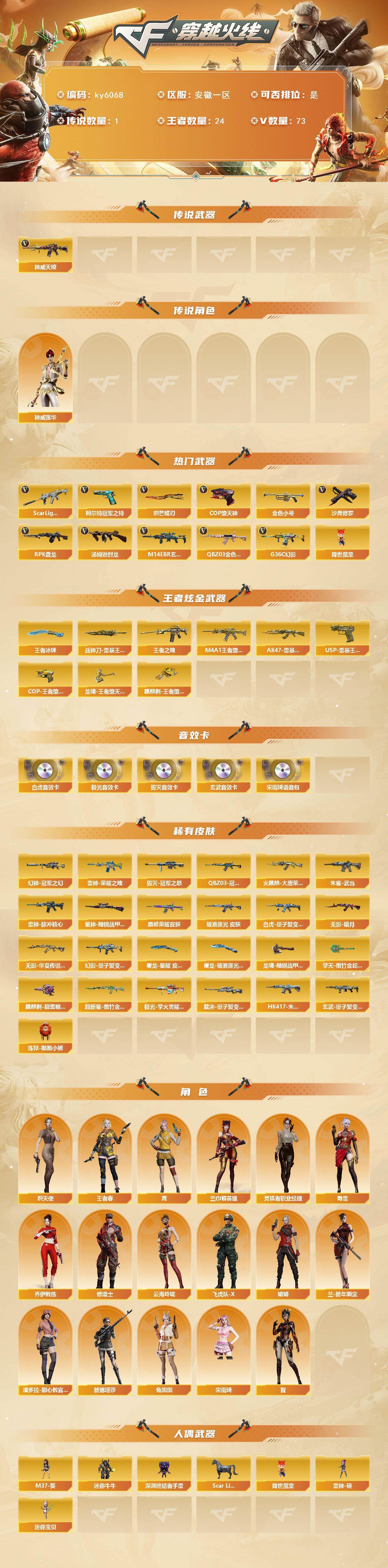 [17190325]安徽一区-79V-24王者武器数-0炫金武器数 【传说武器】:神威天绫 【传说角色】:神威莲华 【热门武器】:G36C-幻影,QBZ03-金色蔷薇,M14EBR-玄武,Scar Light-白虎,柯尔特-冠军之特,金色小号,汤姆逊-烈龙*6,RPK-盘龙*4,降世魔童,COP-堕天神,沙鹰-修罗,炽芒蝶刃*3 【王者炫金武器】:王者之魄,AK47-雷暴王者,M4A1-王者堕天神,USP-雷暴王者,COP-王者堕天神*2,斩神刀-雷暴王者,龙啸-王者堕天神,麒麟刺-王者堕天神,王者冰锋 【音效卡】:Barrett-毁灭音效卡,Barrett-极光音效卡,Scar Light-白虎音效卡,宋雨琦语音包,M14EBR-玄武音效卡 【皮肤】:幻神-冠军之幻,白虎-量子聚变 皮肤,QBZ03-冠军之薇,QBZ03-巅峰荣耀皮肤,金色蔷薇-破浪逐光 皮肤,裁决-量子聚变 皮肤,星神-黯钢战甲 皮肤,雷神-荣耀之魄,雷神-脉冲核心,火麒麟-大唐荣光,毁灭-冠军之怒,无影-暗月,无影-华夏传说 皮肤,超新星-傲竹金蛇 皮肤,HK417-朱雀-武当,HK417-朱雀-量子聚变 皮肤,幻影-量子聚变 皮肤,玄武-量子聚变 皮肤,极光-掌火灵耀 皮肤,炼狱-酷酷小狮,屠龙-星耀 皮肤,屠龙-破浪逐光 皮肤,龙啸-黯钢战甲 皮肤,擎天-傲竹金蛇 皮肤,麒麟刺-甜蜜糖果 皮肤 【角色】:鹰,兰-巾帼英雄,智,王者春,乔伊教练,修道士,云海玲珑,宋雨琦,炽天使,飞虎队-X,娟娟,兰-新年限定,灵狐者-职业经理,潘多拉-甜心教官,蜀雪,兔囡囡,新娜塔莎 【人偶武器】:迷你宝贝,Scar Light-马枪,M37-葵,迷你牛牛,深渊终结者手雷,雷神-研,降世魔童 【挑战大师】:AK47-冰龙粉碎者 【英雄级武器】:AK47-火麒麟,AK47-无影,AN94-超新星,Scar Light-白虎,M14EBR-玄武,QBZ03-天罚,M4A1-神工天巧,G36C-幻影,M4A1-玫瑰精灵,QBZ03-金色蔷薇,M4A1-猎神,9A91-烈火,加利尔ACE-天袭,Barrett-毁灭,Barrett-极光,AWM-裁决,Barrett-金色蔷薇,Kar98K-量子之心,RPK-盘龙*4,汤姆逊-烈龙*6,沙鹰-修罗,COP-堕天神,柯尔特-冠军之特,USP-神工天巧,Anaconda-量子之心,屠龙,