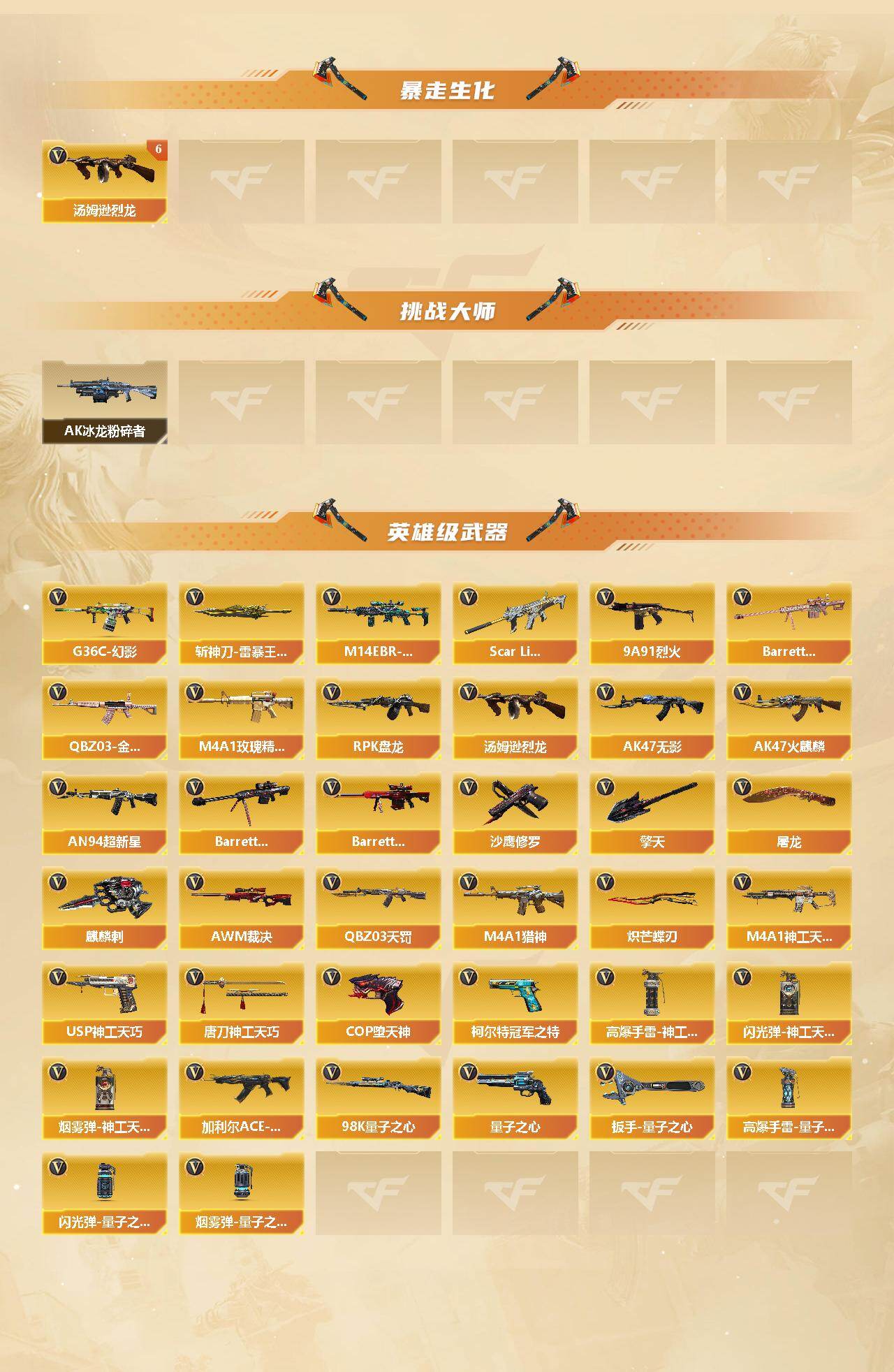 【英雄级武器】:AK47-火麒麟,AK47-无影,AN94-超新星,Scar Light-白虎,M14EBR-玄武,QBZ03-天罚,M4A1-神工天巧,G36C-幻影,M4A1-玫瑰精灵,QBZ03-金色蔷薇,M4A1-猎神,9A91-烈火,加利尔ACE-天袭,Barrett-毁灭,Barrett-极光,AWM-裁决,Barrett-金色蔷薇,Kar98K-量子之心,RPK-盘龙*4,汤姆逊-烈龙*6,沙鹰-修罗,COP-堕天神,柯尔特-冠军之特,USP-神工天巧,Anaconda-量子之心,屠龙,