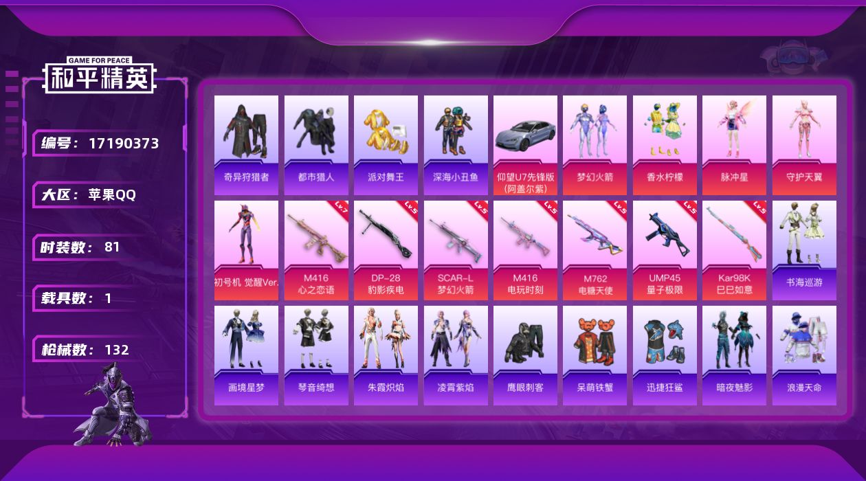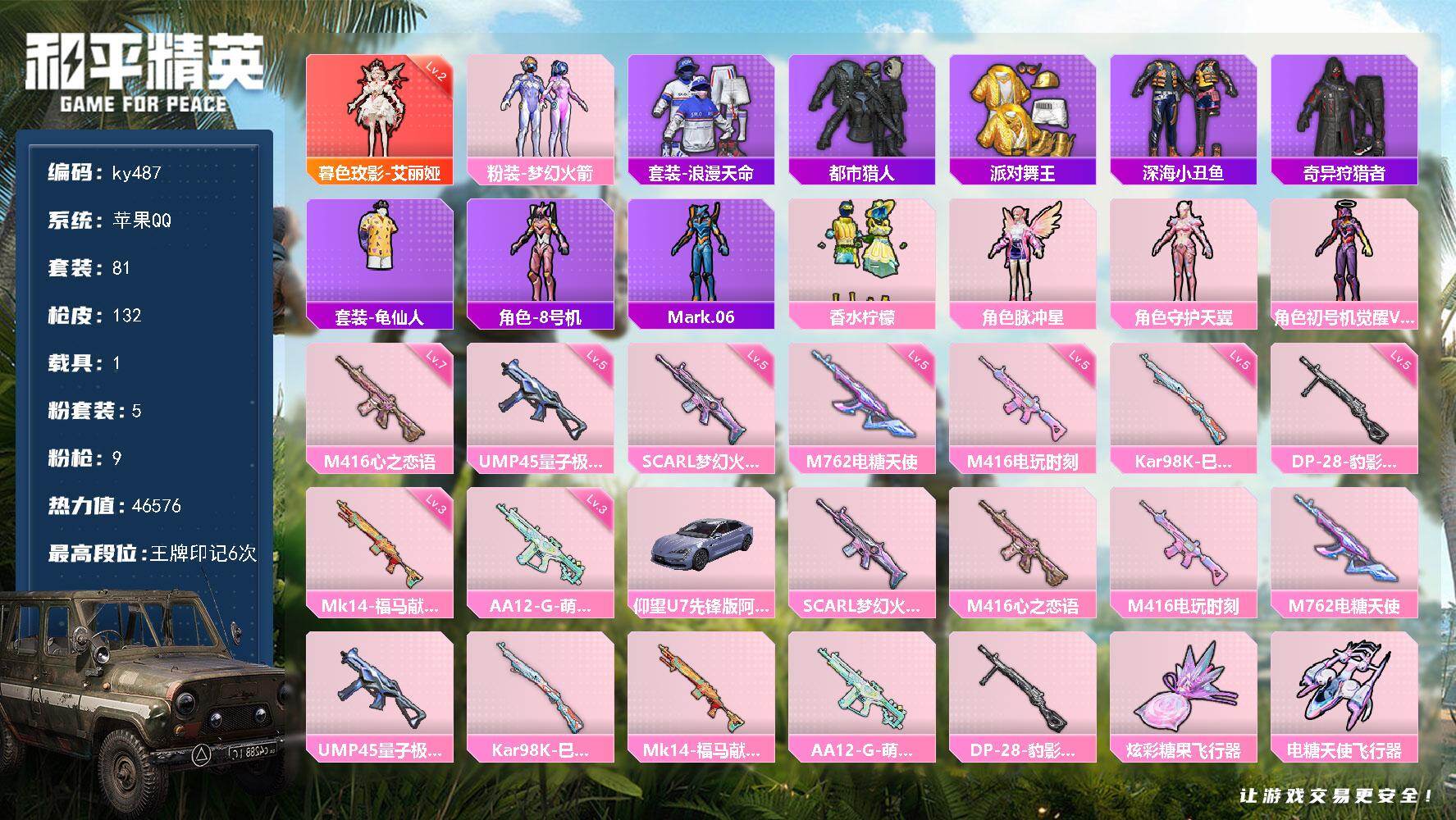 [17190373]苹果 手Q-1神装-5粉装-9特效枪-1载具-3粉色飞行器-46576热力值-6王牌印记-81套装-132枪皮