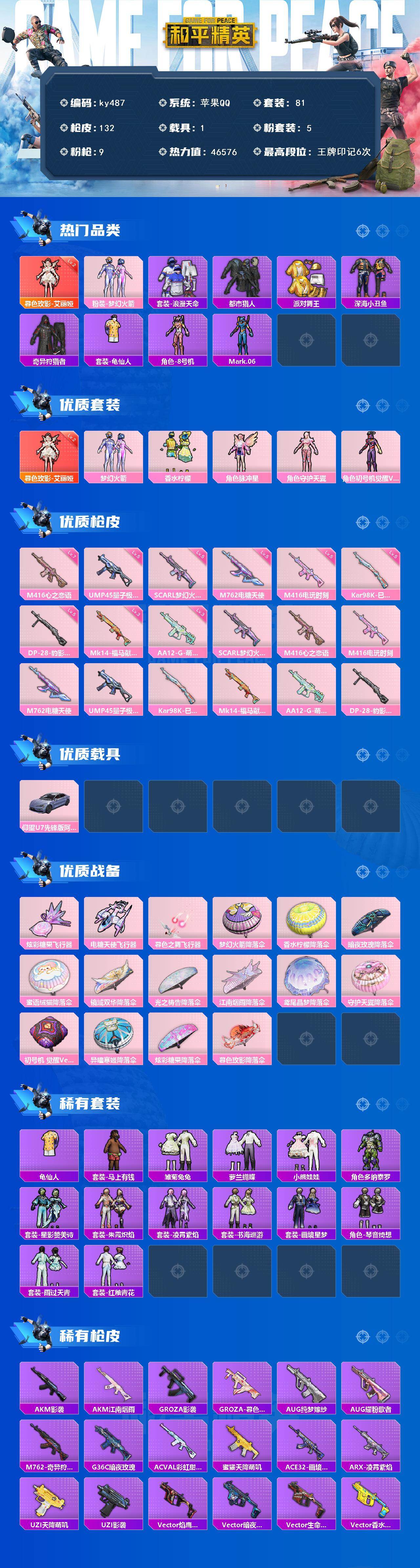 [17190373]苹果 手Q-1神装-5粉装-9特效枪-1载具-3粉色飞行器-46576热力值-6王牌印记-81套装-132枪皮 【红色神装等级】:暮色玫影-艾丽娅(二级) 【红色角色神装】:暮色玫影-艾丽娅 【热门品类】:粉装-梦幻火箭,套装-浪漫天命,套装-都市猎人,套装-派对舞王,套装-深海小丑鱼,套装-奇异狩猎者,套装-龟仙人,角色-8号机,角色-Mark.06 【粉色套装】:粉装-梦幻火箭,粉装-香水柠檬,角色-脉冲星,角色-守护天翼,角色-初号机 觉醒Ver. 【粉色枪皮等级】:SCAR-L-梦幻火箭(五级),M416-心之恋语(七级),M416-电玩时刻(五级),M762-电糖天使(五级),UMP45-量子极限(五级),Kar98K-巳巳如意(五级),Mk14-福马献瑞(三级),AA12-G-萌骑幻想(三级),DP-28-豹影疾电(五级) 【粉色载具】:仰望U7(阿盖尔紫) 【粉色枪皮】:SCAR-L-梦幻火箭,M416-心之恋语,M416-电玩时刻,M762-电糖天使,UMP45-量子极限,Kar98K-巳巳如意,Mk14-福马献瑞,AA12-G-萌骑幻想,DP-28-豹影疾电 【粉色飞行器】:炫彩糖果飞行器,电糖天使飞行器,暮色之舞飞行器 【粉色降落伞】:梦幻火箭降落伞,香水柠檬降落伞,暗夜玫瑰降落伞,蜜语绒猫降落伞,镜域双华降落伞,光之祷告降落伞,江南烟雨降落伞,鸢尾晶梦降落伞,守护天翼降落伞,初号机 觉醒Ver.降落伞,异瞳寒姬降落伞,炫彩糖果降落伞,暮色玫影降落伞 【稀有套装】:套装-龟仙人,套装-马上有钱,套装-雏菊兔兔,套装-萝兰蝴蝶,套装-小熊娃娃,角色-多纳泰罗,套装-星影赞美诗,套装-朱霞炽焰,套装-凌霄紫焰,套装-书海巡游,套装-画境星梦,套装-琴音绮想,套装-雨过天青,套装-红釉青花 【稀有枪皮】:AKM-影袭,AKM-江南烟雨,GROZA-影袭,GROZA-暮色玫影,AUG-纯梦嫁纱,AUG-耀粉歌者,M762-奇异狩猎者,G36C-暗夜玫瑰,AC-VAL-彩虹甜喵,蜜獾-天降萌叽,ACE32-画境星梦,ARX-凌霄紫焰,UZI-天降萌叽,UZI-影袭,Vector-焰鹰斗篷,Vector-暗夜玫瑰,Vector-生命誓言,Vector-香水柠檬,汤姆逊-天降萌叽,汤姆逊-奇异狩猎者,MP5K-画境星梦,JS9-凌霄紫焰,P90-闪光银龙,P