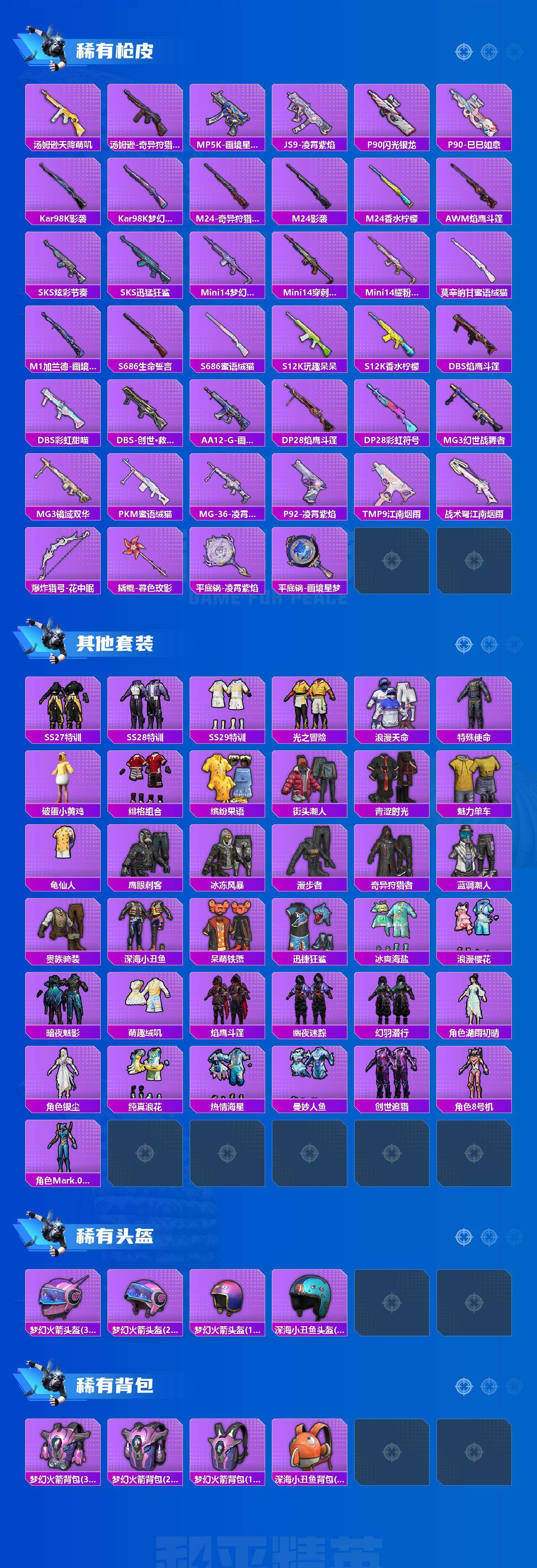 - [16754328]安卓 手Q-2神装-7粉装-15特效枪-4载具-9粉色飞行器-100229热力值-13王牌印记-193套装-274枪皮 【红色神装等级】:幽焰骑士-维塔(一级),沙丘之主-图卡盟(三级) 【红色角色神装】:幽焰骑士-维塔,沙丘之主-图卡盟 【热门品类】:粉装-梦幻火箭,套装-浪漫天命,套装-都市猎人,套装-冥河战士,套装-奇异狩猎者,套装-暗影哥特,套装-粉红小猪 【粉色套装】:粉装-数码大师,粉装-梦幻火箭,角色-洛天依,粉装-未来领航者,角色-荧海星豚,角色-绯穹魔姬,角色-星渊 【粉色枪皮等级】:AKM-幽焰骑士(三级),M416-心之恋语(七级),M416-灵猫魔法师(三级),GROZA-镜光银凌(五级),AUG-暖羊咩咩(五级),AUG-圣斗士星矢(五级),M762-青锋波束(五级),蜜獾-荧海星豚(二级),UMP45-量子极限(五级),汤姆逊-星月云朵(二级MK12-雪月幻音),AKS-74U-无垠阁(三级),Kar98K-巳巳如意(五级),DP-28-豹影疾电(五级),烟雾弹-电雾迷城(四级),破片手榴弹-热量炸弹(七级) 【粉色载具】:特斯拉Roadster(水滴蓝),兰博基尼URUS(明艳黄),迈凯伦570S(旭日黄),黑曜夜骑 【粉色枪皮】:AKM-幽焰骑士,M416-心之恋语,M416-灵猫魔法师,GROZA-镜光银凌,AUG-暖羊咩咩,AUG-圣斗士星矢,M762-青锋波束,蜜獾-荧海星豚,UMP45-量子极限,AKS-74U-无垠阁,Kar98K-巳巳如意,MK12-雪月幻音,DP-28-豹影疾电,烟雾弹-电雾迷城,破片手榴弹-热量炸弹 【粉色飞行器】:酣梦熊熊飞行器,梦幻火箭飞行器,梦之光华飞行器,星夜魔法师飞行翼,深渊漩涡飞行器,幽焰列车飞行器,终晖之翼飞行器,灵猫魔法师飞行器,飞天猪飞行器 【粉色降落伞】:梦幻火箭降落伞,四圣焕新降落伞,锦绣火鲤降落伞,荧光虫舞降落伞,王牌四分卫降落伞,烈焰拳霸降落伞,暗夜玫瑰降落伞,天之羽翼降落伞,筑梦精灵降落伞,炙焰牛王降落伞,太空嘟嘟降落伞,彩虹甜喵降落伞,沙丘之主降落伞,镜域双华降落伞,金丰海韵降落伞,宇宙意志降落伞,幽焰骑士降落伞,千金淑猫降落伞,临安公主降落伞,荧海星豚降落伞,灵猫魔法师降落伞,绯穹魔姬降落伞,无垠阁降落伞,异瞳寒姬降落伞 【稀有套装】:套装-巳巳如意,套装-雪国风尚,套