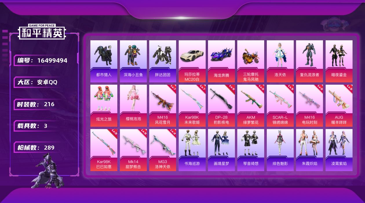 [16499494]安卓 手Q-5粉装-12特效枪-3载具-4粉色飞行器-89293热力值-19王牌印记-216套装-289枪皮