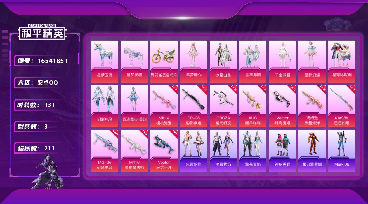 [16541851]安卓 手Q-8粉装-10特效枪-3载具-8粉色飞行器-67729热力值-5王牌印记-131套装-211枪皮
